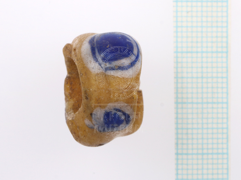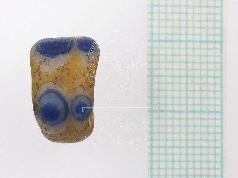 Válcovitý korálek ze žlutého opakního skla s modrobílými očky (3 x dvě očka nad sebou, 1 samostatné, celkem 7 oček).
