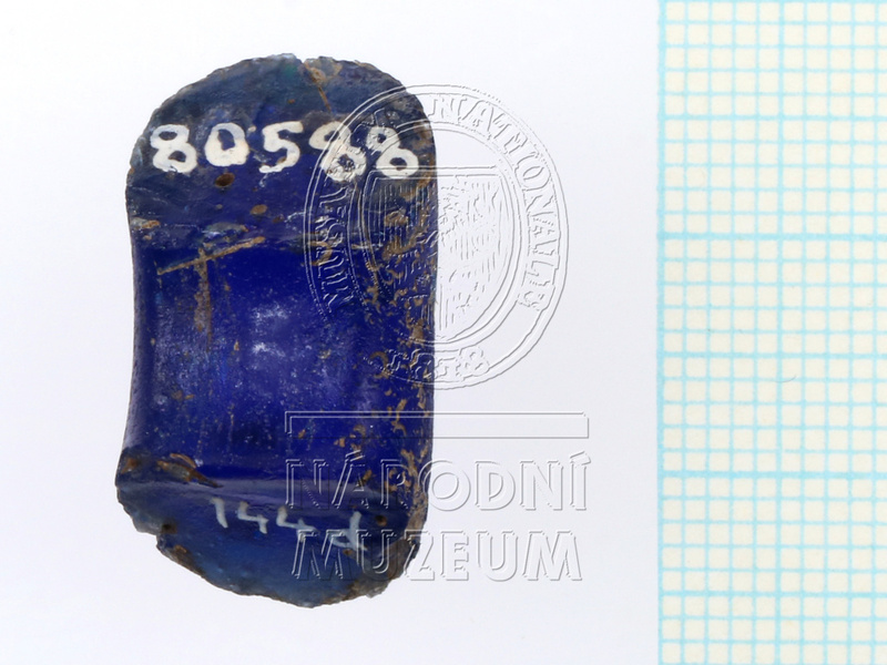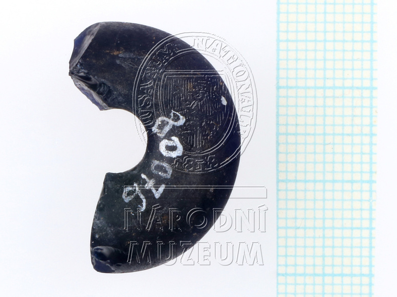 Část skleněného prsténcového korálu temně modré kobaltové barvy (téměř neprůsvitný), na povrchu skoro černé. ...více