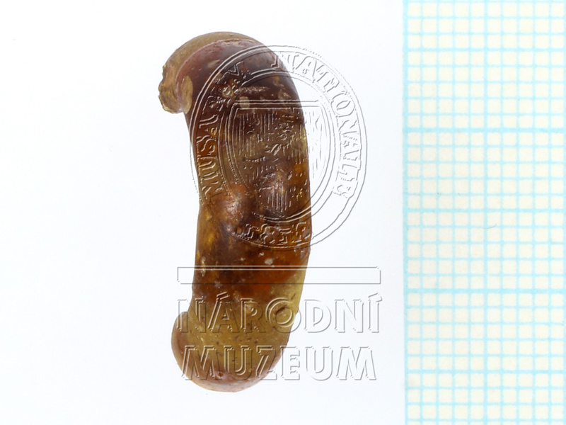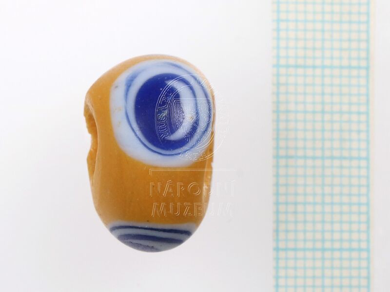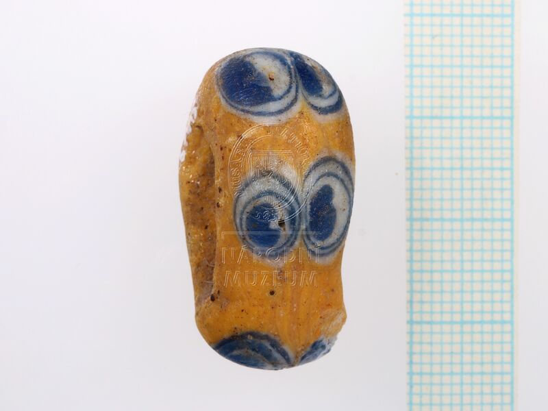 Deformovaný korálek, původně s válcovitým otvorem, ze žlutého opakního skla s průsvitnými modrobílými třikrát vrstvenými očky, sestavenými ve 4 skupinách po dvou. Žárem silně roztavený,… ...více