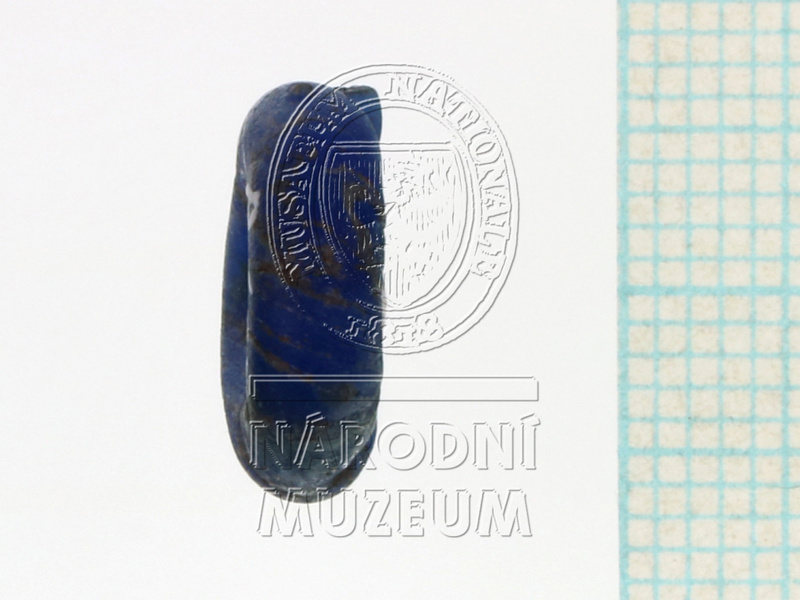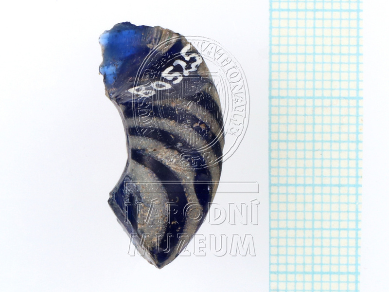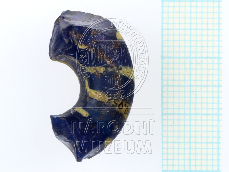 Zlomek skleněného prsténcového korálu temně kobaltově modré průsvitné barvy s příčně kladenými žlutými proužky o nestejné šířce. ...více