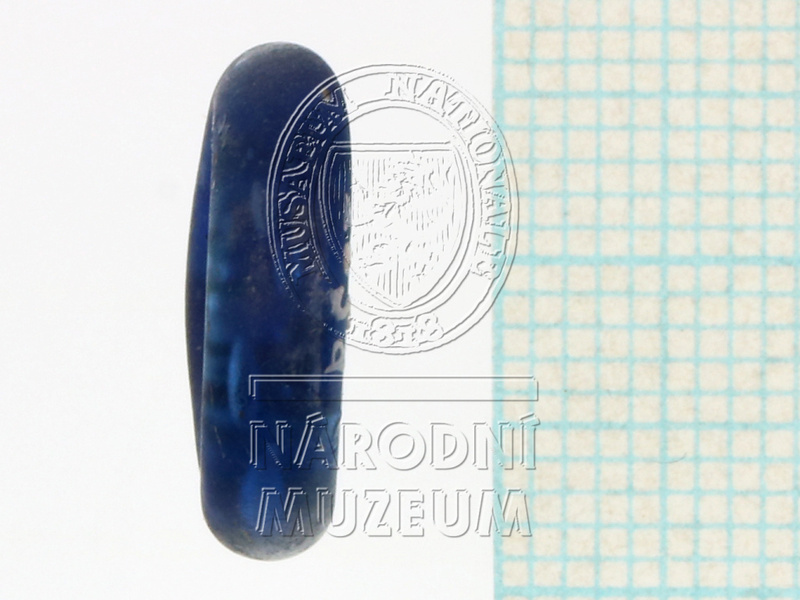 Část skleněného prsténcového korálu temně modré průsvitné barvy. ...více