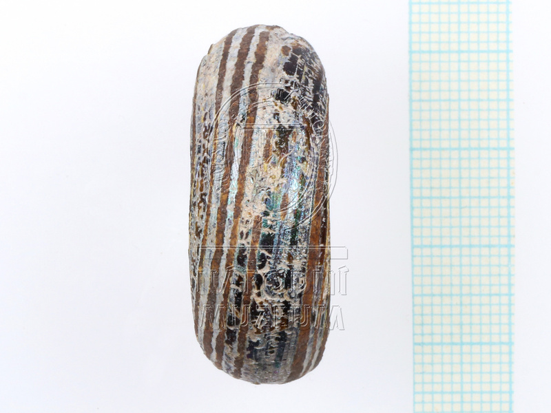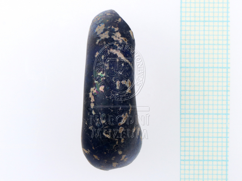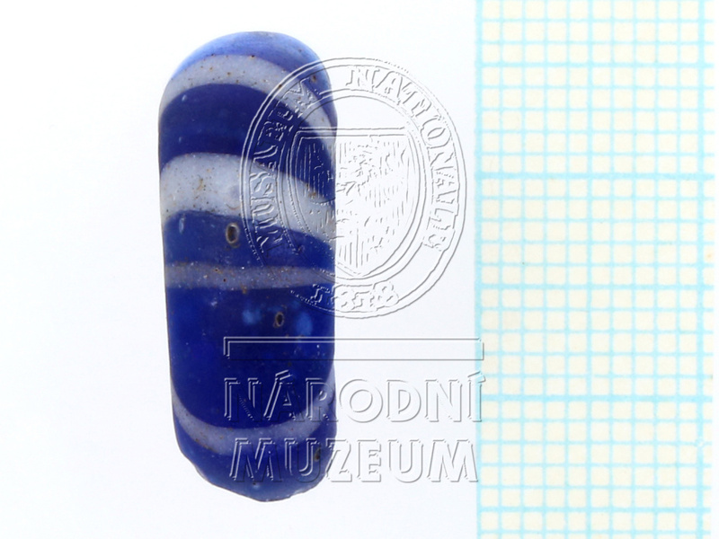 Část skleněného prsténcového korálu temně modré průsvitné barvy se šroubovitě kladenými bílými proužky různé šířky. ...více