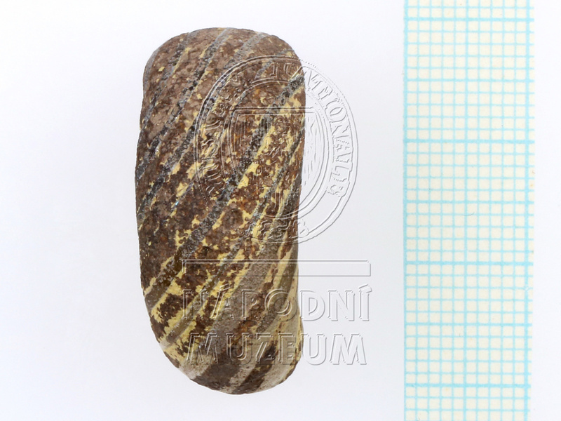 Část skleněného prsténcového korálu hnědofialové barvy různé průsvitnosti se žlutými šroubovitě vedenými proužky. ...více