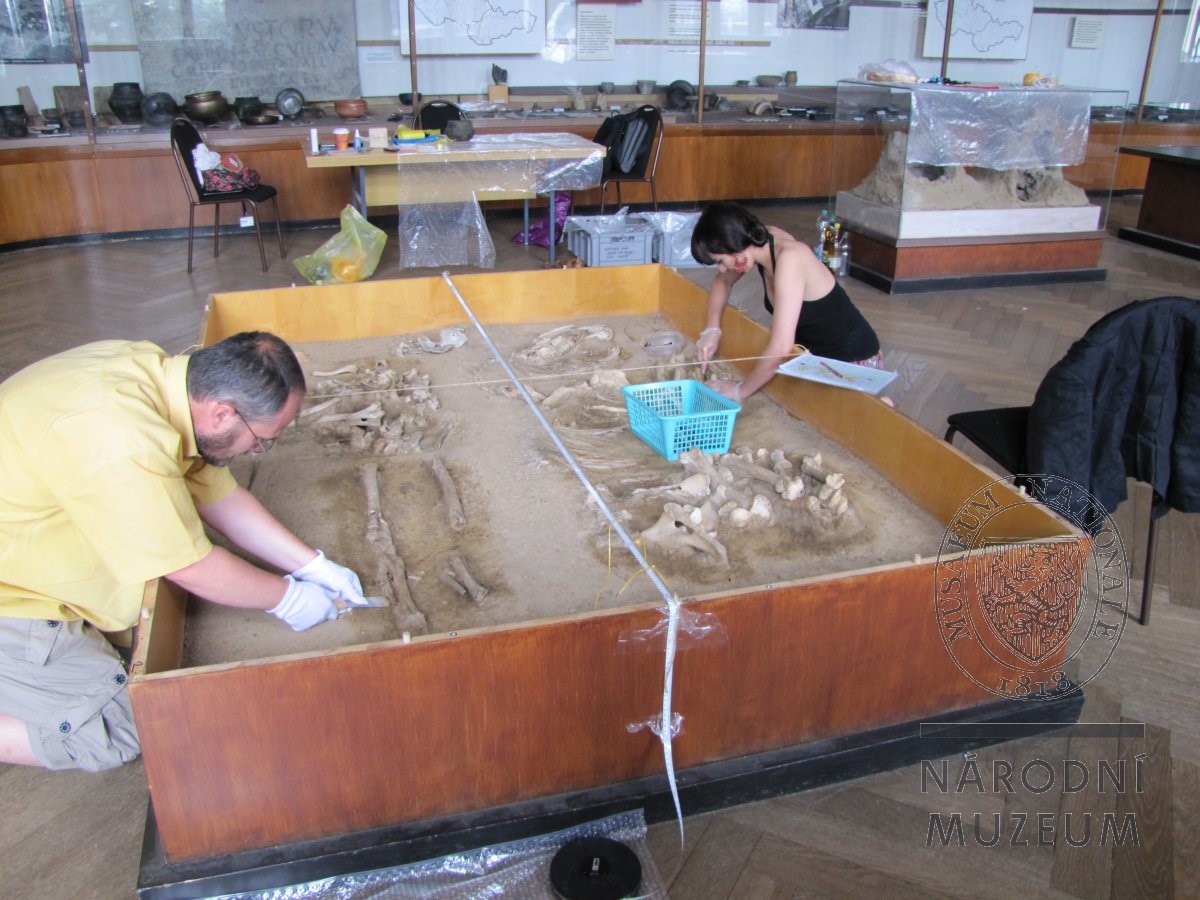 Rozebírání hrobu jezdce s koněm ze Záluží-Čelákovic.