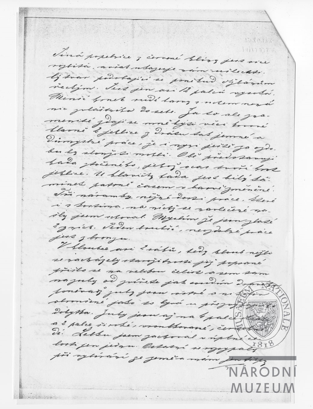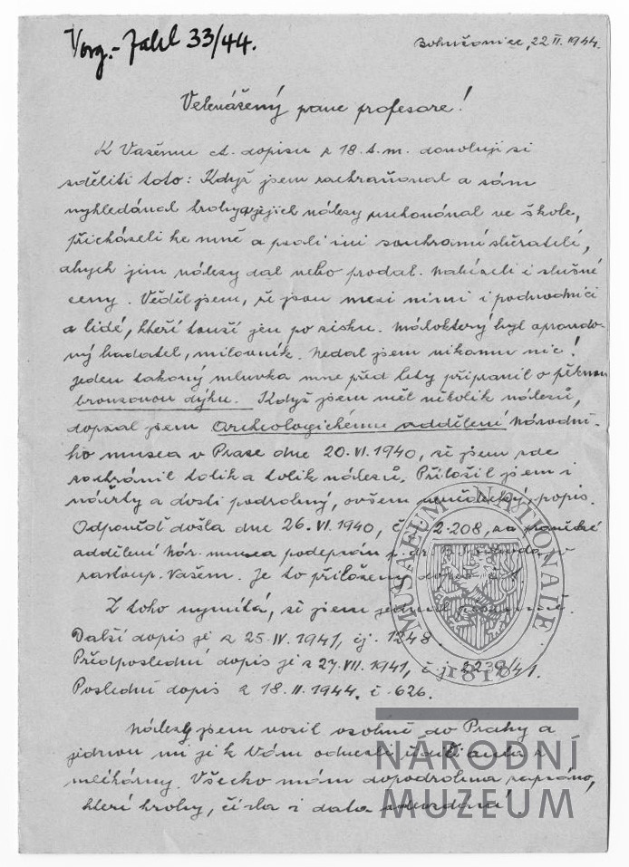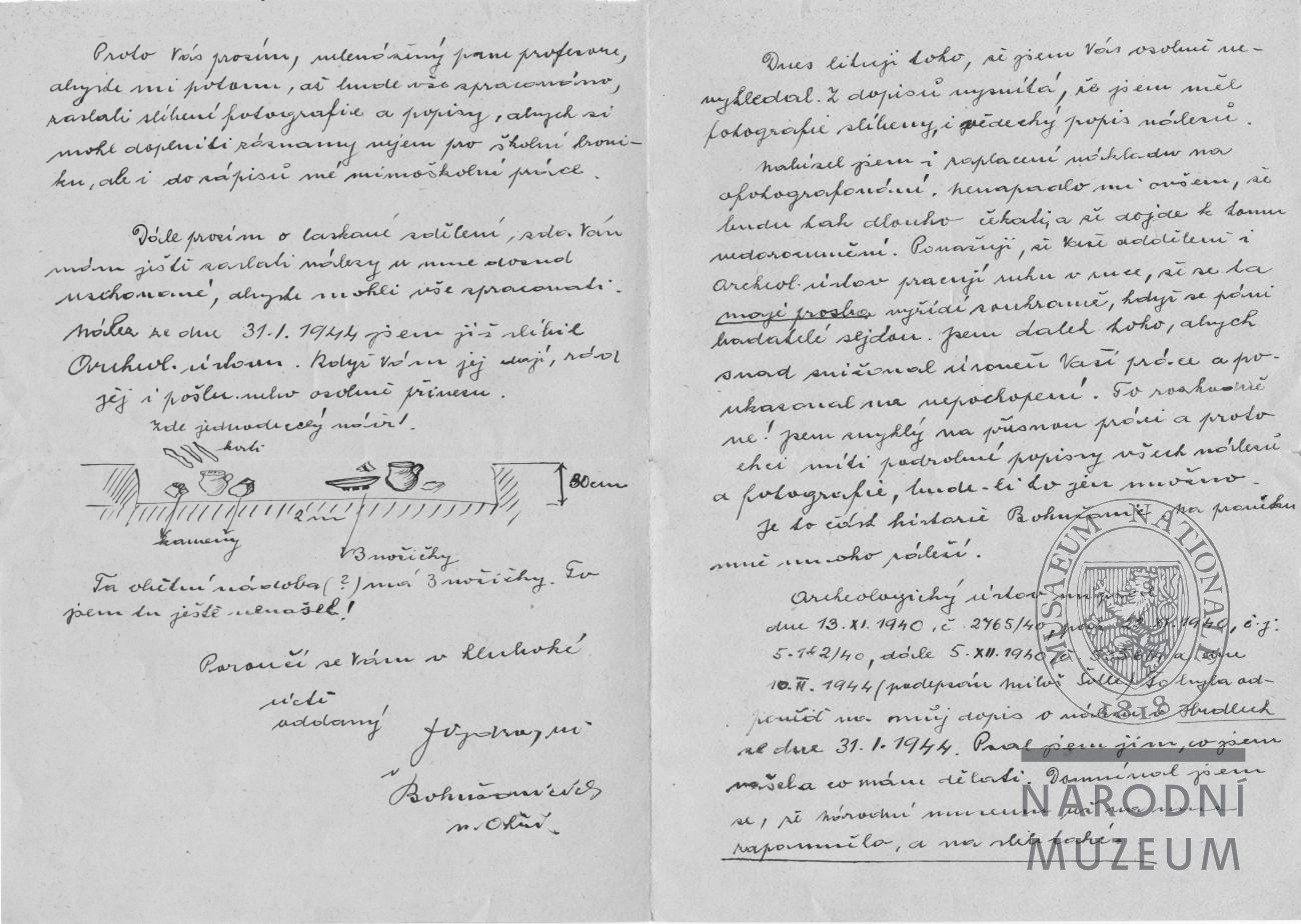 F. Vydra ve svém dopise z roku 1944 prosí Národní muzeum o zaslání fotografií a popisků k nálezům, které roku 1940 muzeu předal. Jednalo se o inventář popelnickových hrobů. Zároveň autor dopisu dodává, že pokud bude mít Národní muzeum zájem, je ochoten poslat i další předměty, které v Bohušovicích našel. K dopisu je přiložena i předešlá korespondence F. Vydry a Národního muzea.