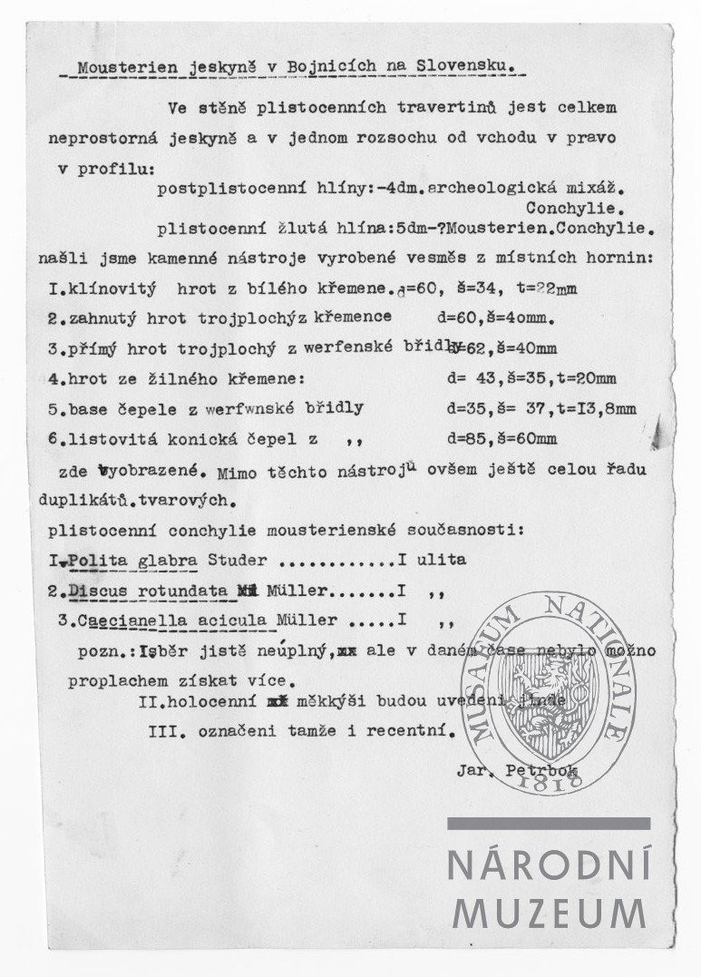 Nálezová zpráva pocházející z výzkumu paleolitické jeskyně v Bojnicích na Slovensku. V jeskyni byla nalezena kamenná industrie (hroty a čepele kamenných nástrojů), která je vyfocena v příloze nálezové zprávy.
