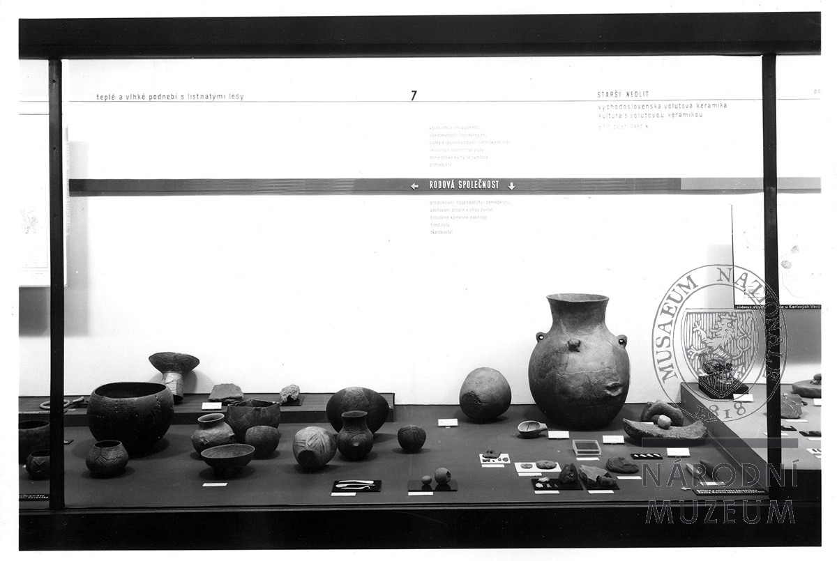 Expozice Pravěk československého území, sál 1, vitrína s nálezy ze staršího neolitu