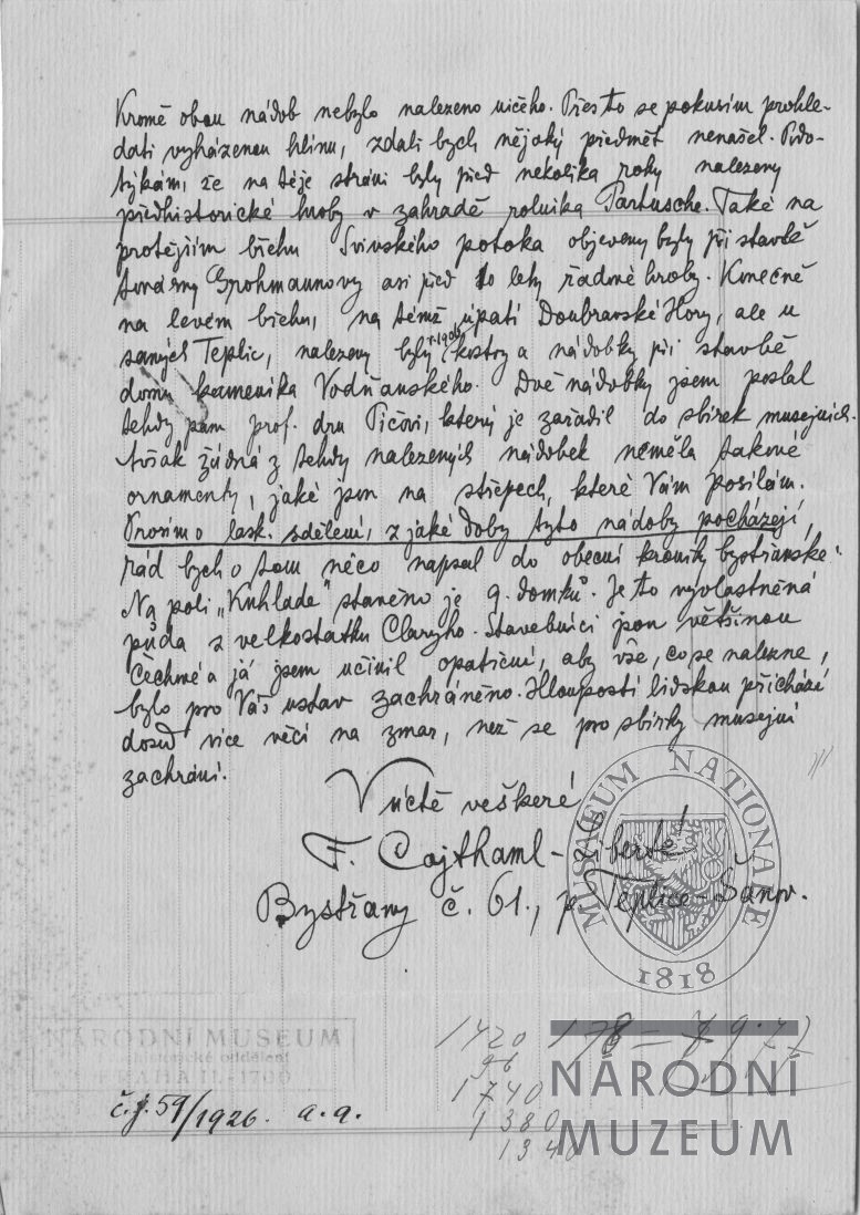 Dopis F. Cajthamla-Liberté z roku 1926 adresovaný Národnímu muzeu o objevu kostrového hrobu a keramických nádob při stavbě domů v obci Bystřany. Autor v dopise pojednává i o možnosti existence dalších hrobů na katastru obce a zároveň prosí Národní muzeum o dataci jím zaslaných artefaktů, aby mohl o nálezu udělat záznam do místní kroniky.