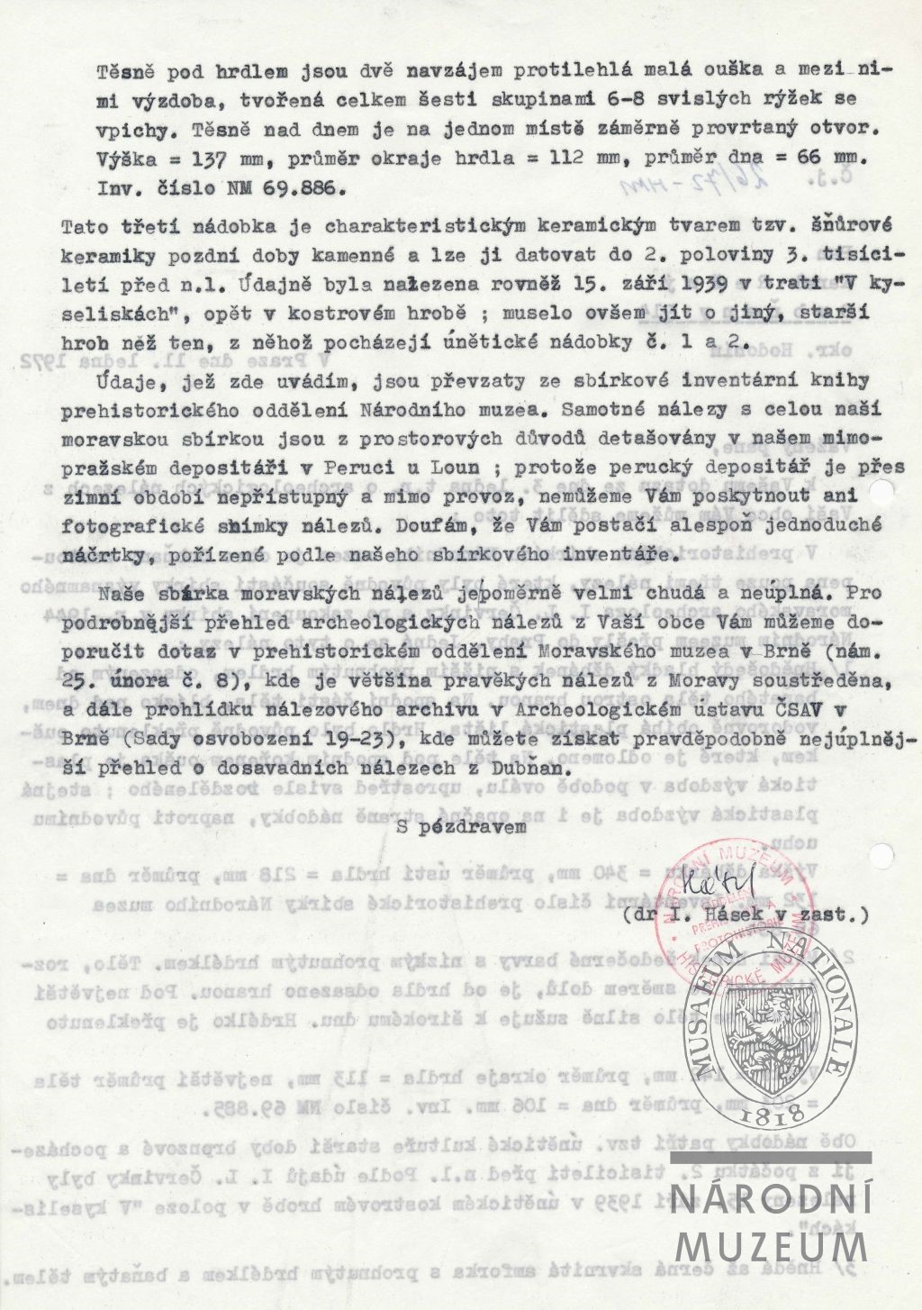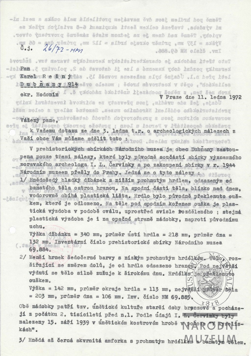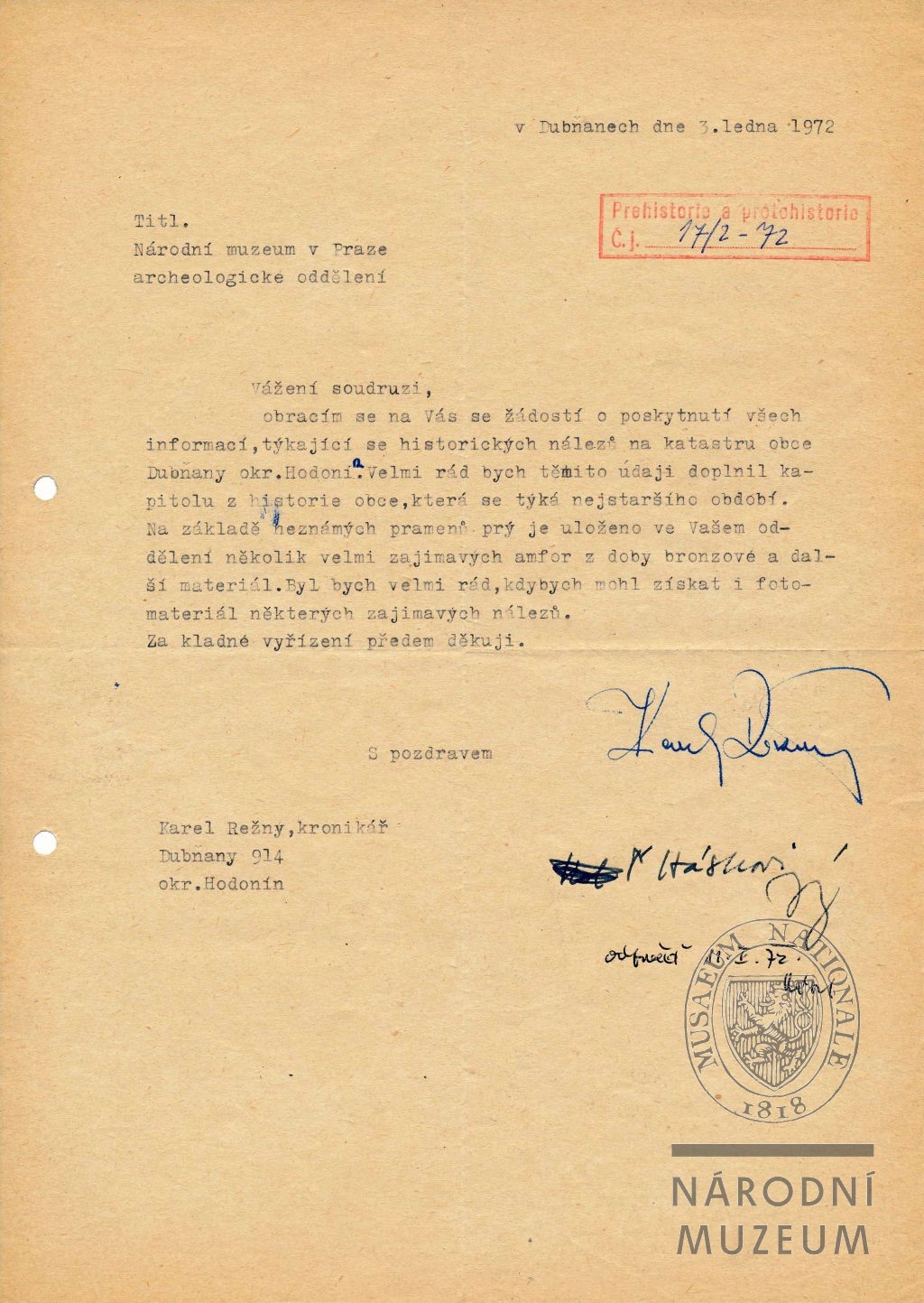 Korespondence mezi Karlem Režným, kronikářem obce Dubňany, a Národním muzeem o poskytnutí informací o nálezech v Dubňanech. Muzeum ve svém dopise odpovídá, že v jeho inventáři jsou pouze tři artefakty z této lokality. Džbán a hrnek únětické kultury a amfora kultury se šňůrovou keramikou. Národní muzeum dále dodává, že více předmětů by se mohlo nacházet v Brněnském muzeu.