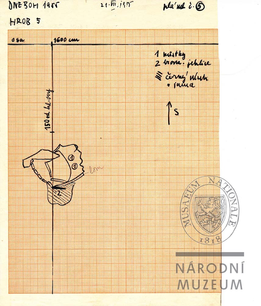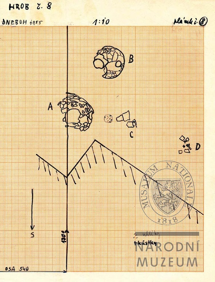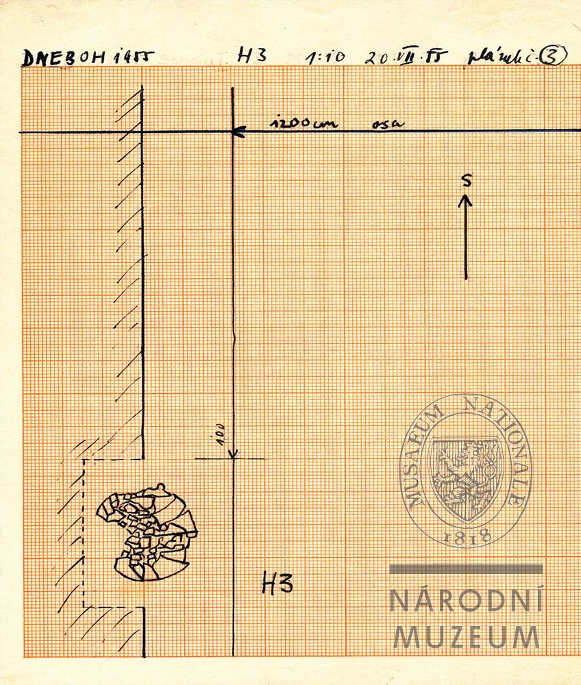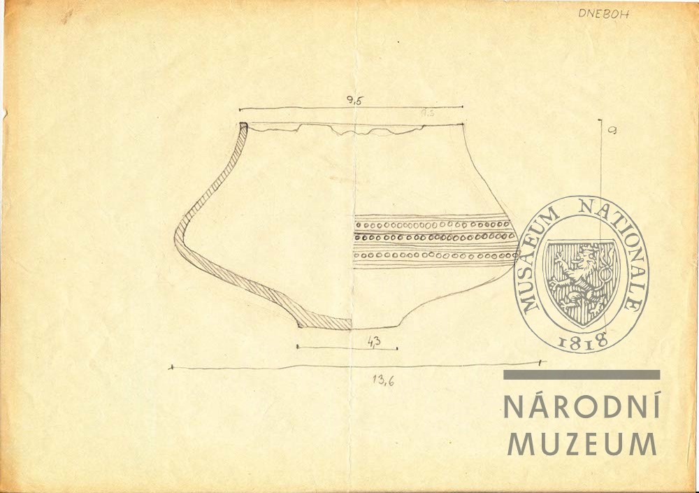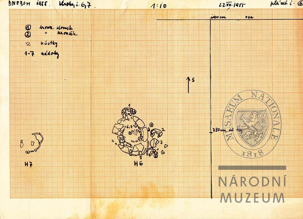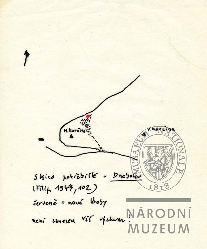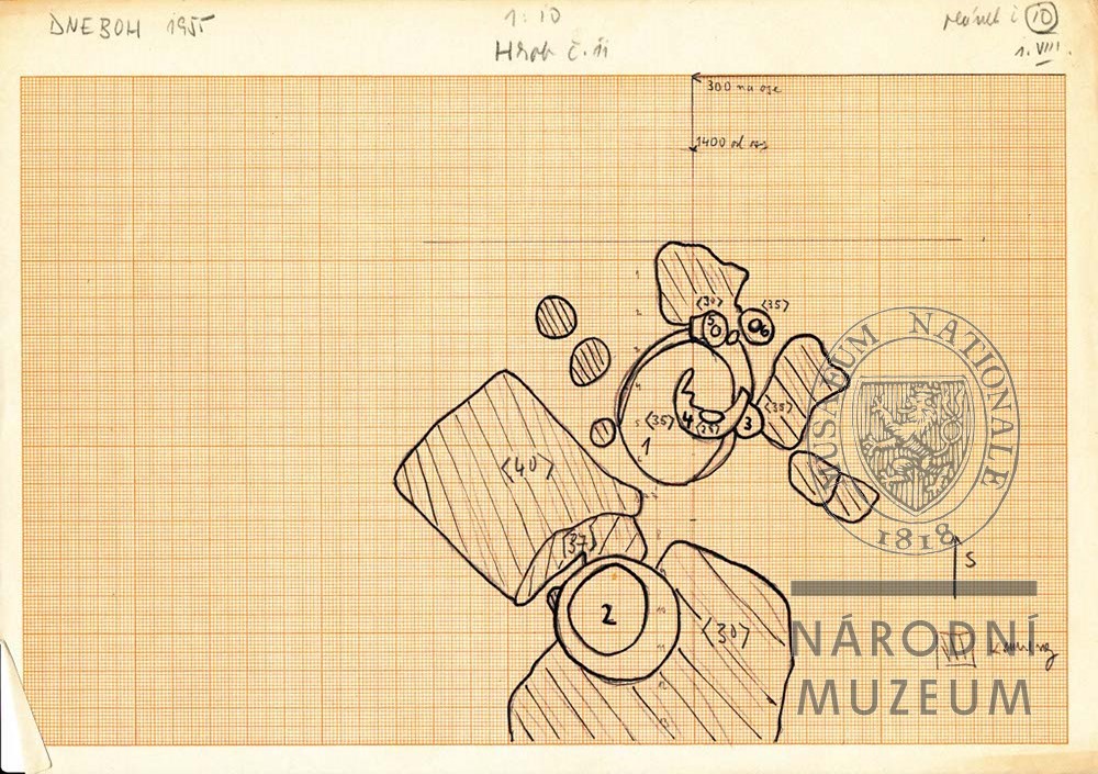 Plány z výzkumu z roku 1955. Dále dopis J. Waldhauserovi o dalších nálezech v Dnebohu, předaný asi dle průvodního lístku roku 1973 do Národního muzea.
