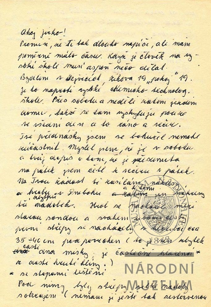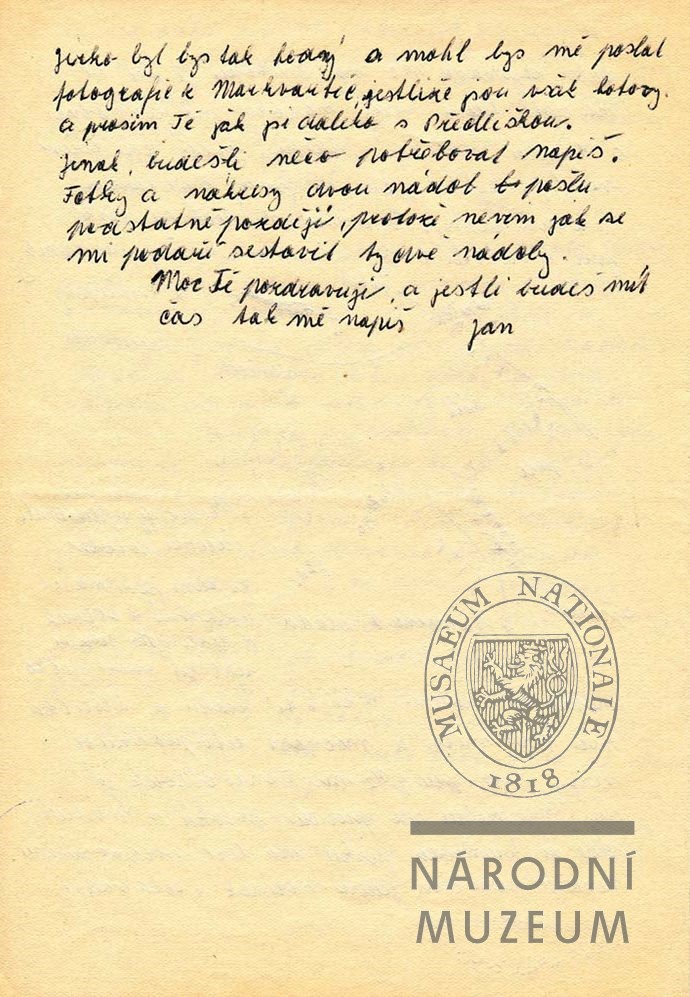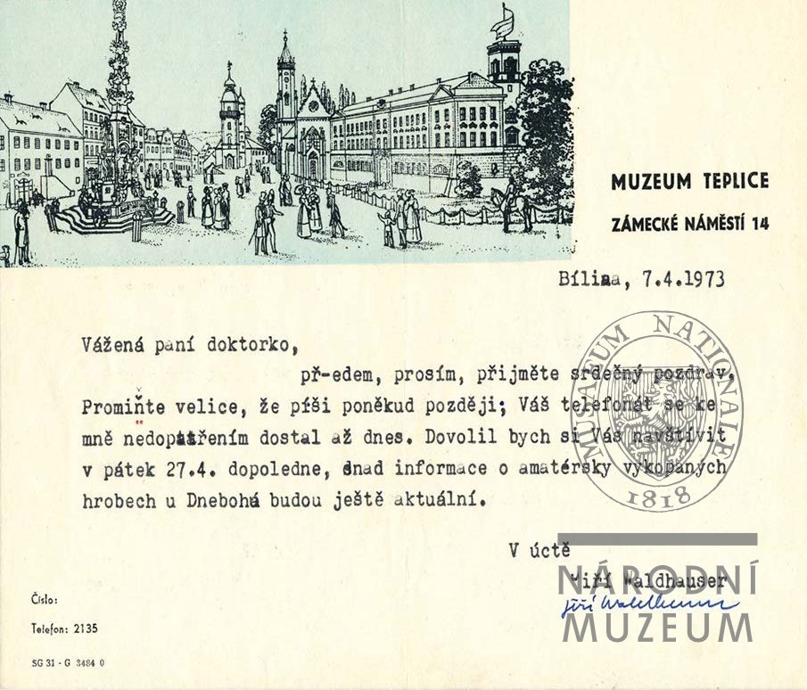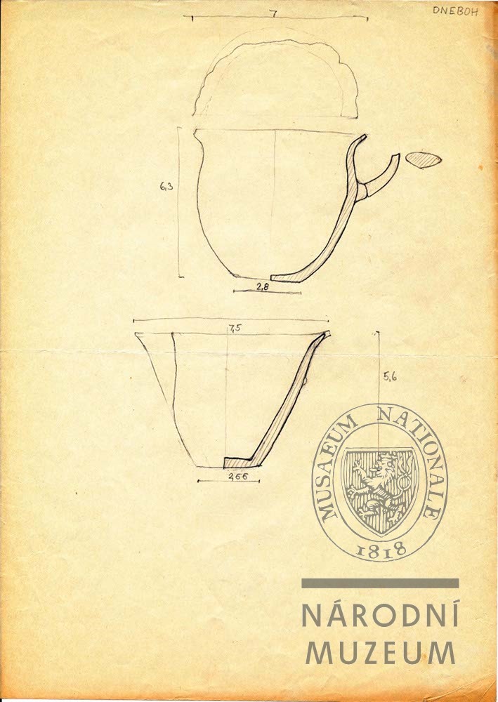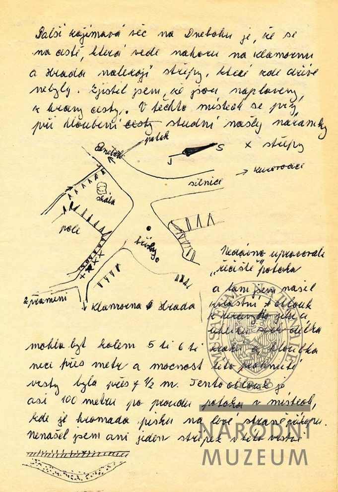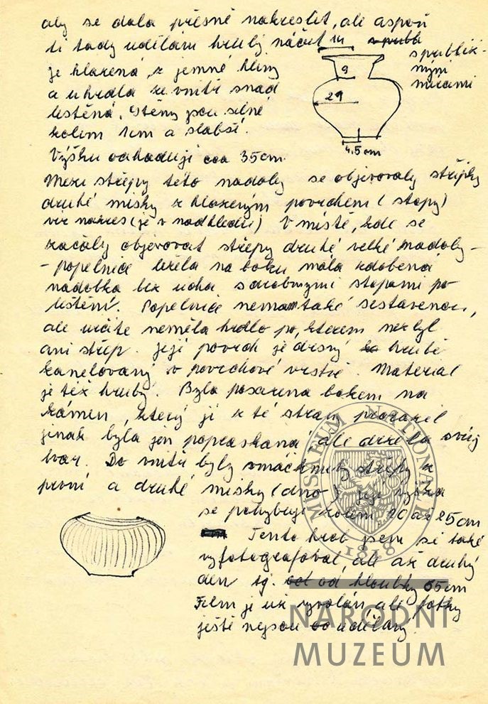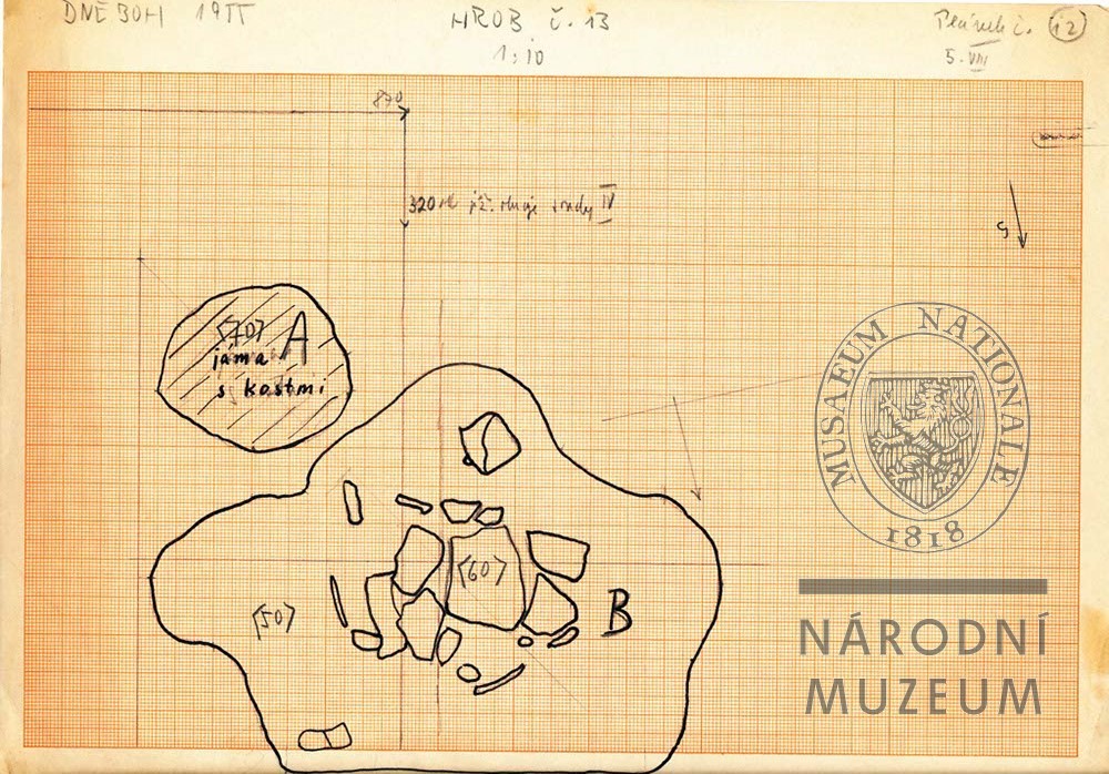 Plány z výzkumu z roku 1955. Dále dopis J. Waldhauserovi o dalších nálezech v Dnebohu, předaný asi dle průvodního lístku roku 1973 do Národního muzea.