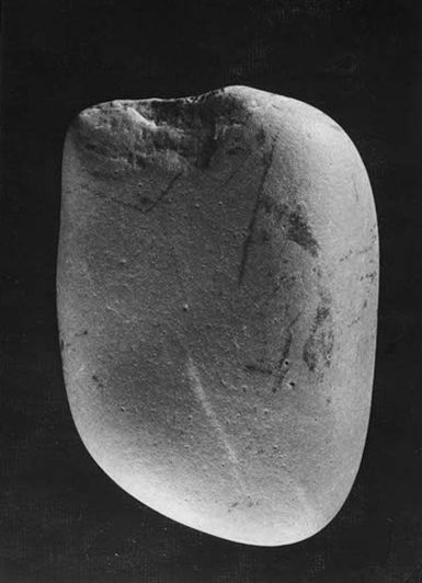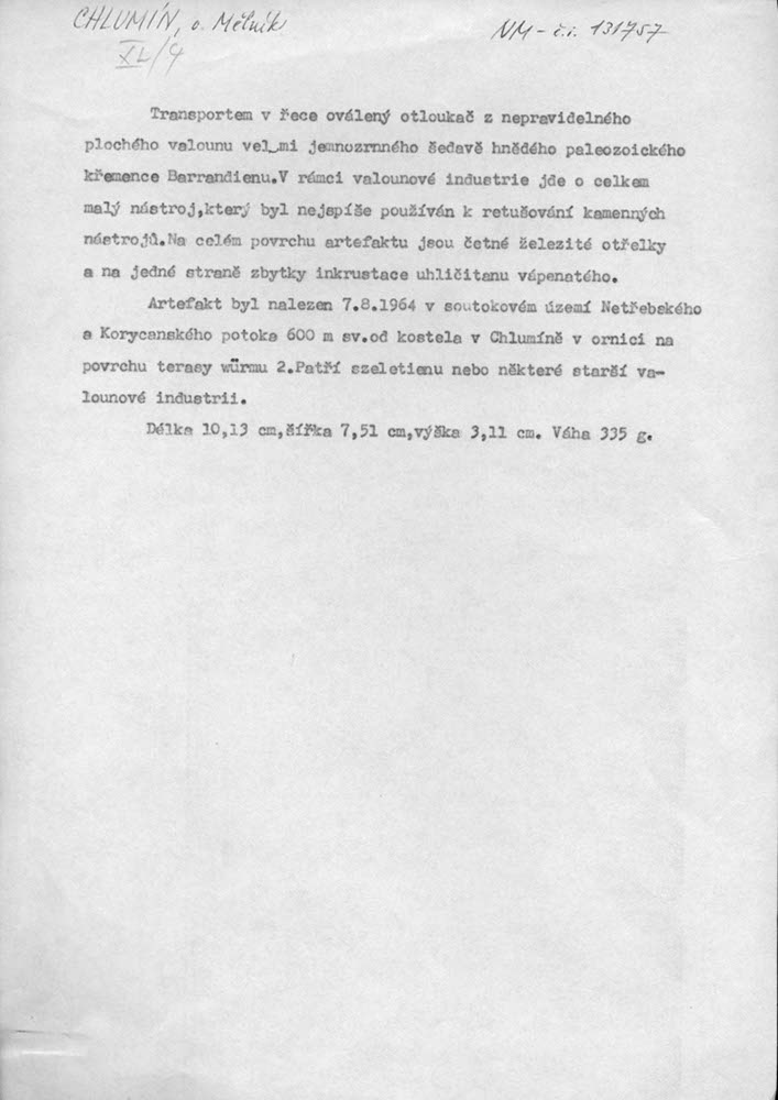 Zpráva o nálezu paleolitického valounového otloukače roku 1964 K. Žeberou. Jmenovaným darováno do sbírky NM.