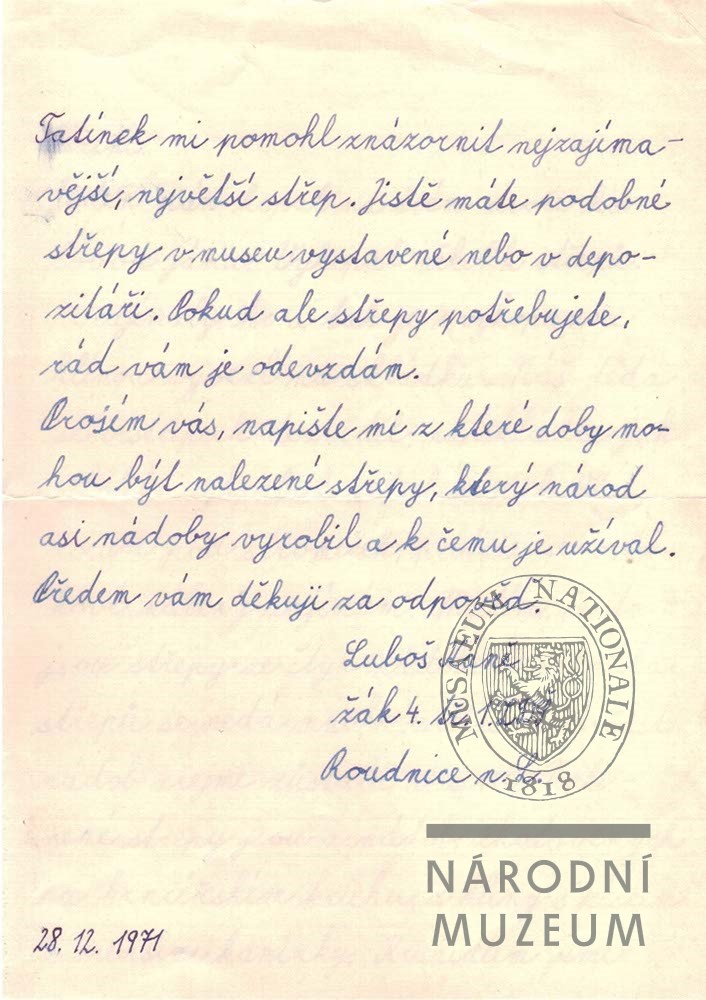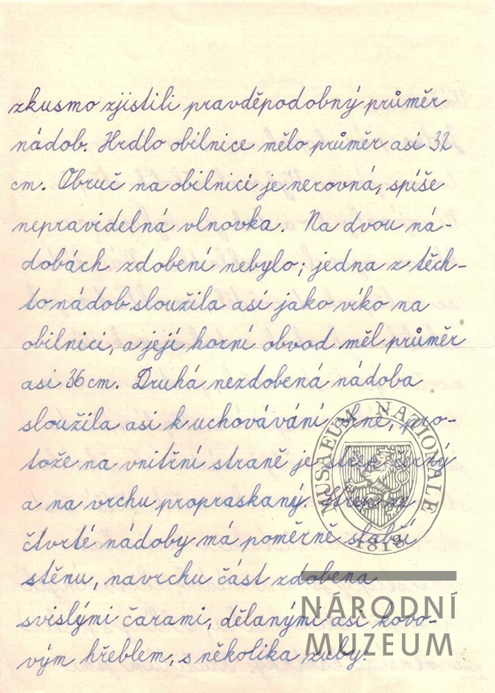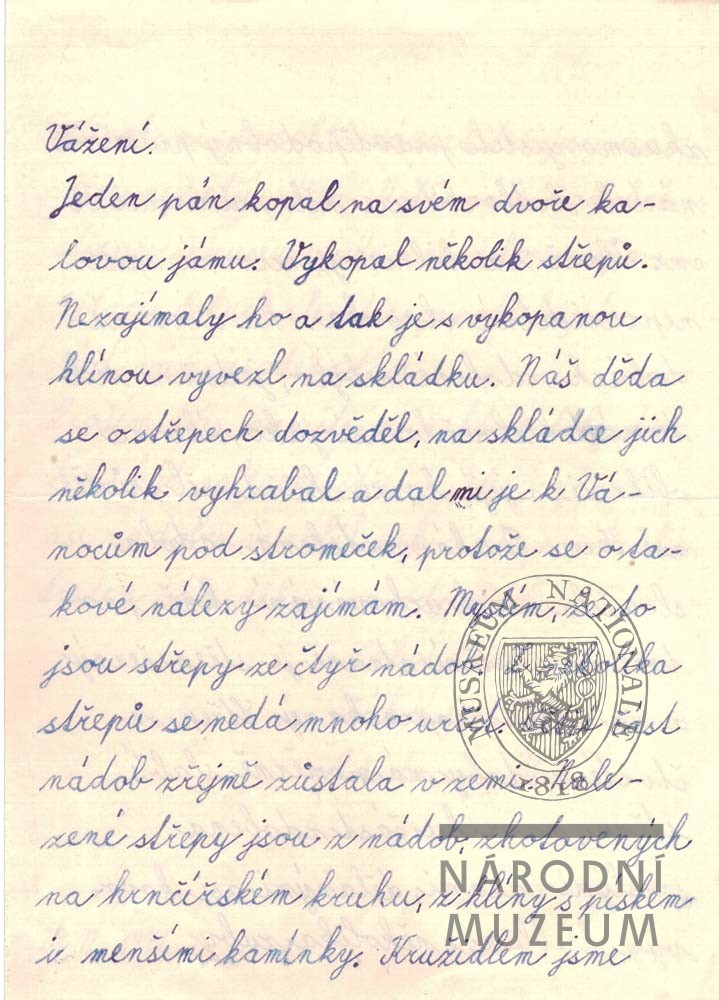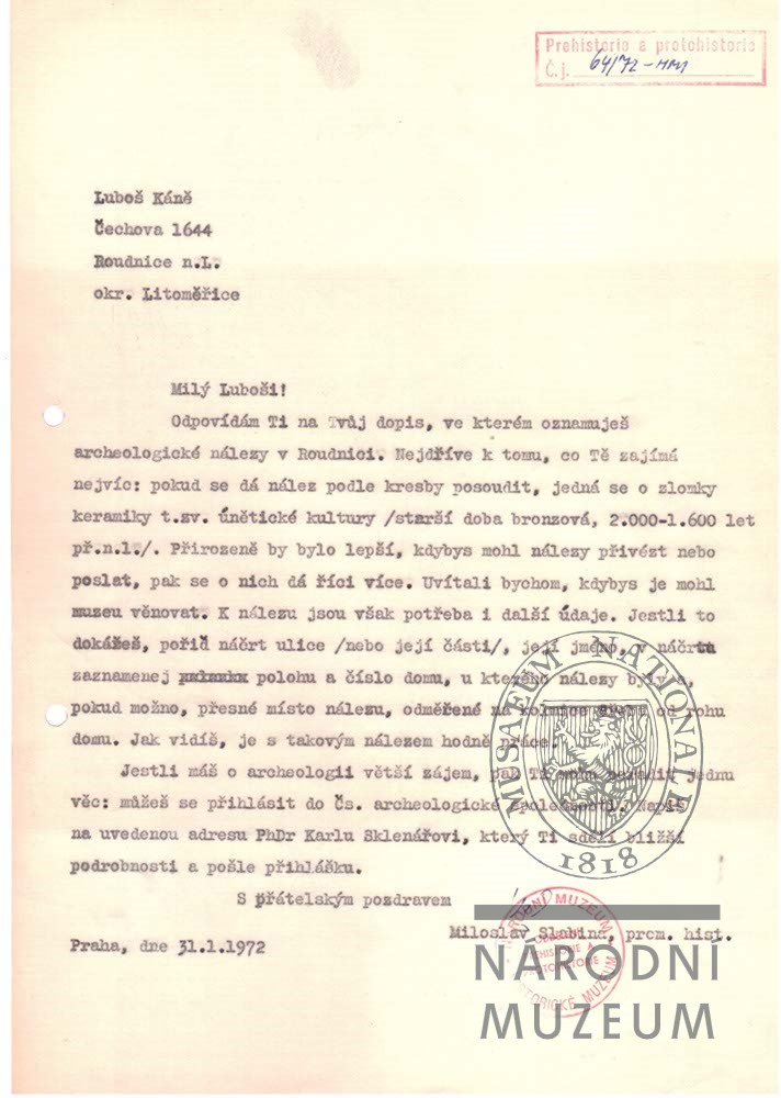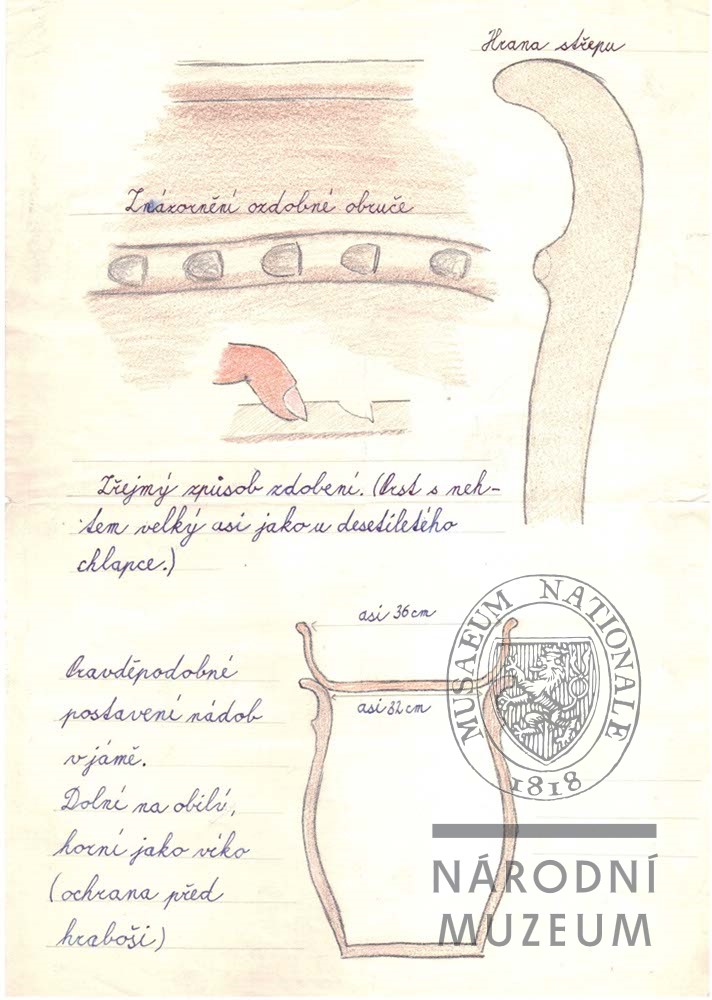 Dopis L. Káněho s kresbou nálezu keramiky a odpověď M. Slabiny.