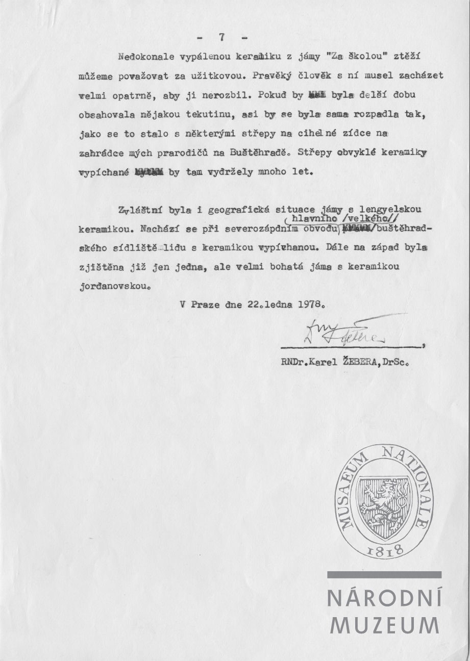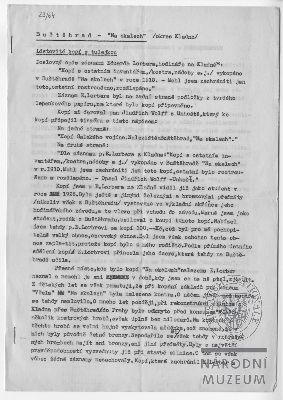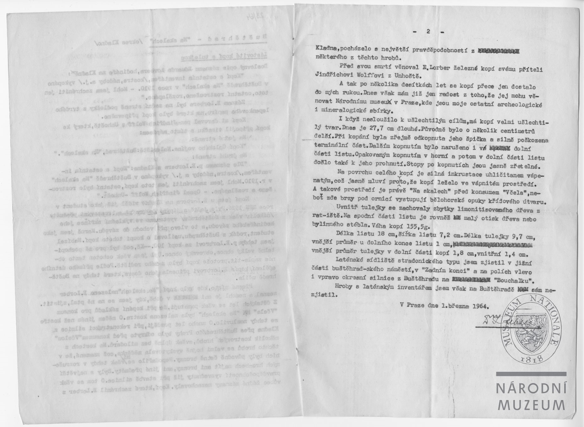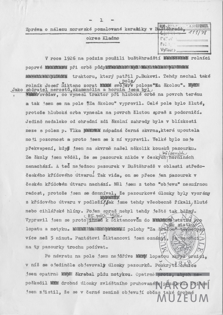 Zpráva o nálezu listovitého kopí objeveném roku 1910 a darovaném muzeu K. Žeberou. Zpráva K. Žebery o nálezu pazourků a keramiky kultury s moravskou malovanou keramikou v roce 1926.
