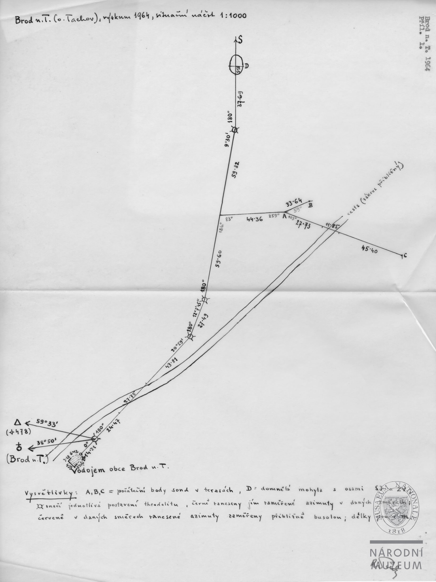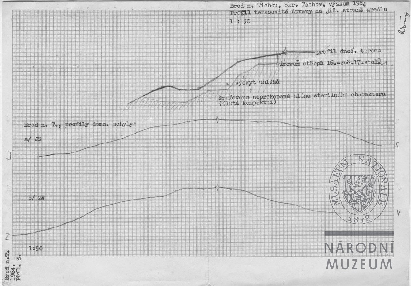Nálezová zpráva R. Turka o zjišťovacím výzkumu v Brodu n. T. Podezření na domnělou mohylu z hradištního období se nepotvrdilo, nálezy keramiky byly nejstarší ze 16. století.