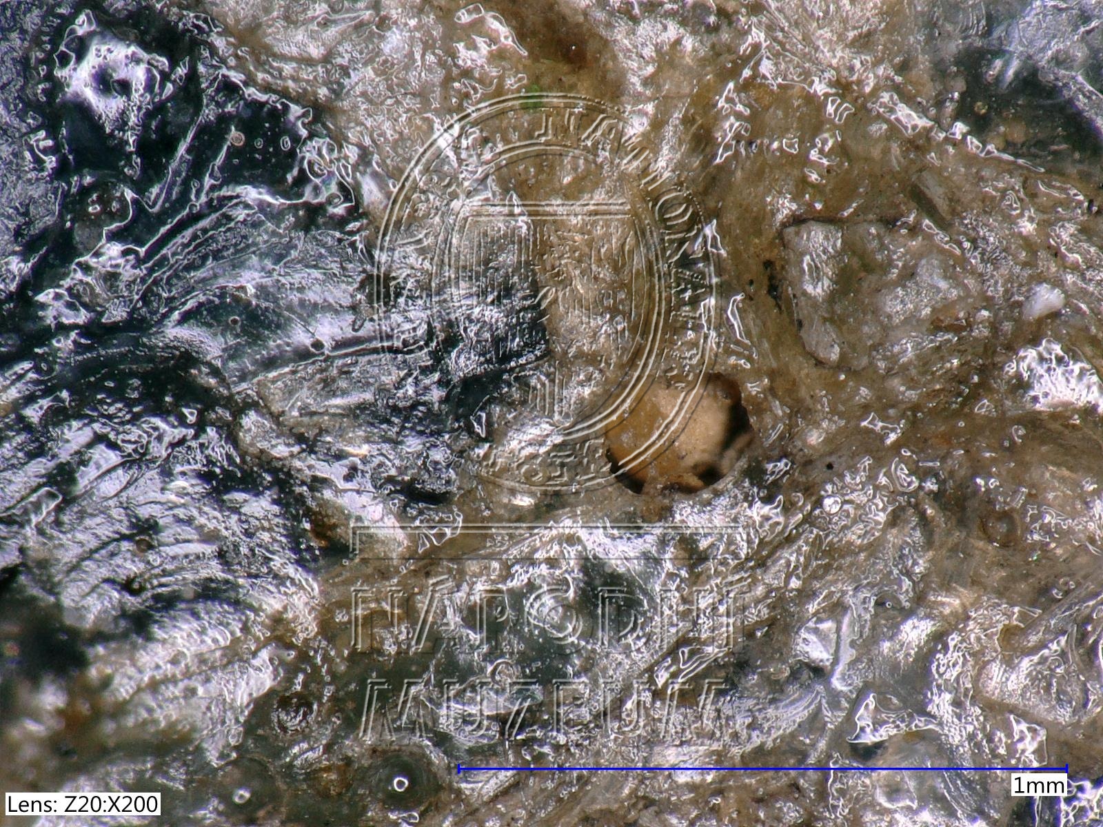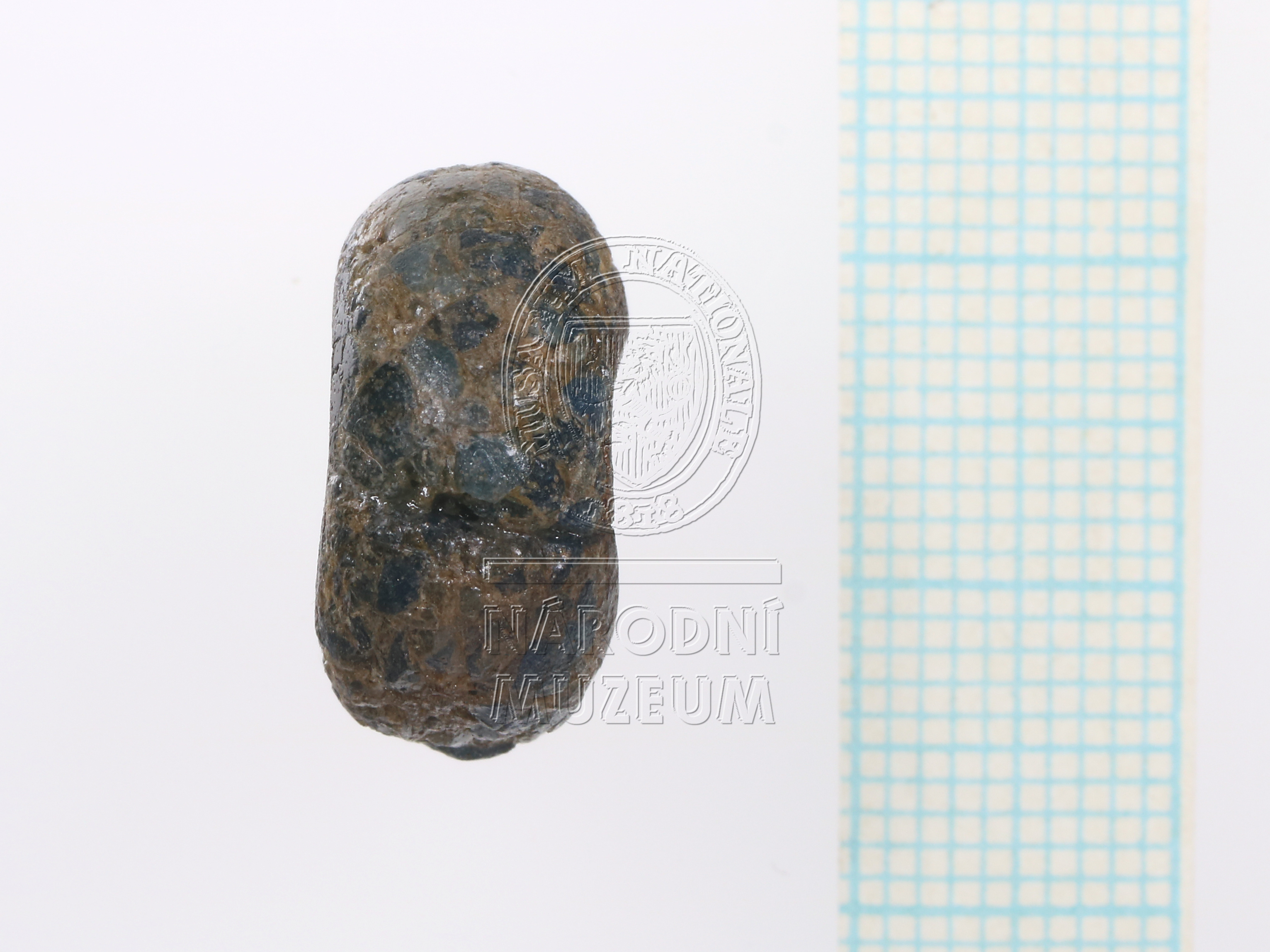 Dvouvrstvý korálek z modrého průsvitného a tmavšího neprůhledného skla, povrch rozpraskán rozdílnou roztažností vrstev, silně korodován.