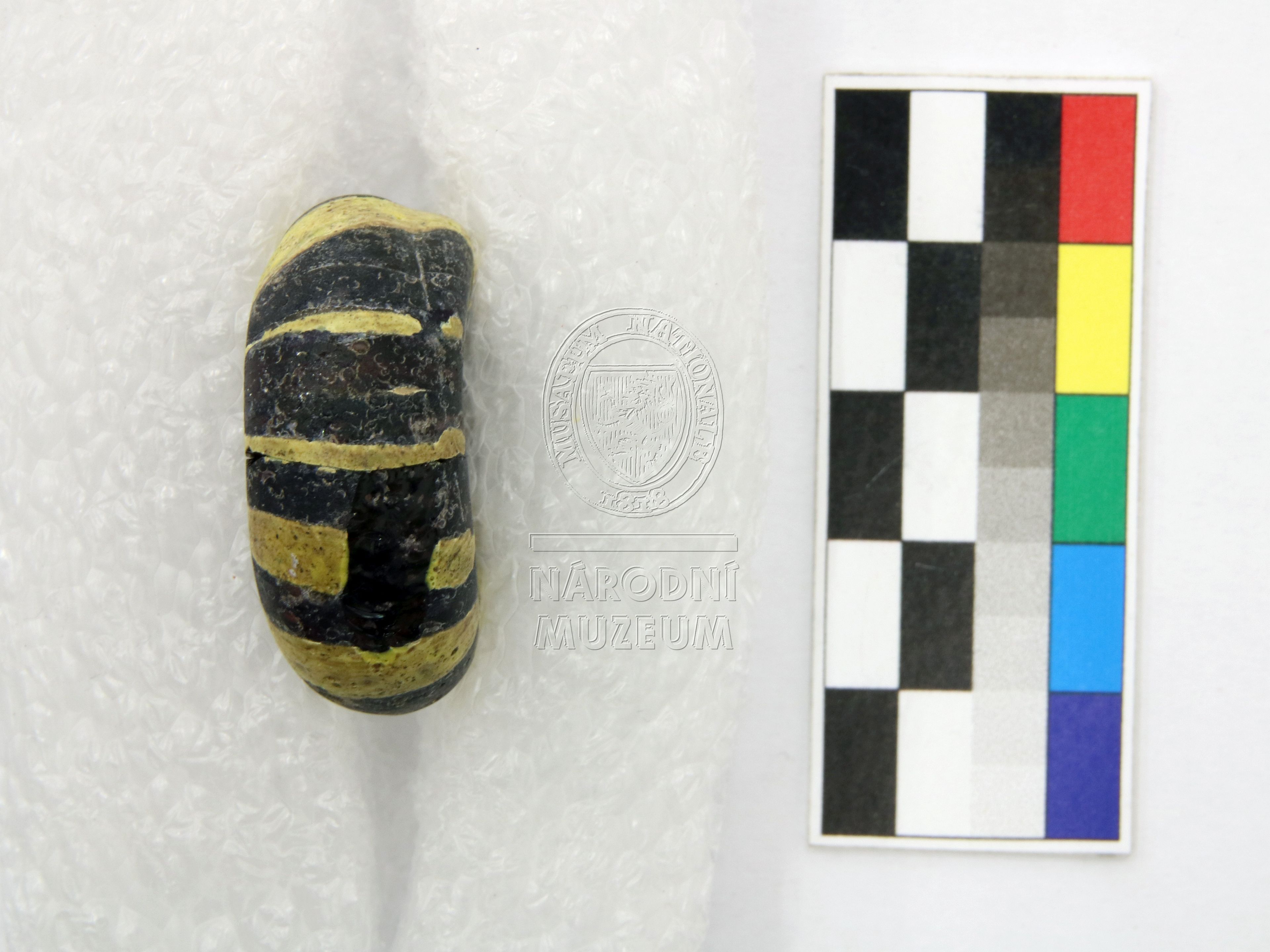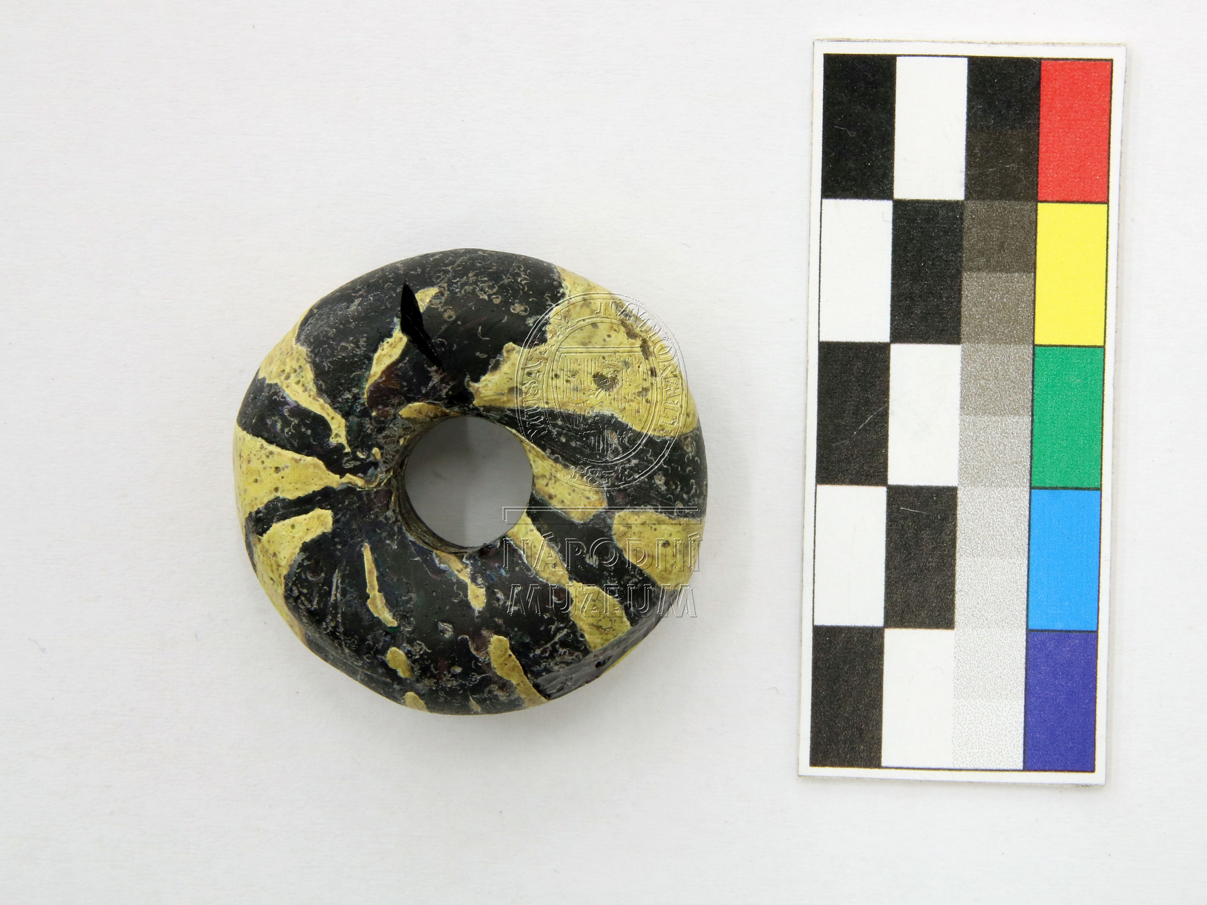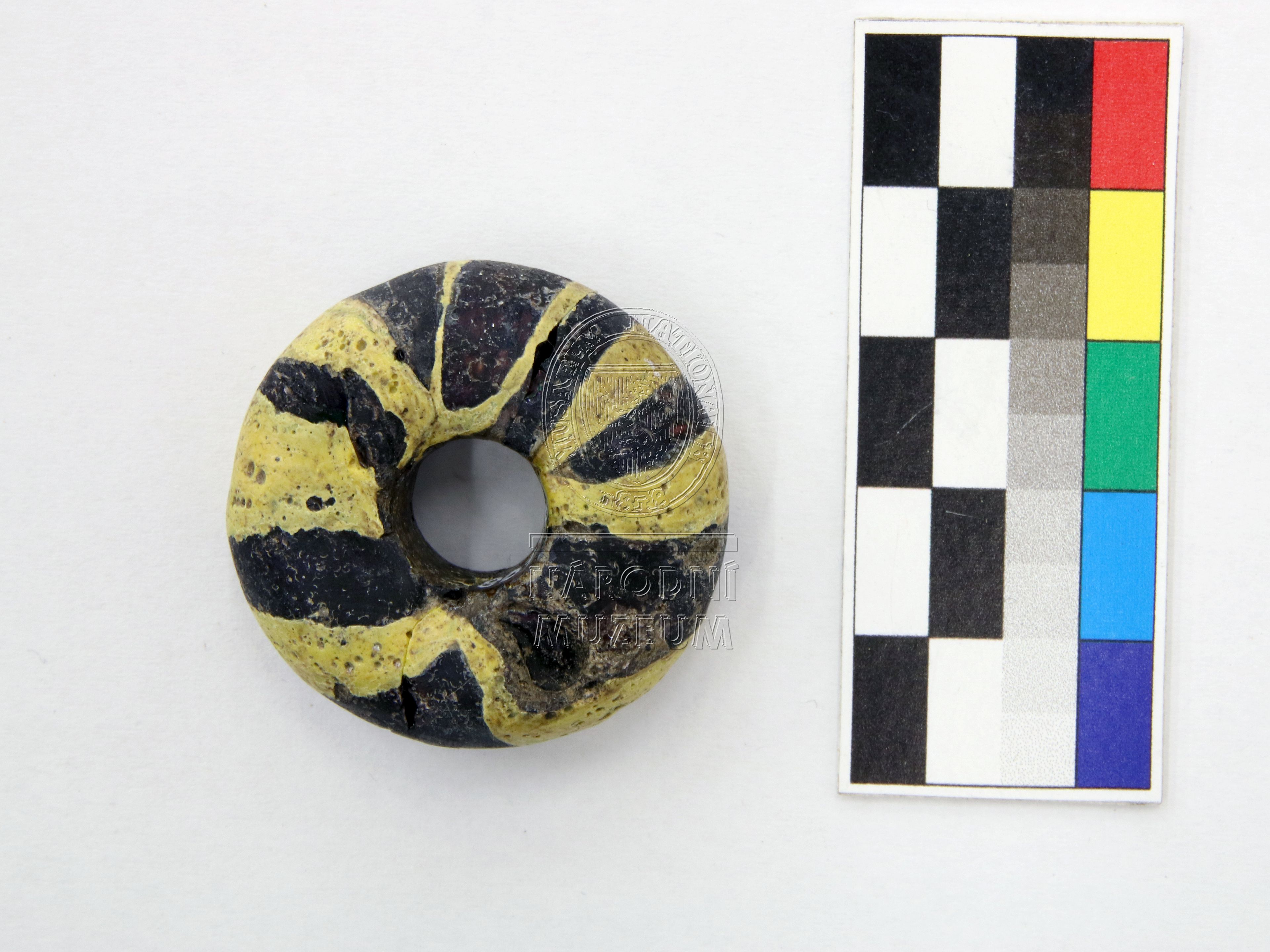 Skleněný prsténcový korál tmavě fialové barvy se žlutými proužky kolmo, ale nepravidelně vedenými po celém povrchu.