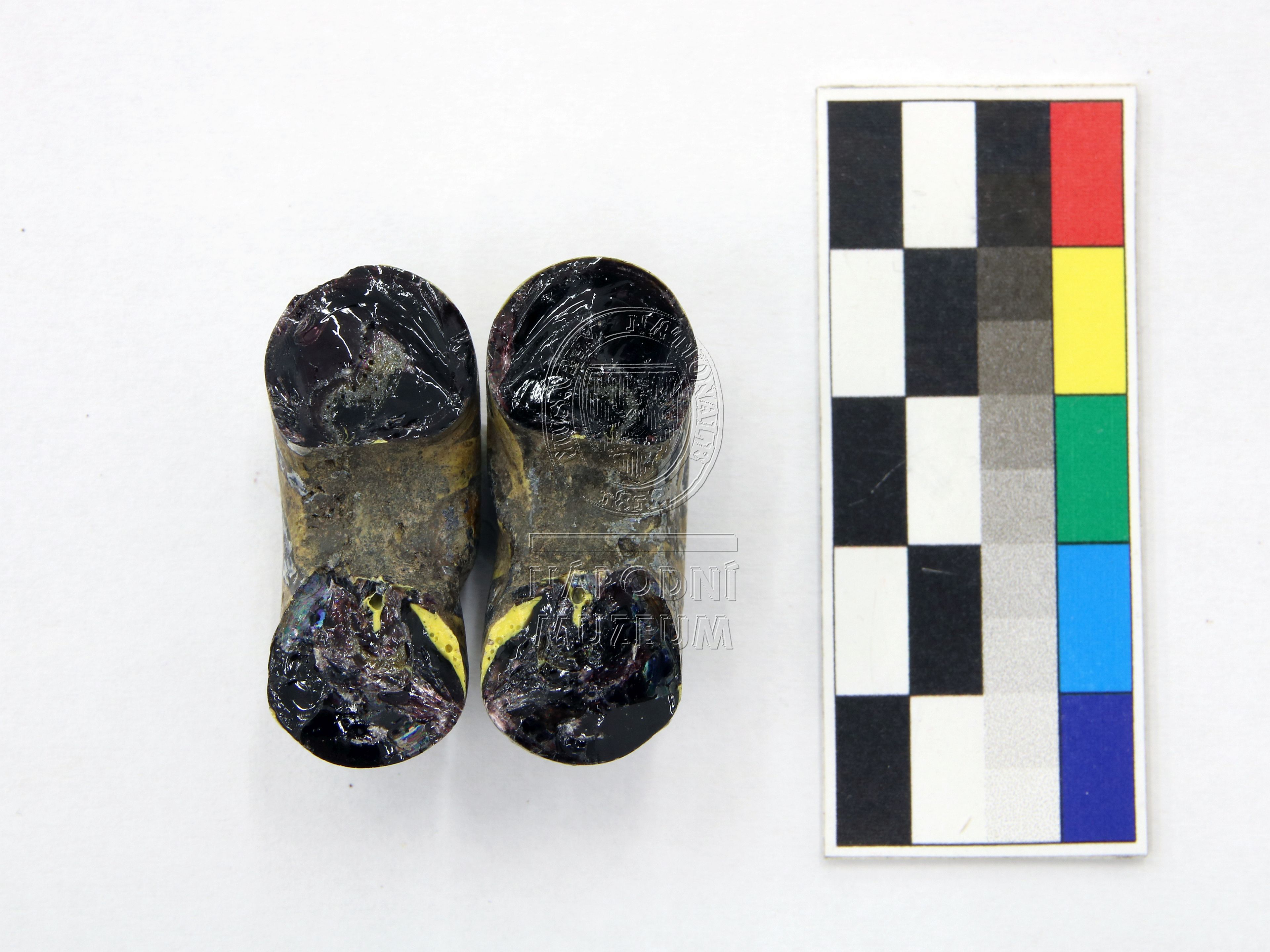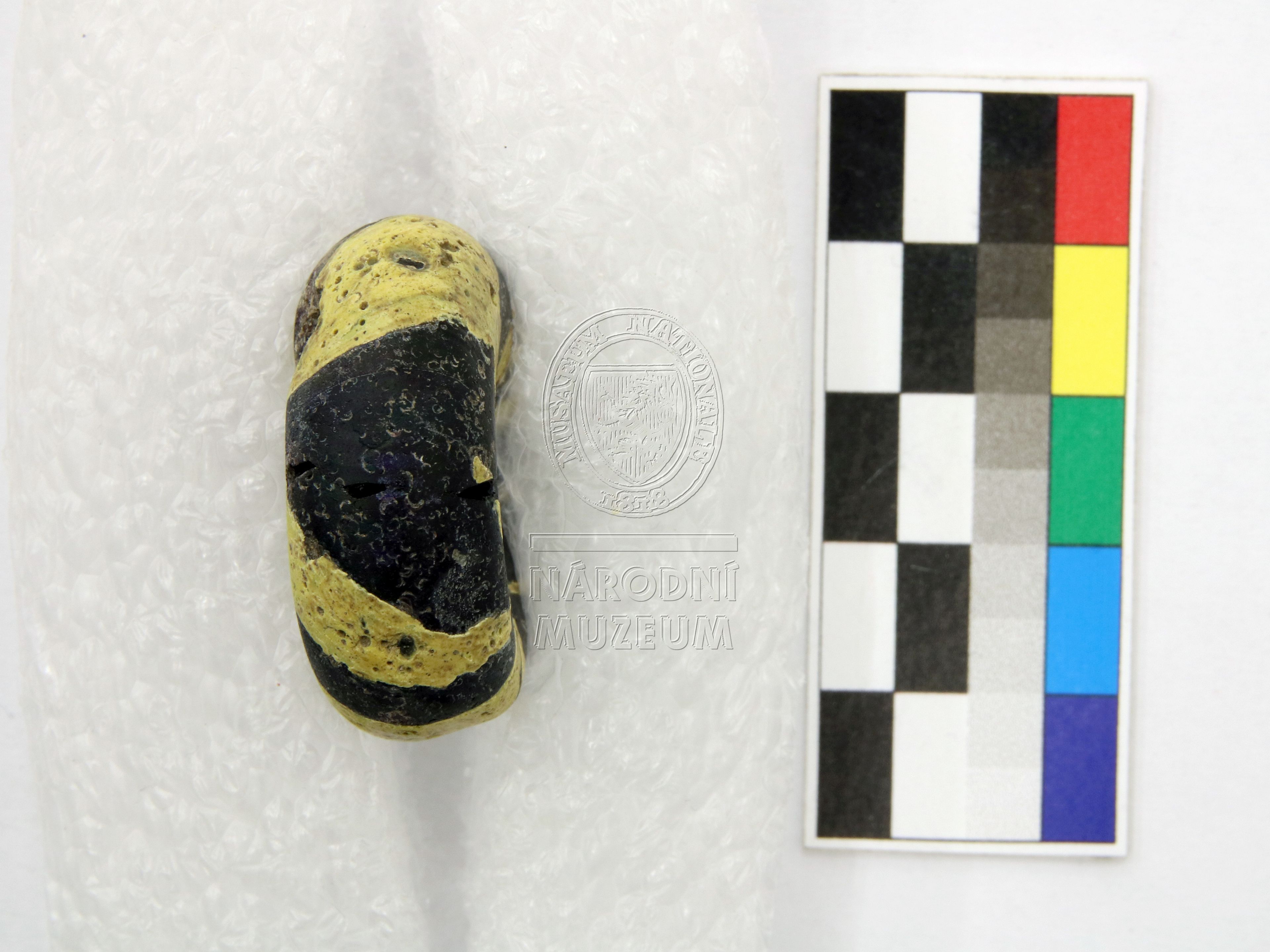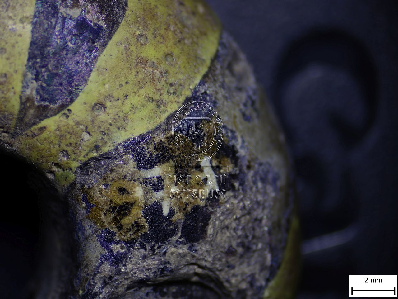 Skleněný prsténcový korál tmavě fialové barvy se žlutými proužky kolmo, ale nepravidelně vedenými po celém povrchu.