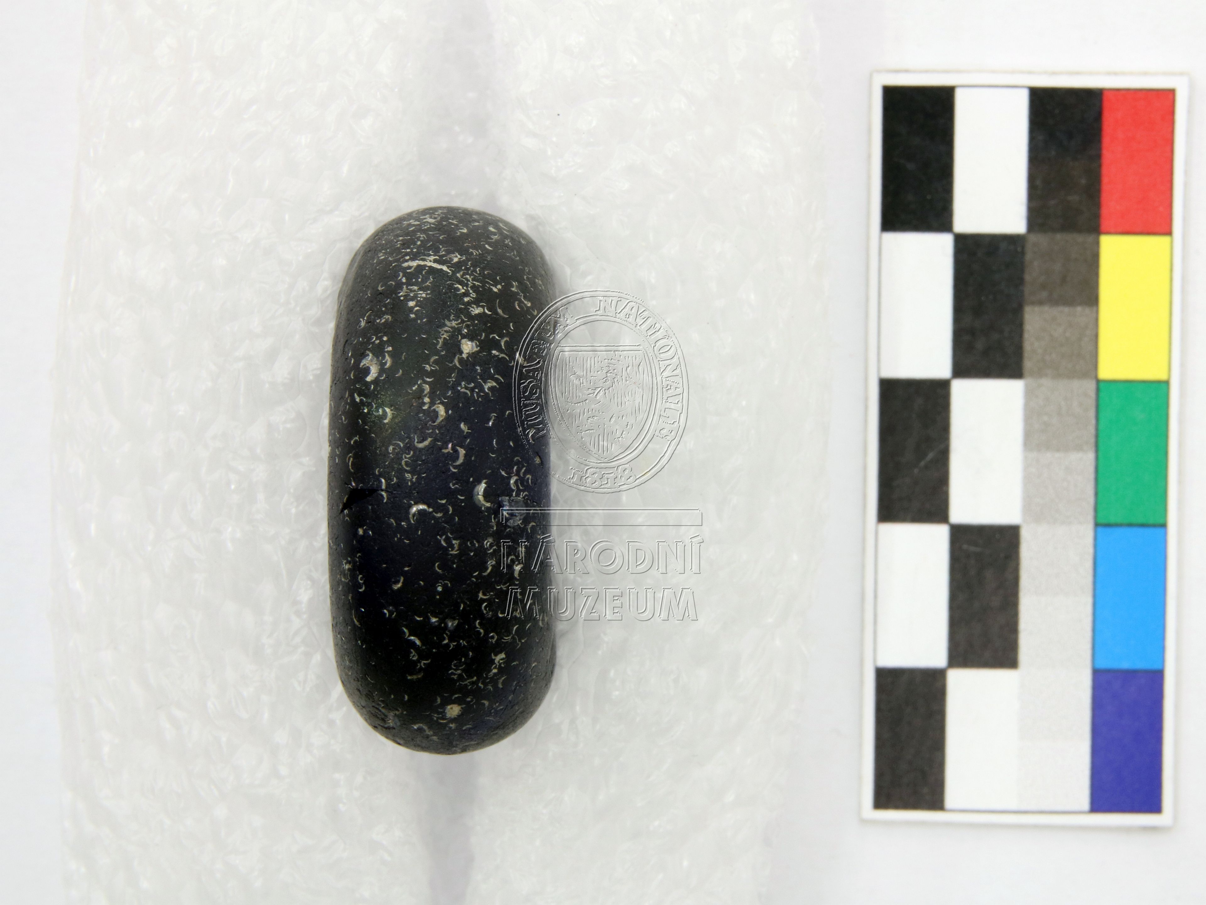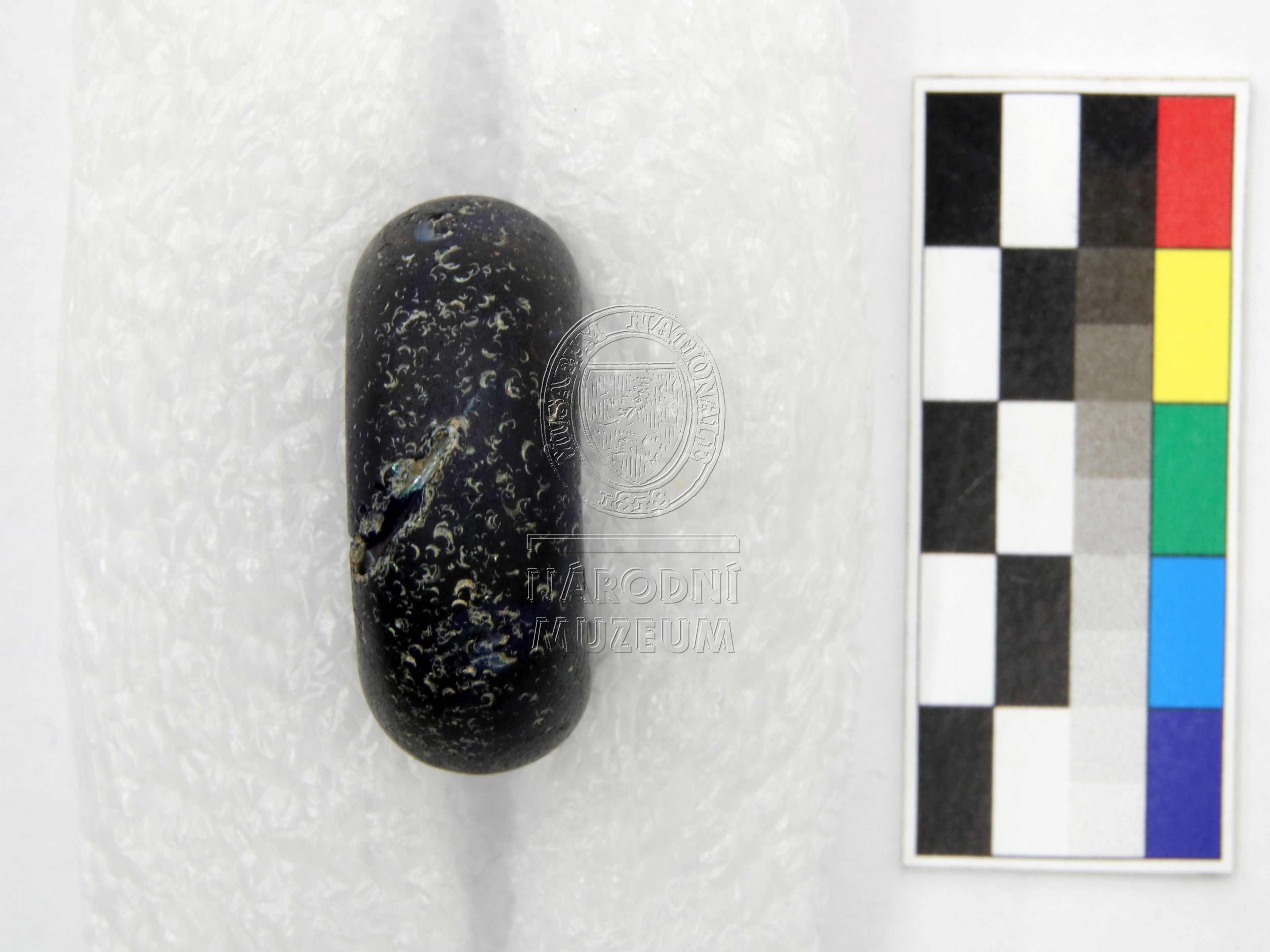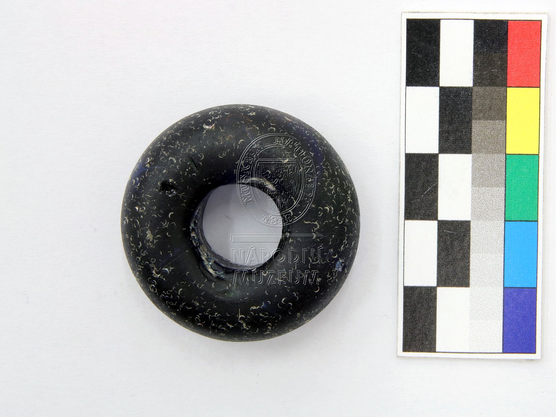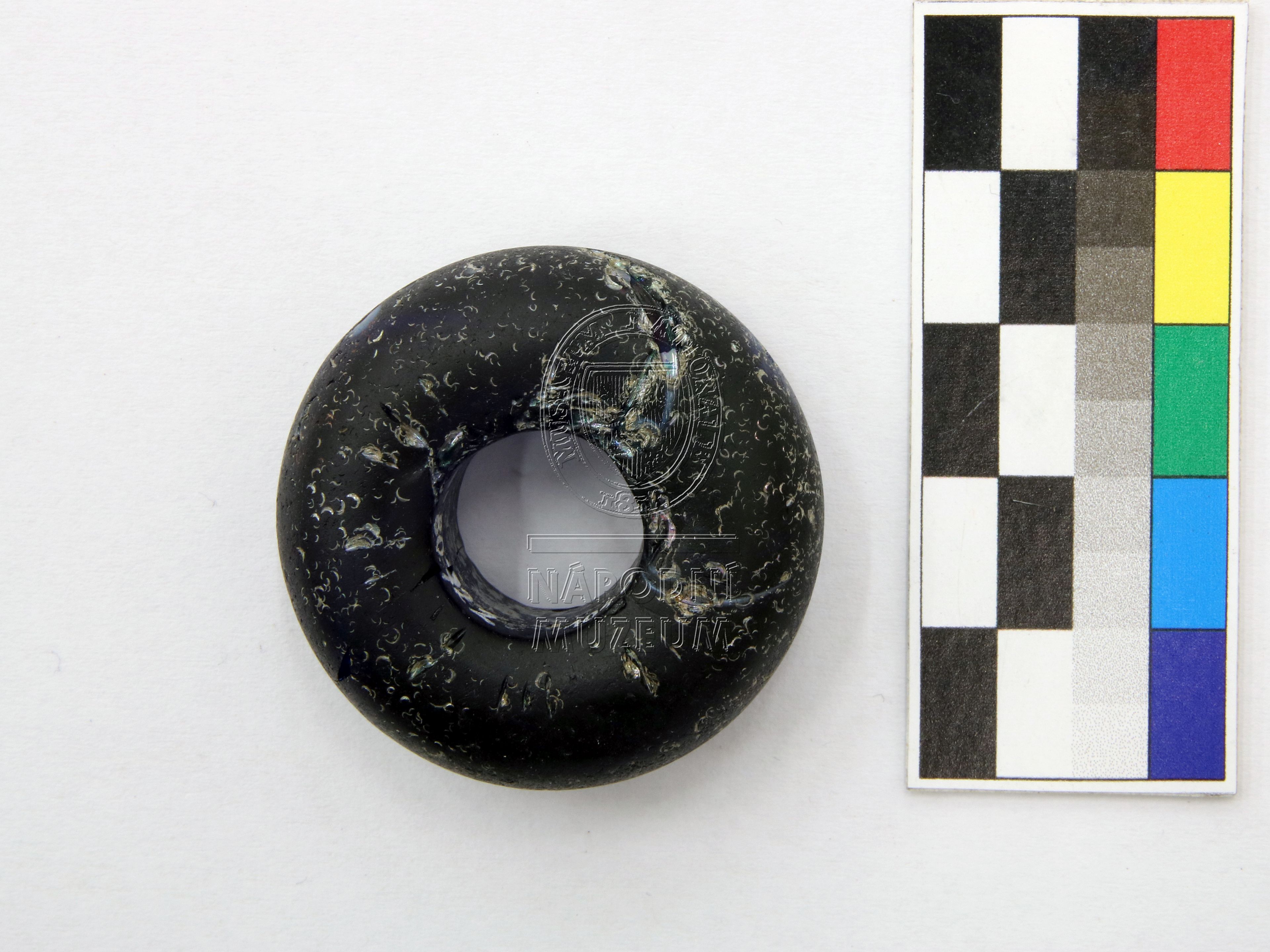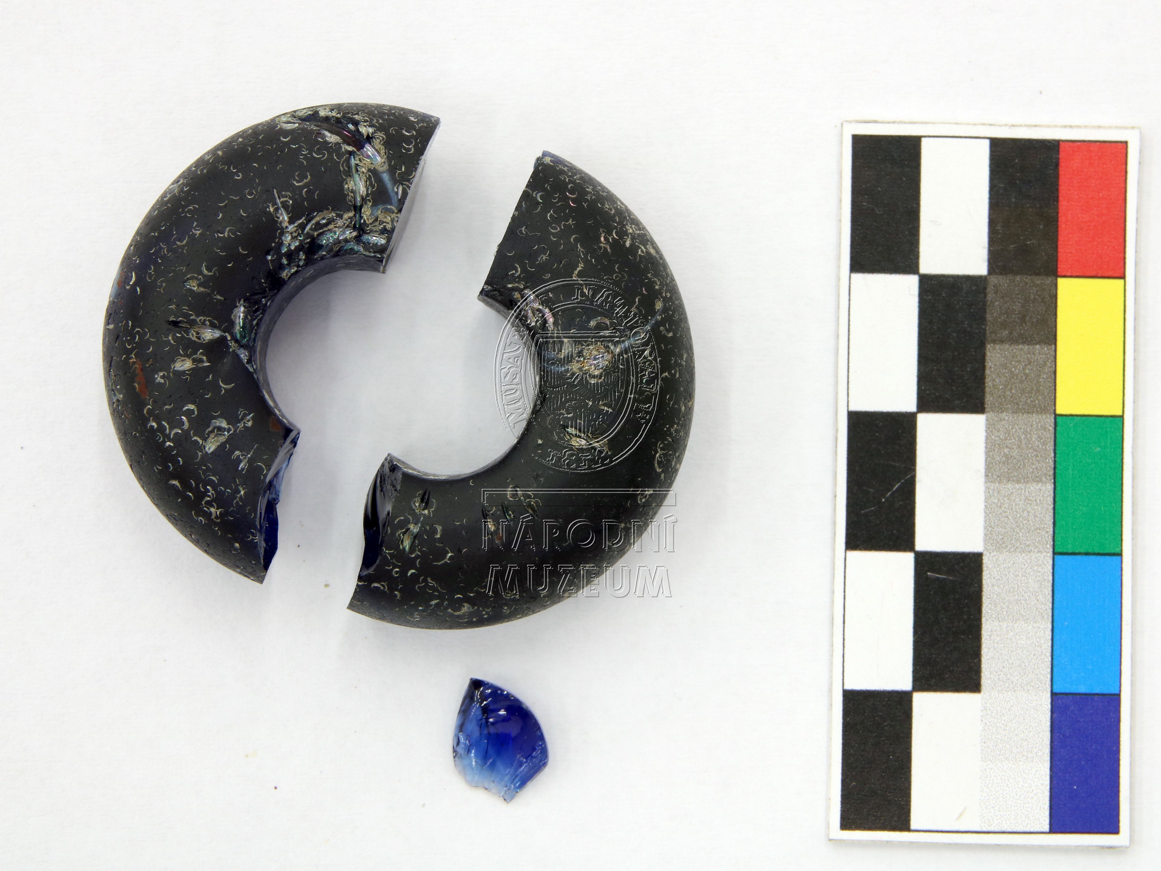 Skleněný prsténcovitý korál z tmavě modrého průsvitného skla, na tmavém podkladě drobné světlé půlměsíčky, nejedná se o zdobení, ale o korozní změny.