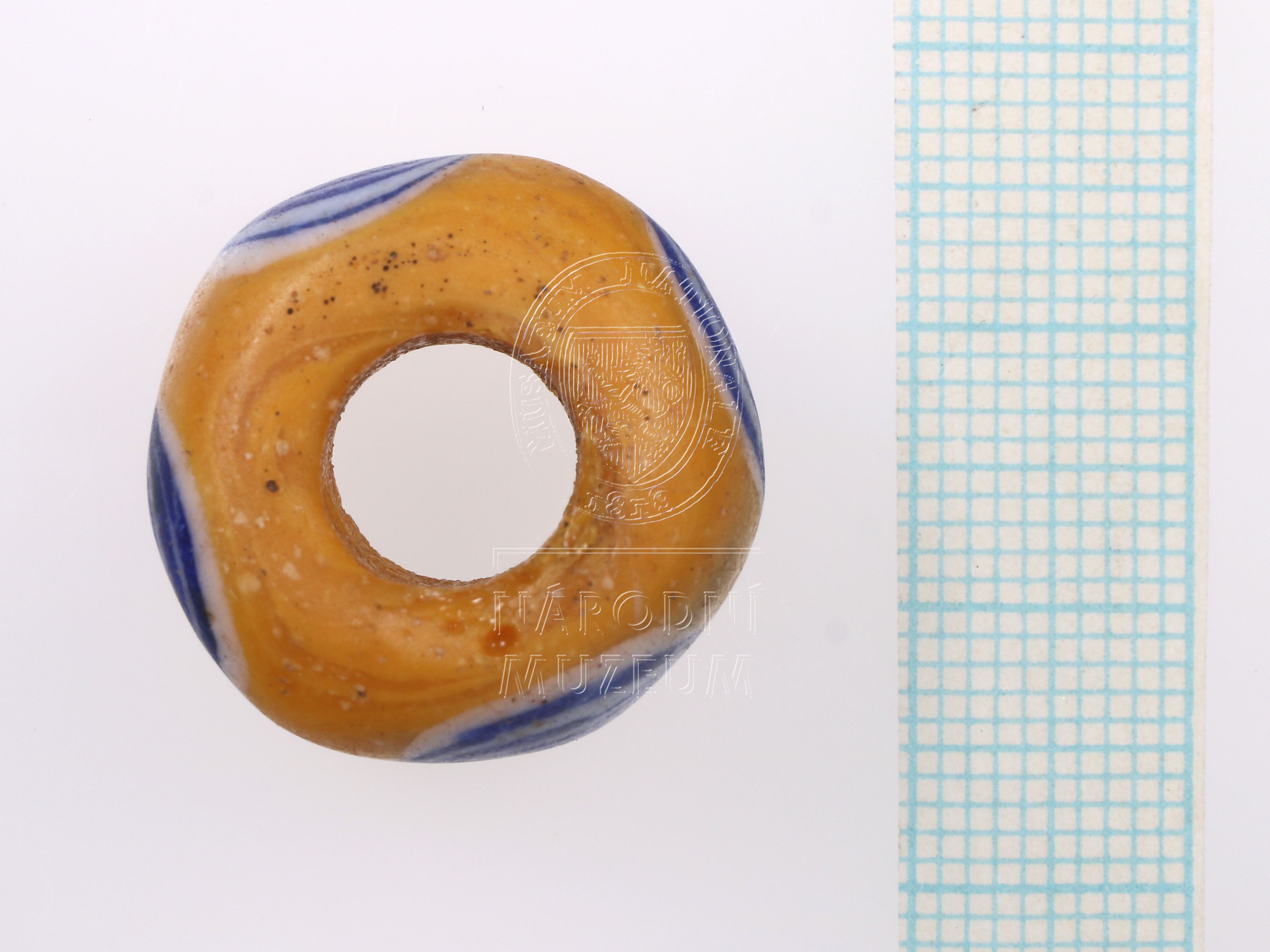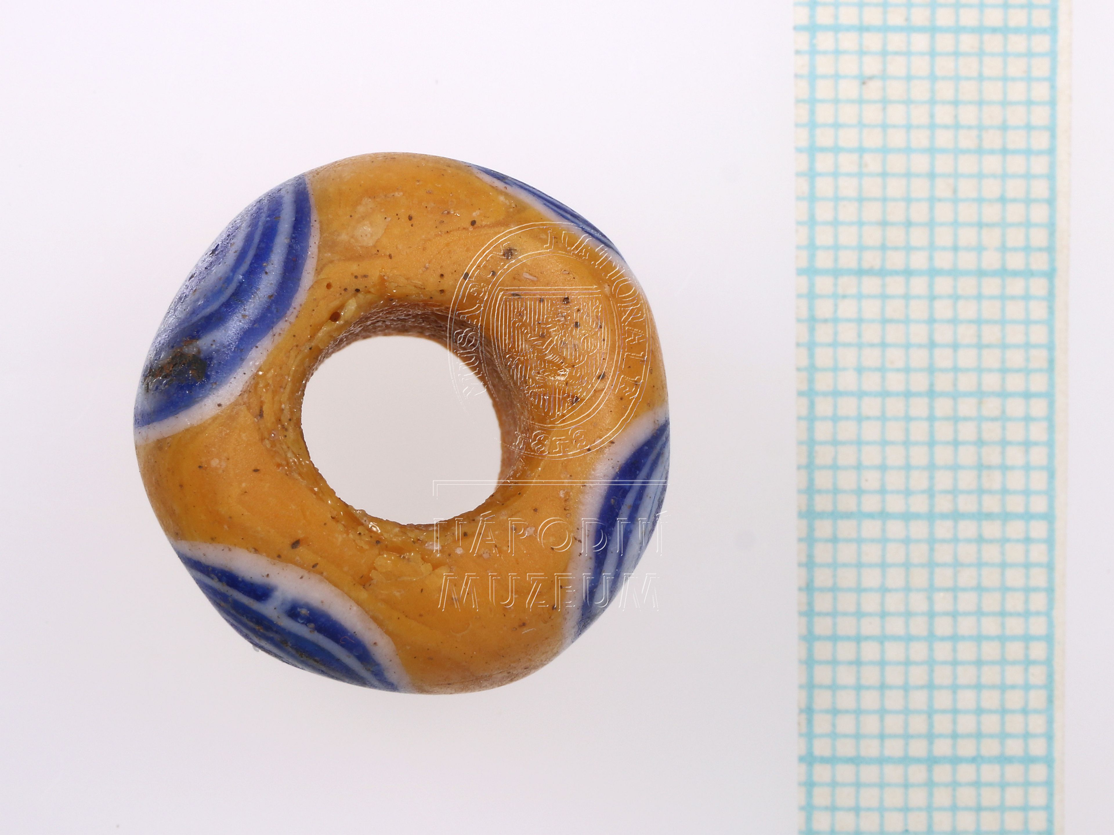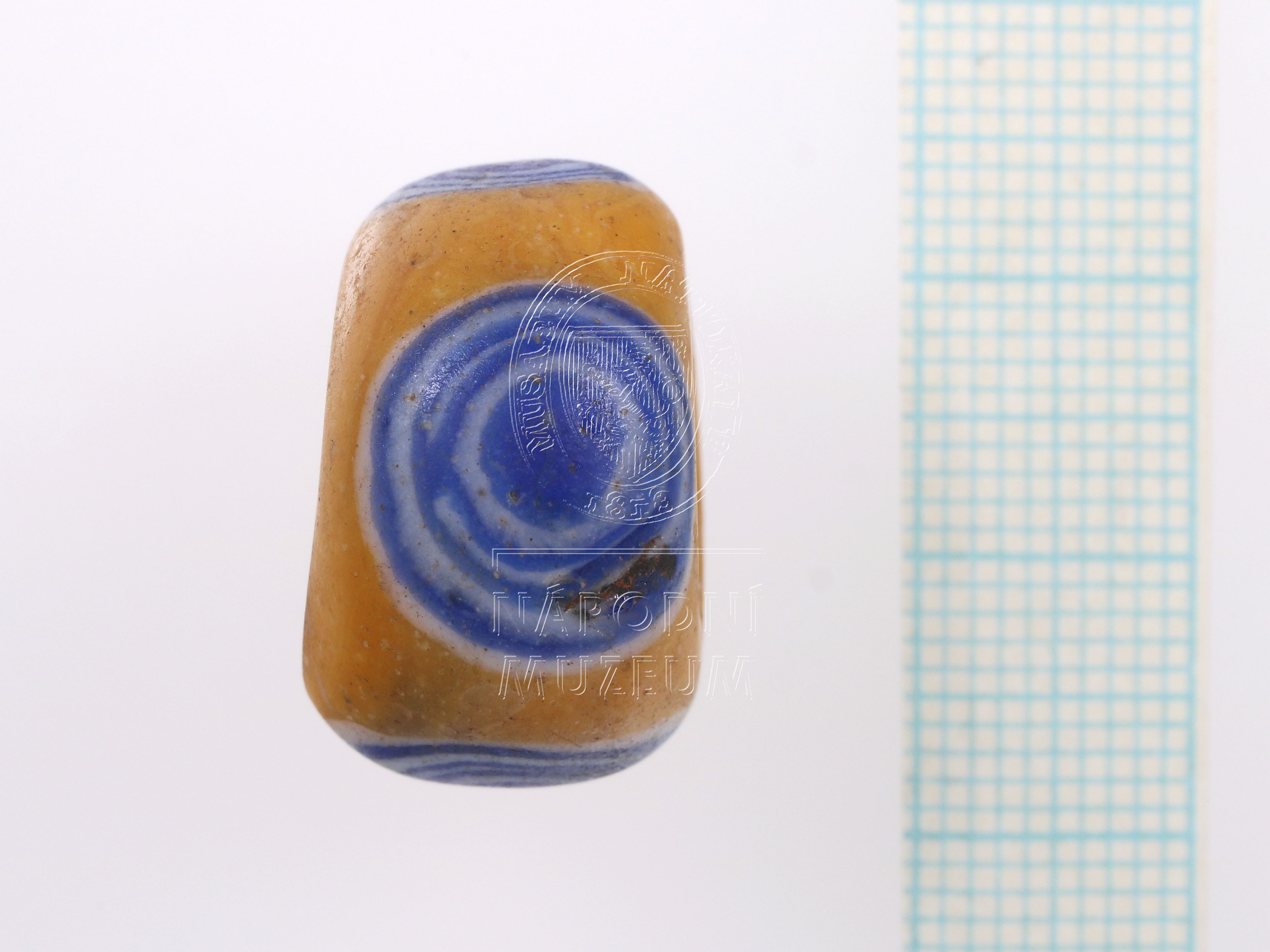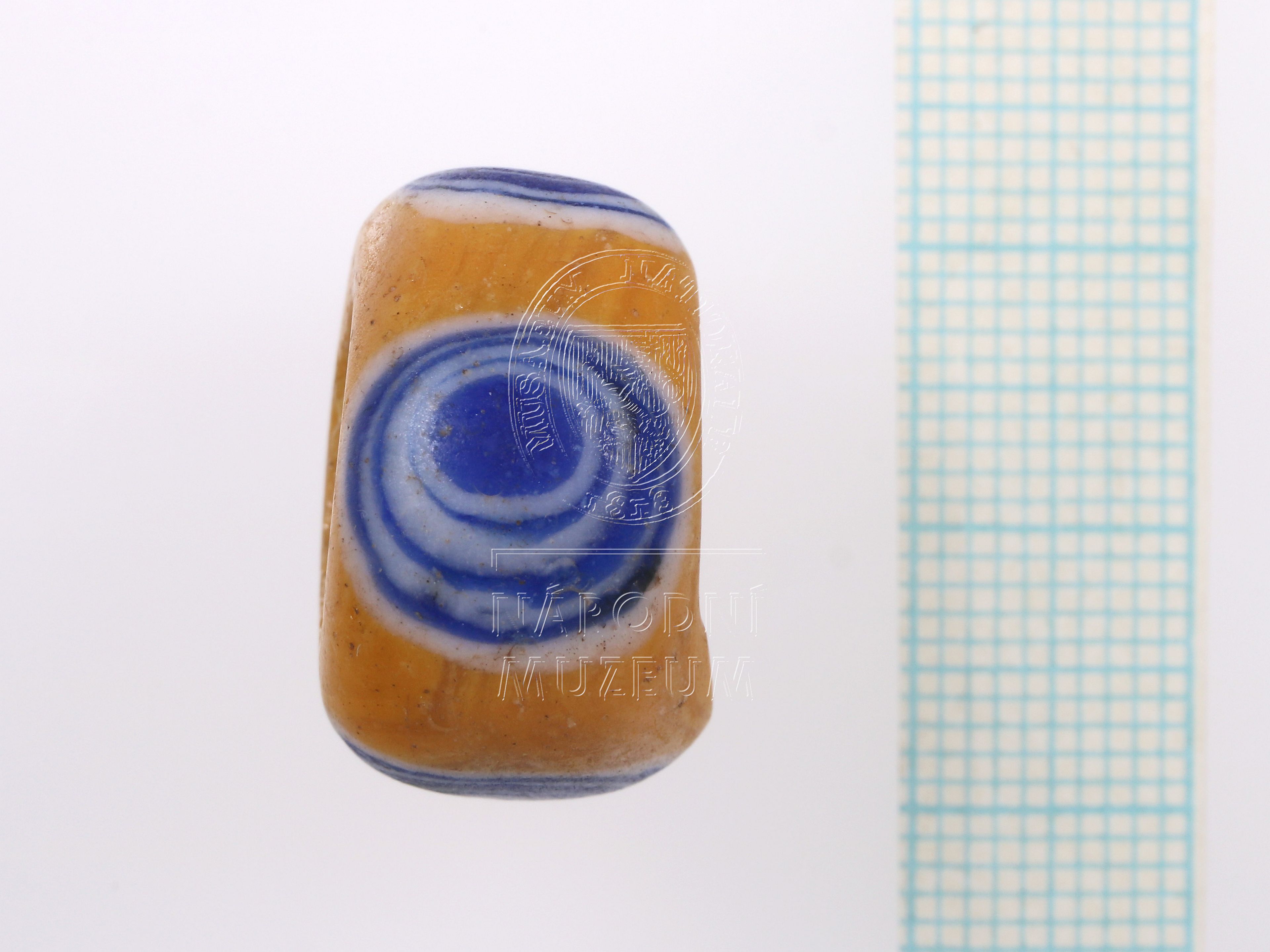 Korálek ze žlutého opakního skla s modrobílými očky, 4 očka.