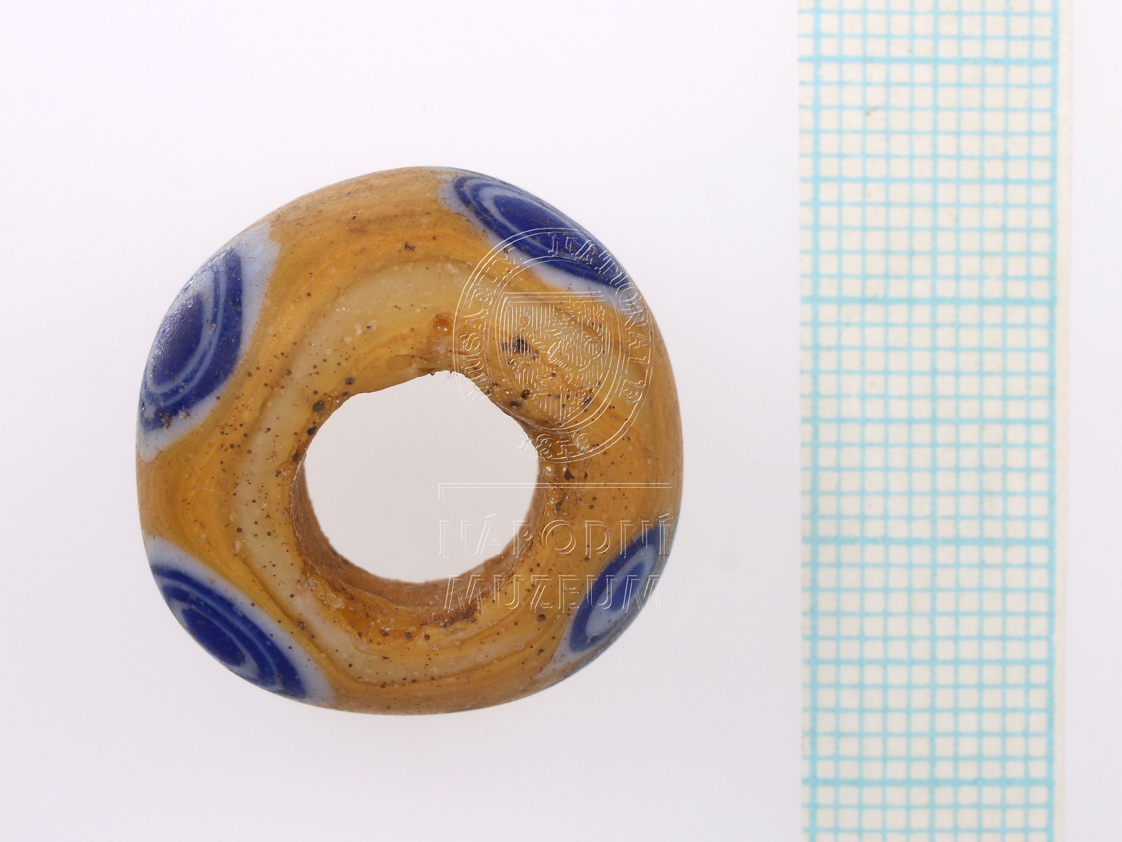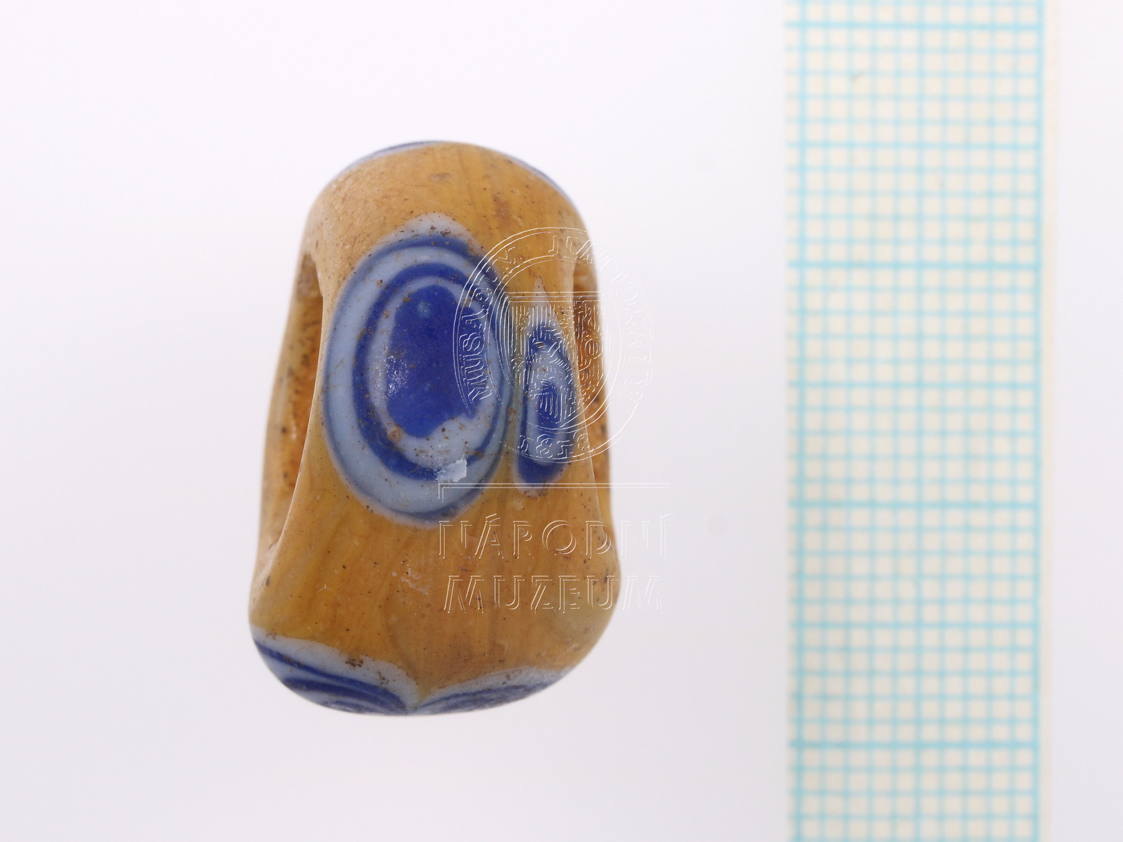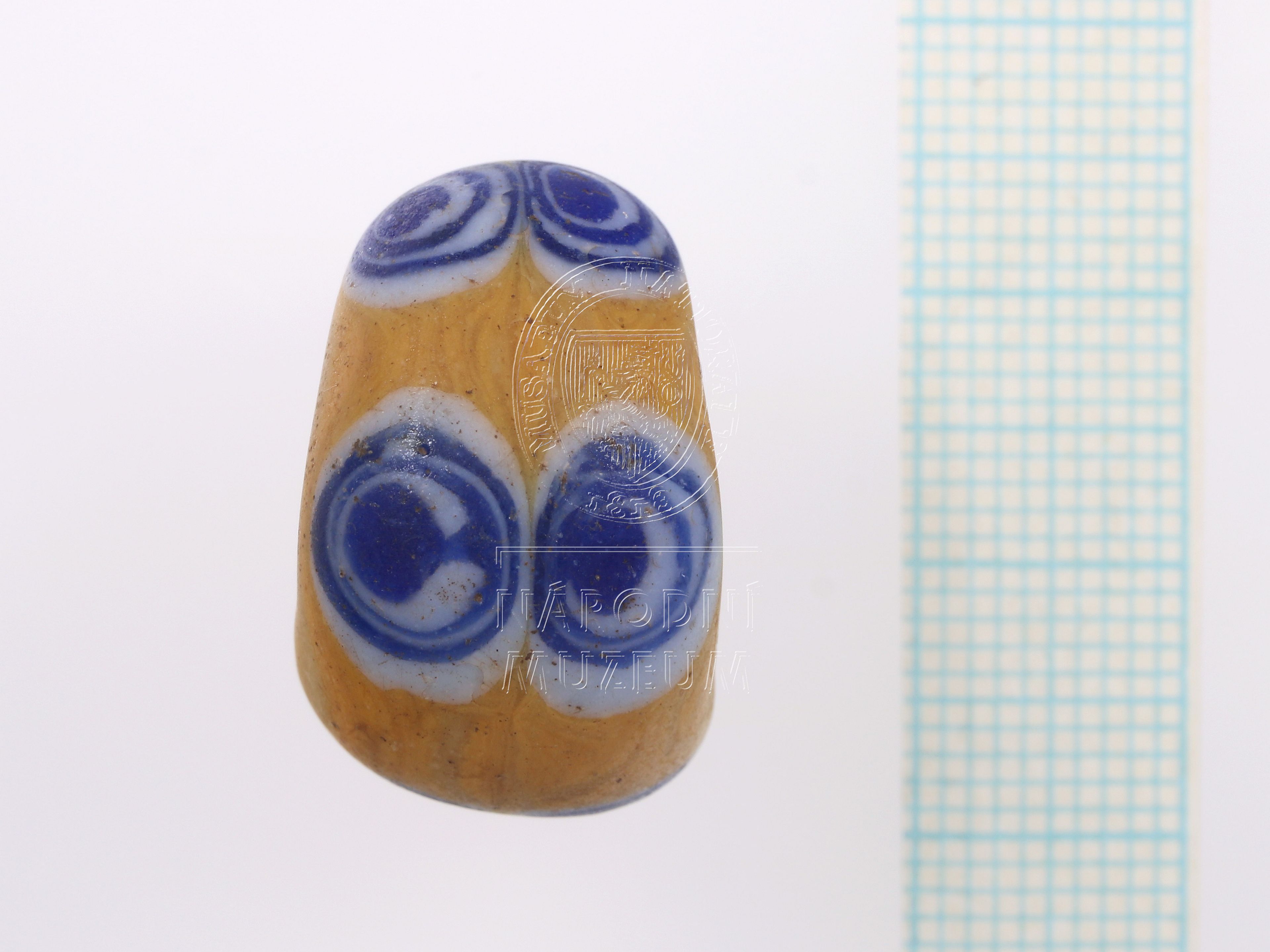 Korálek ze žlutého opakního skla s modrobílými očky, 4 očka ve dvou řadách nad sebou.