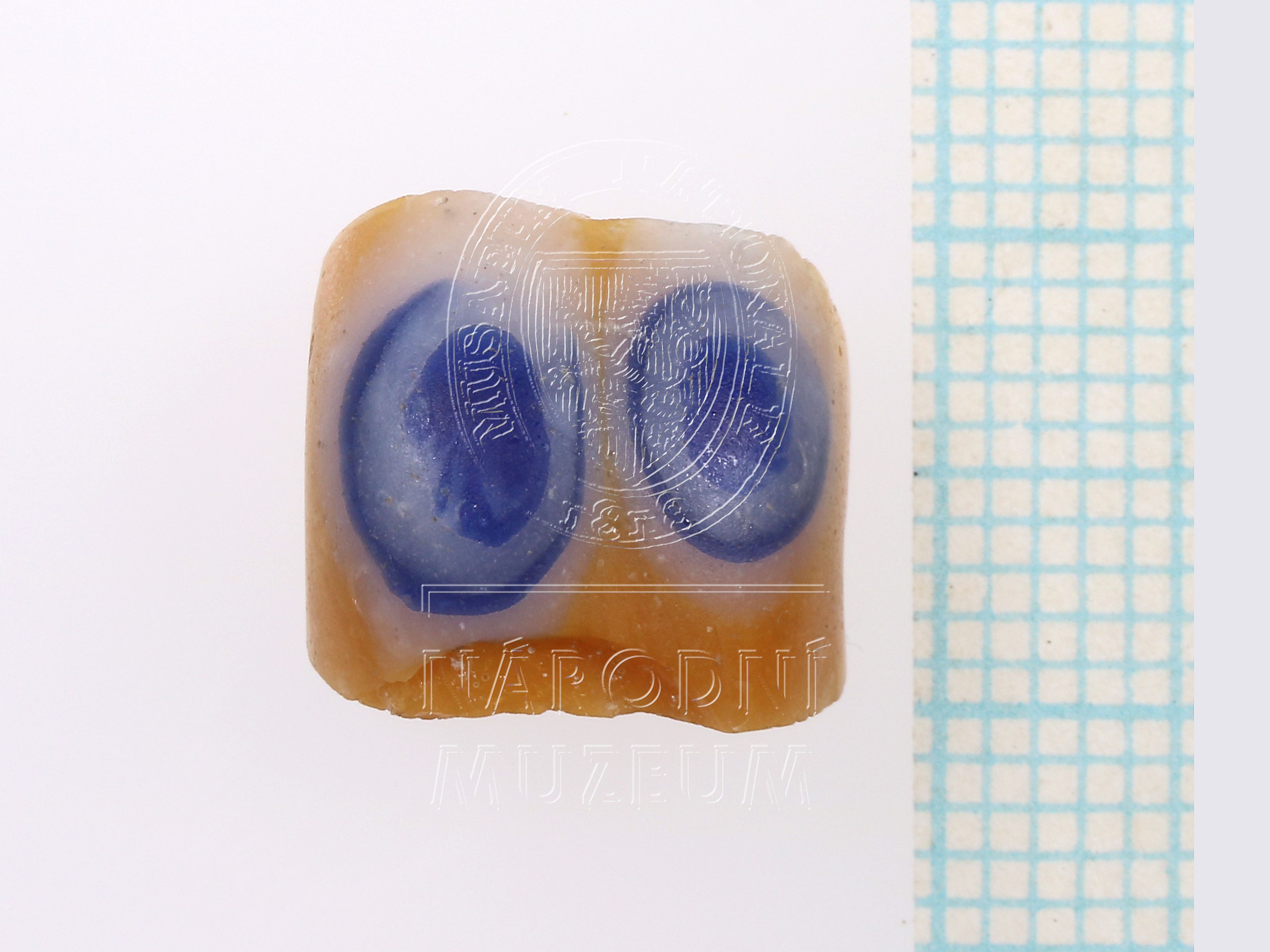 Zlomek válcovitého korálku ze žlutého opakního skla s výzdobou z modrobílých dvakrát vrstvených oček sestavených ve 4 skupinách po dvou.