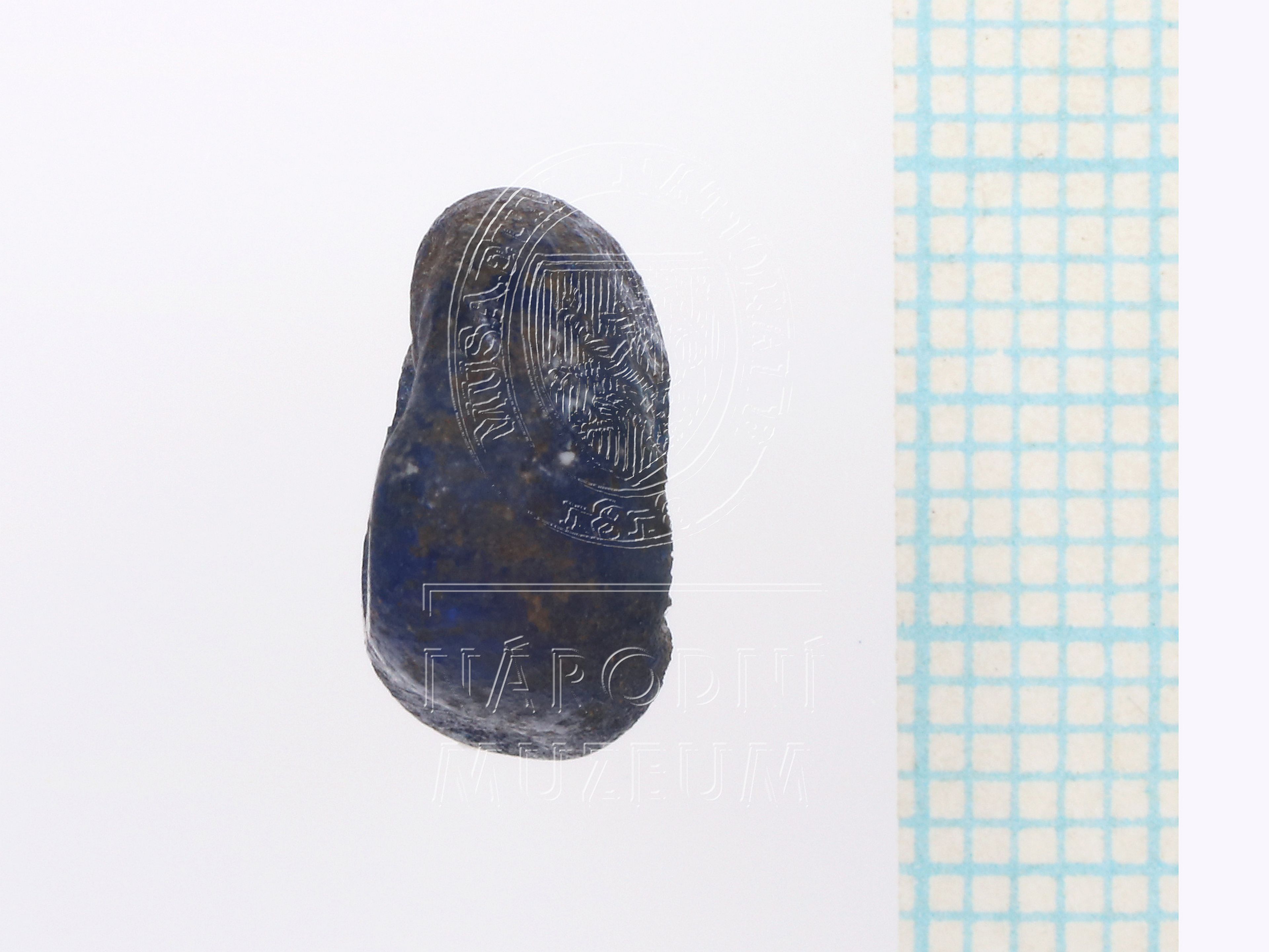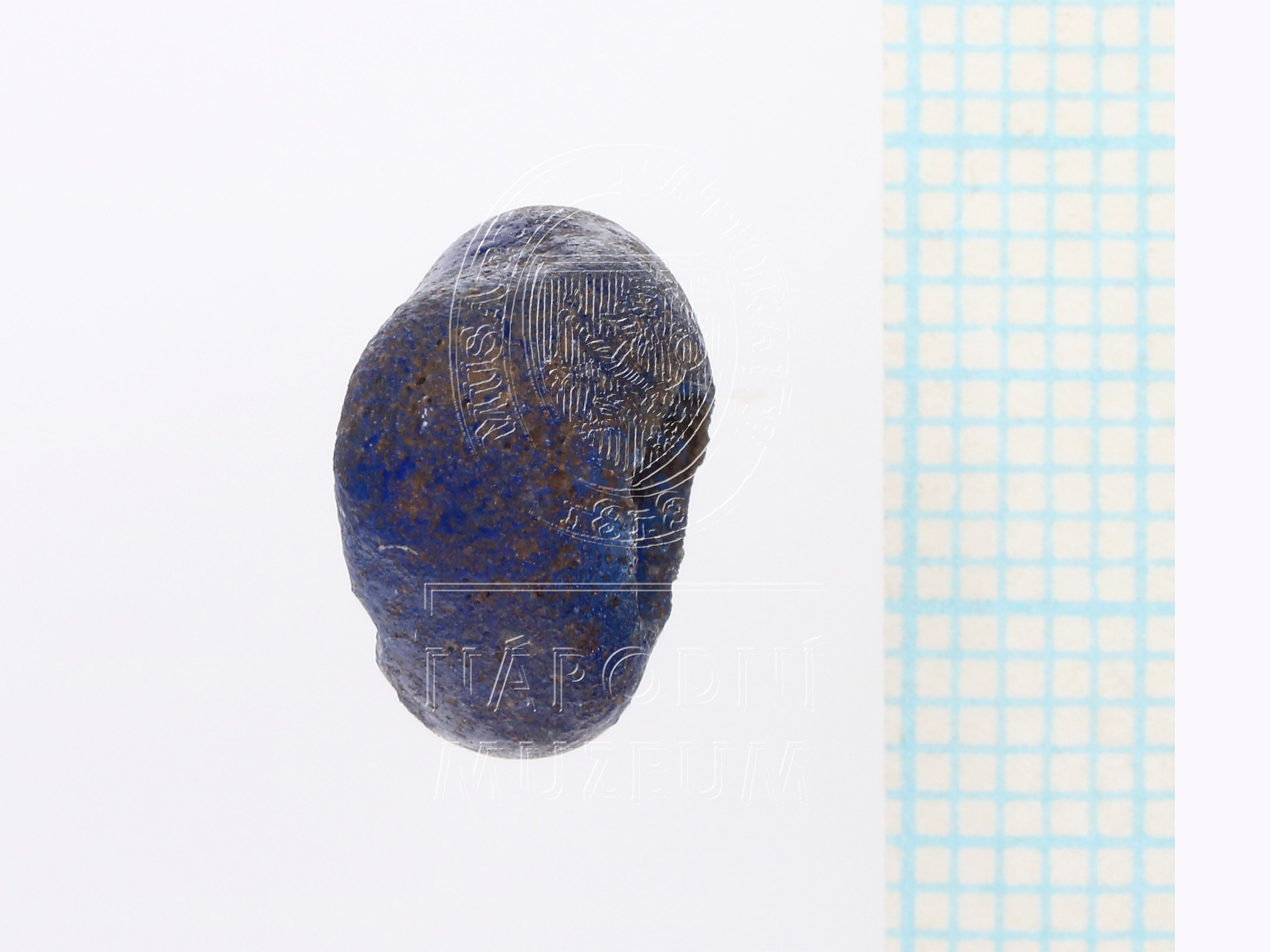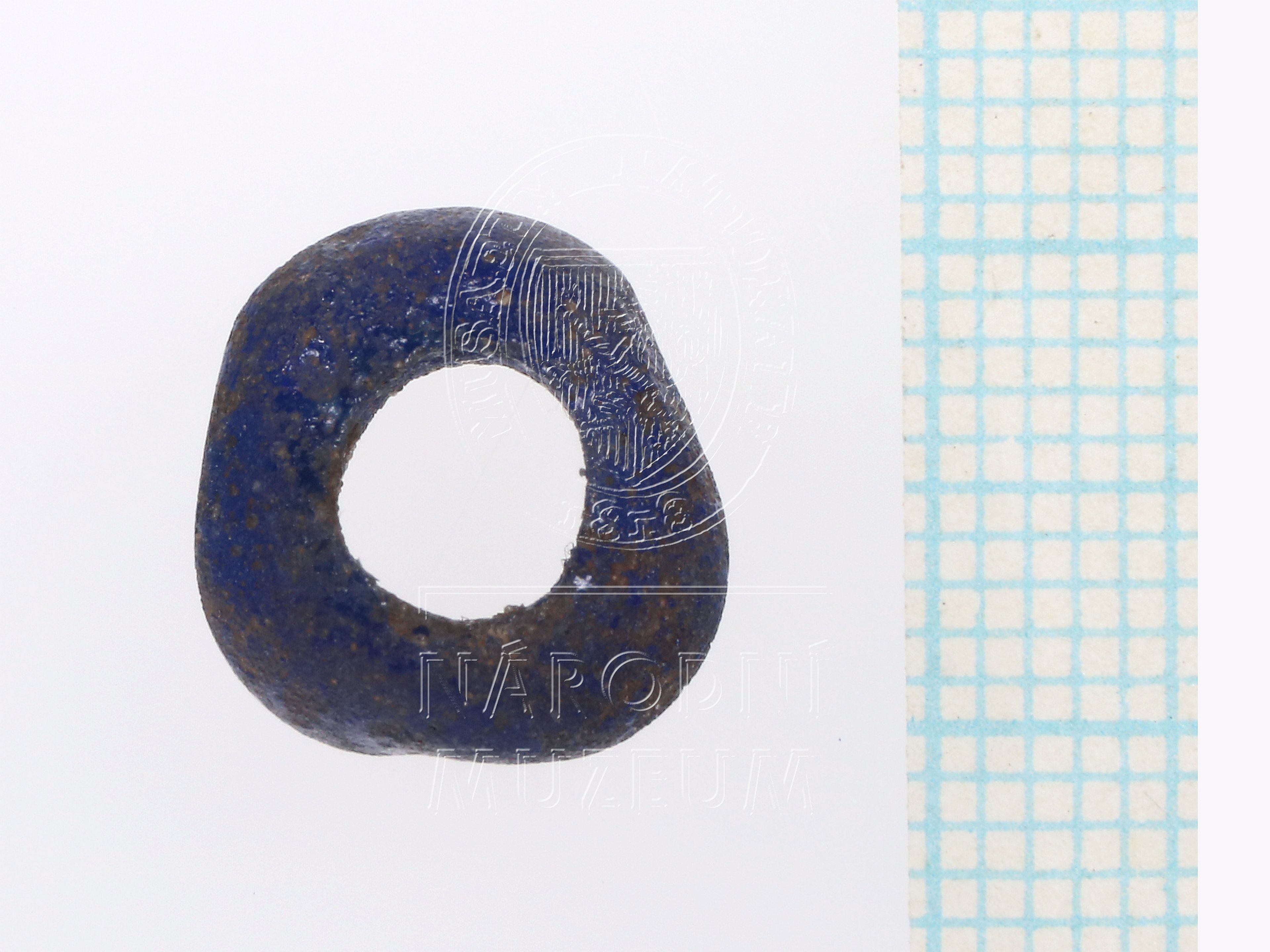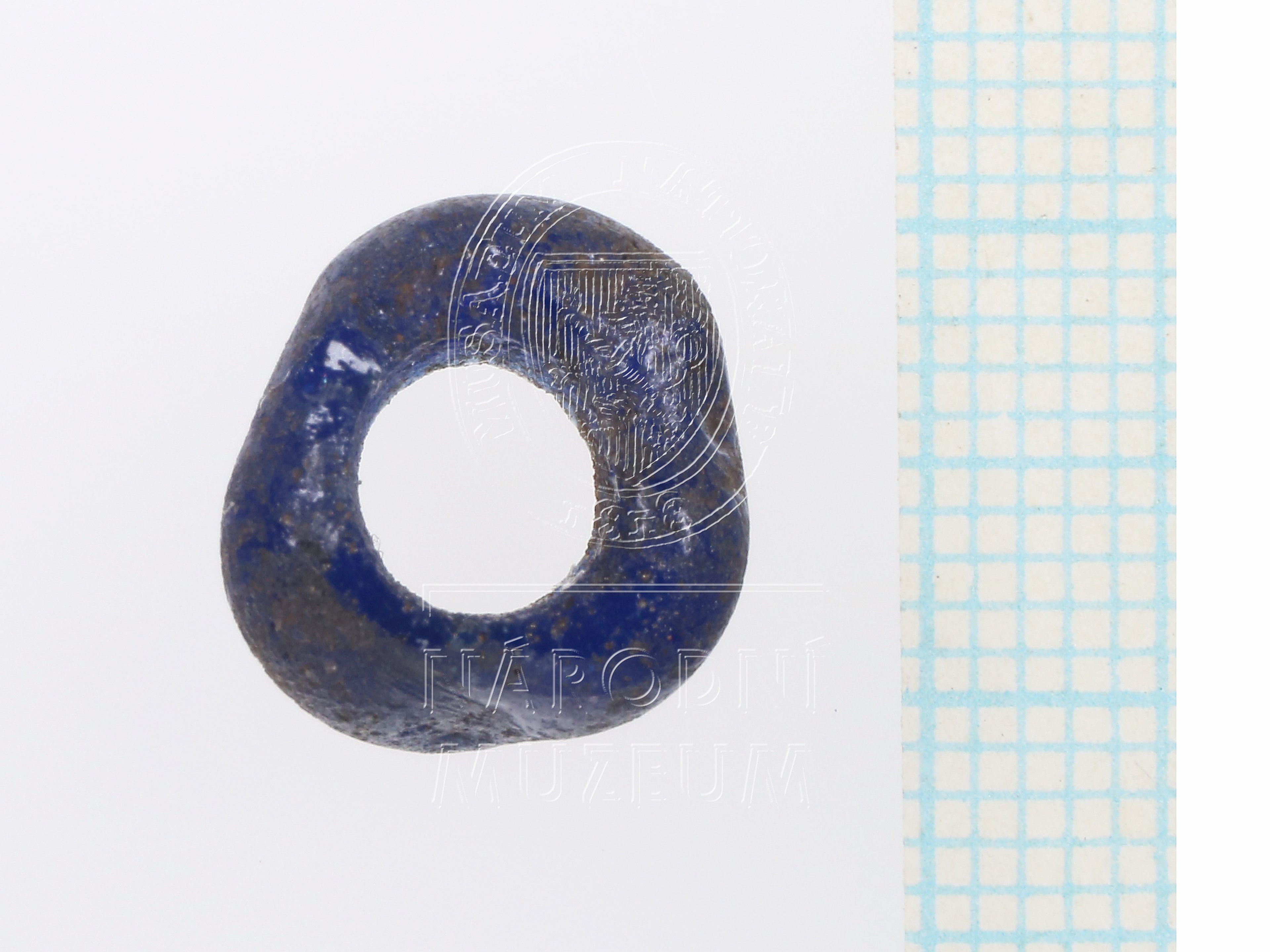 Malý čočkovitý korálek z modrého skla, nepravidelně tvarovaný.