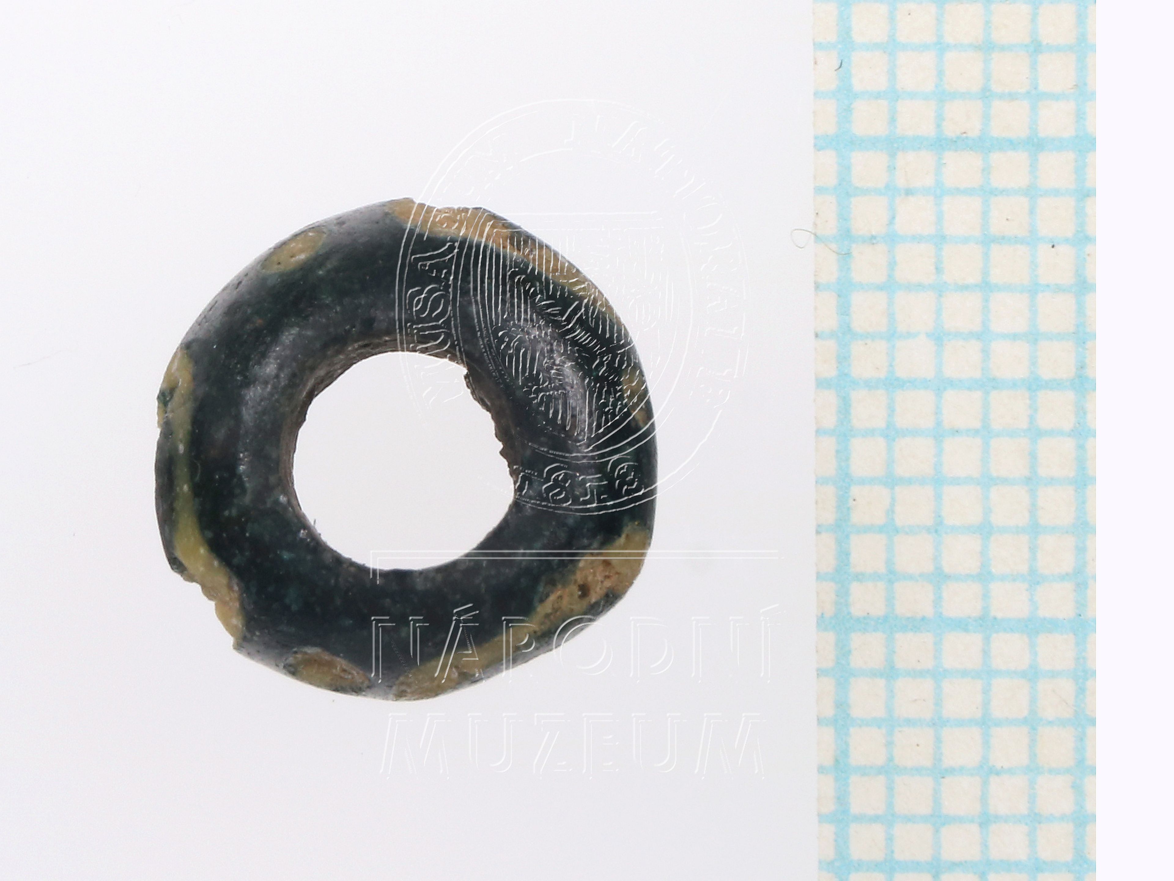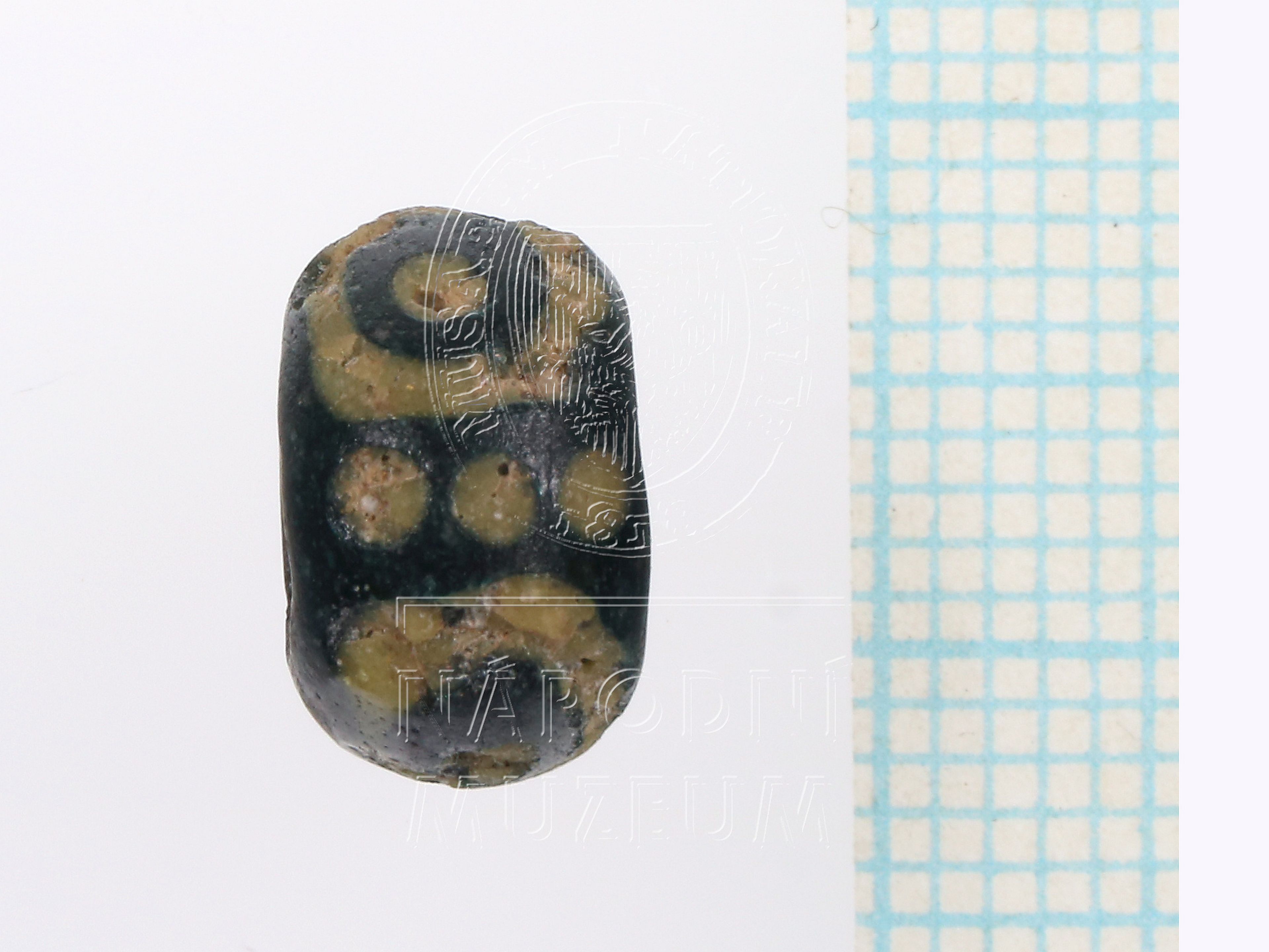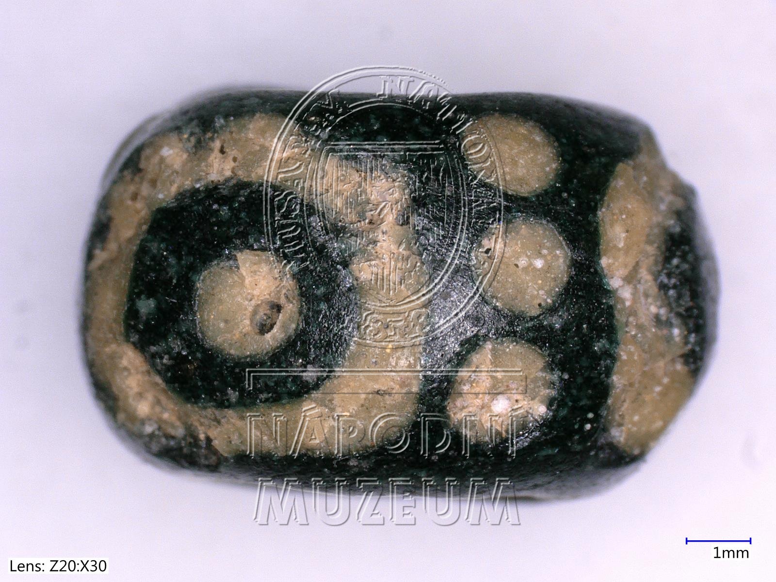 Čočkovitý korálek z tmavě modrého až černého skla vždy se třemi očky se středovým kroužkem, mezi nimi trojice drobných teček vše ze žlutého opakního skla, žluté sklo korodováno.
