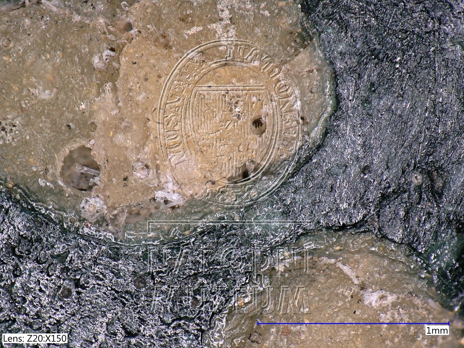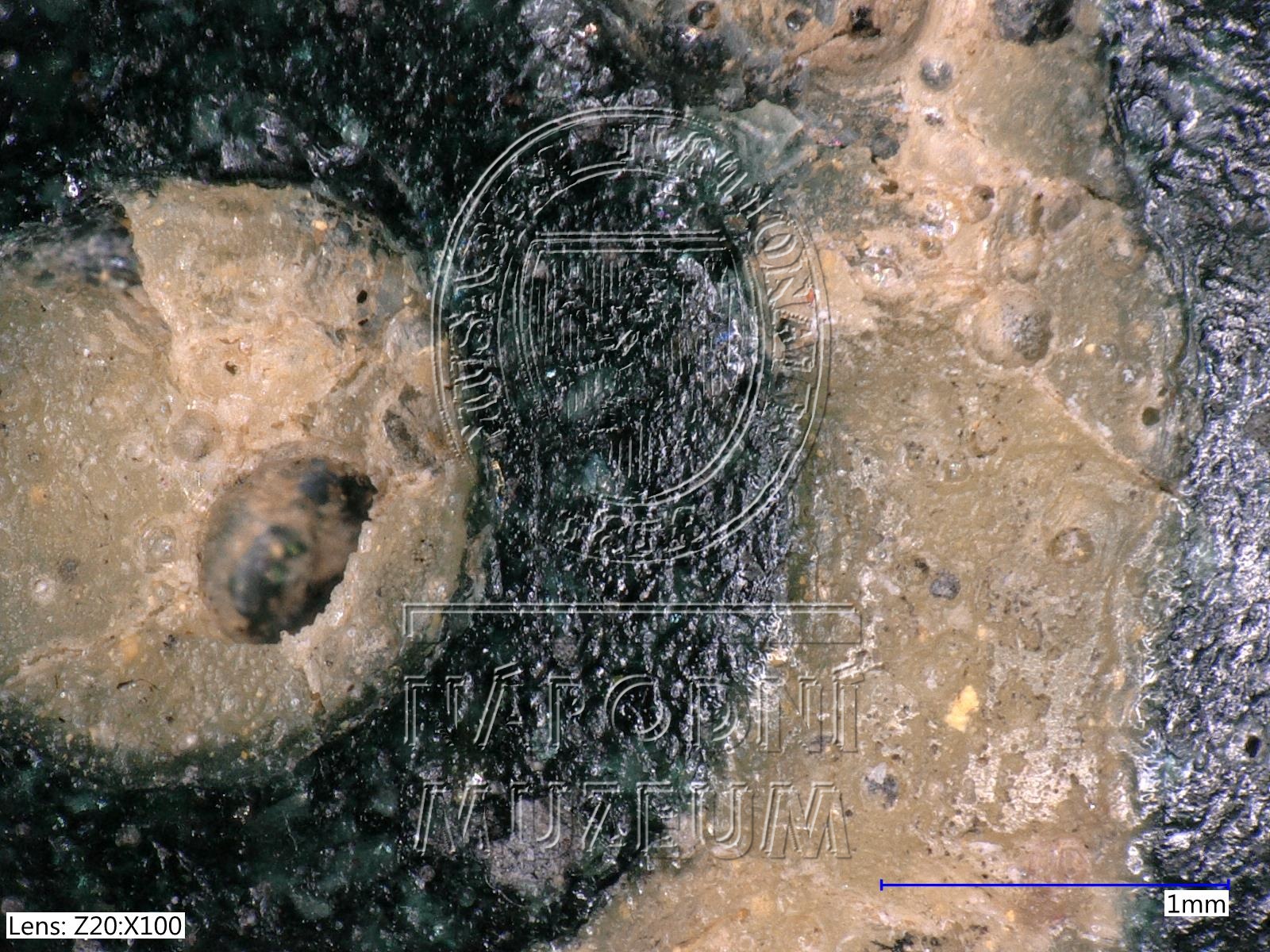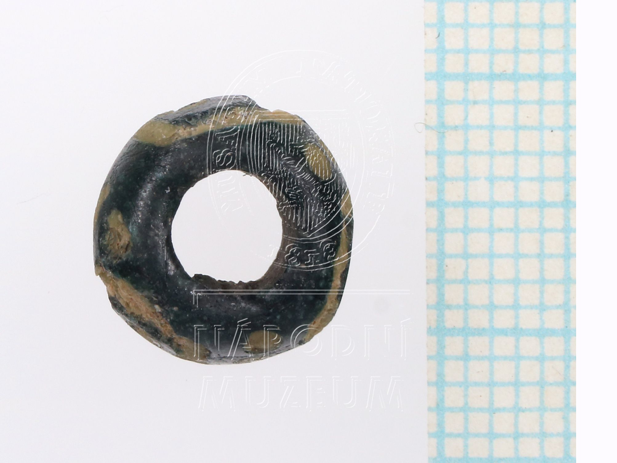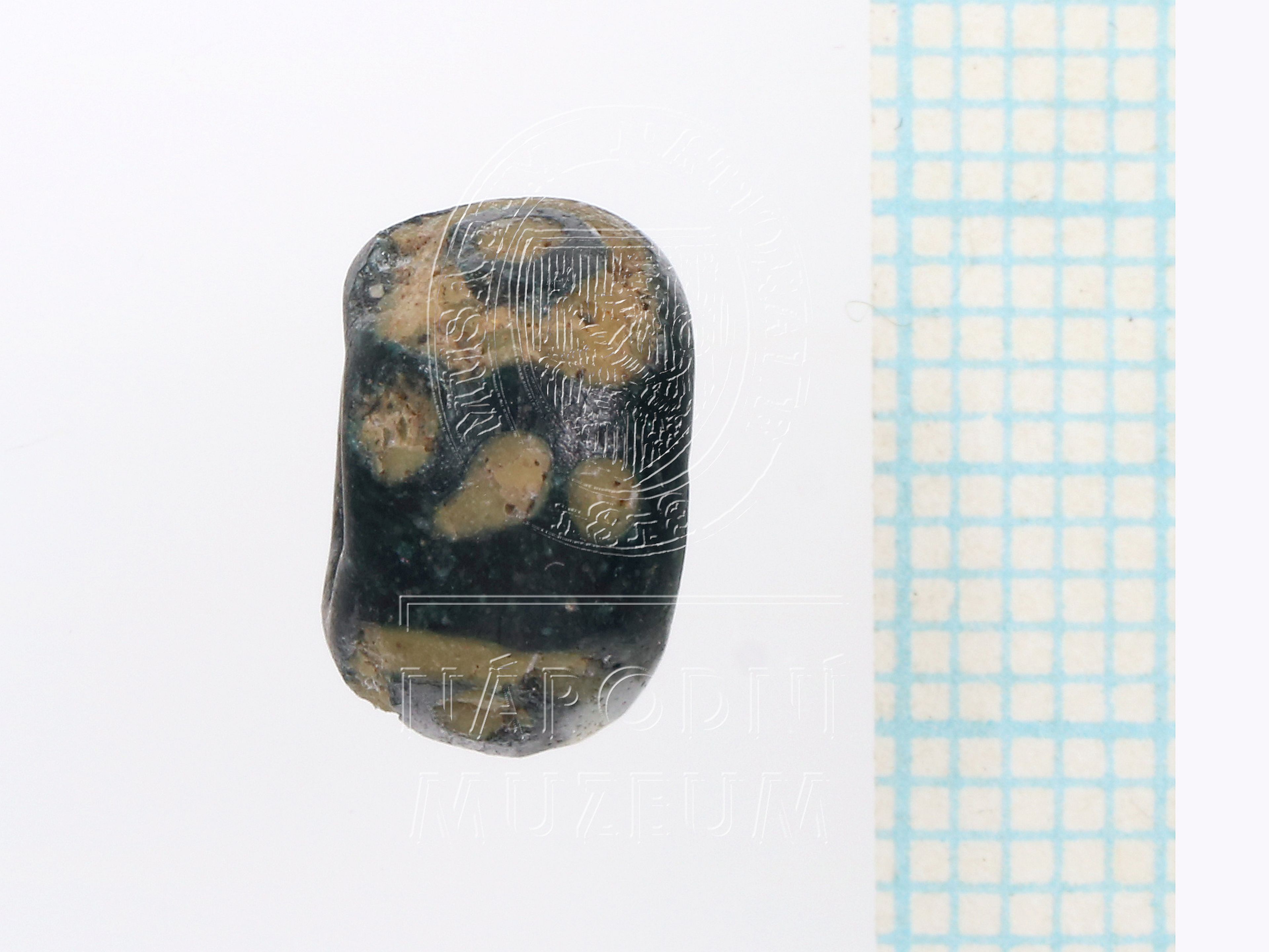 Čočkovitý korálek z tmavě modrého až černého skla vždy se třemi očky se středovým kroužkem, mezi nimi trojice drobných teček vše ze žlutého opakního skla, žluté sklo korodováno.