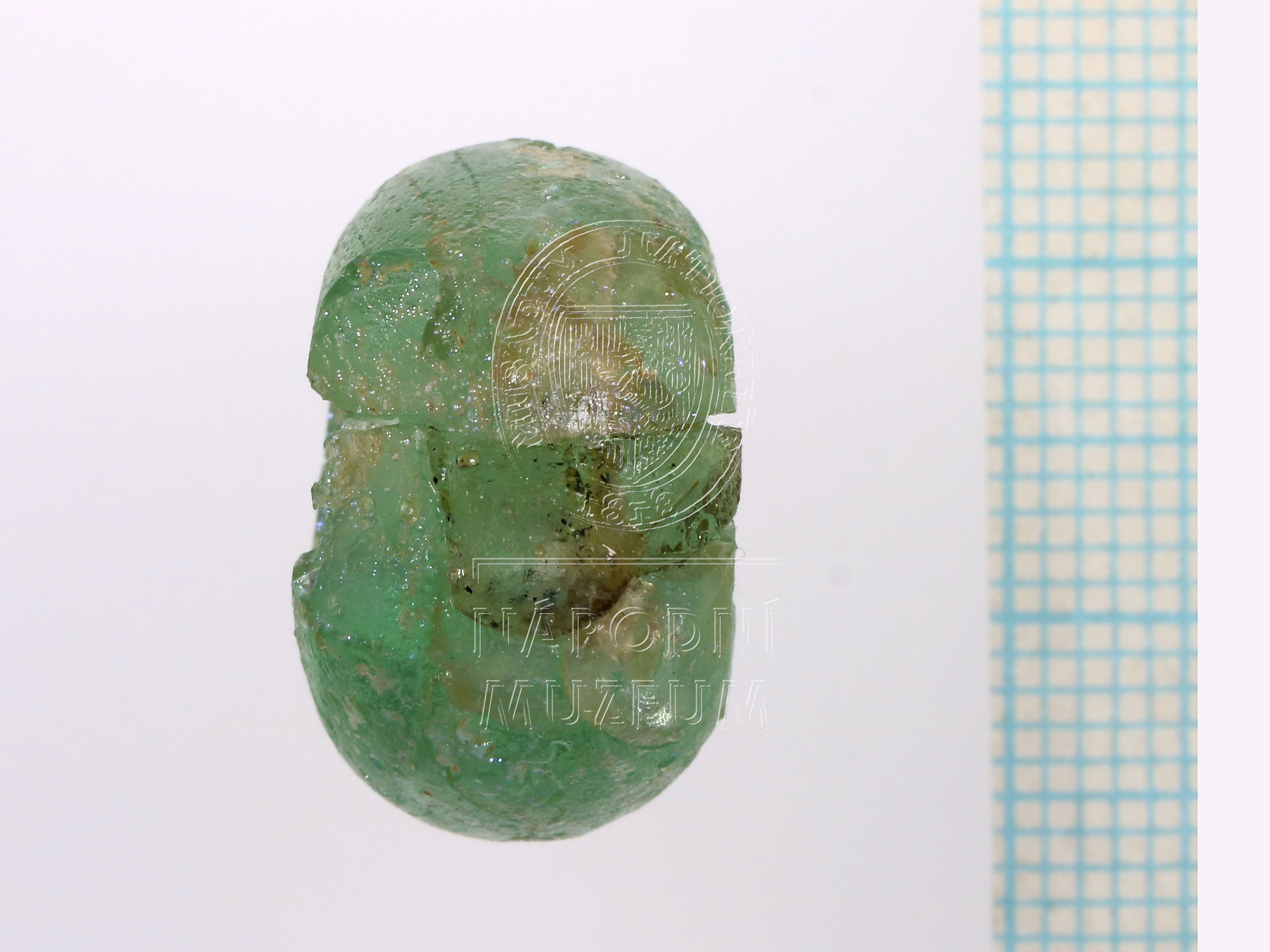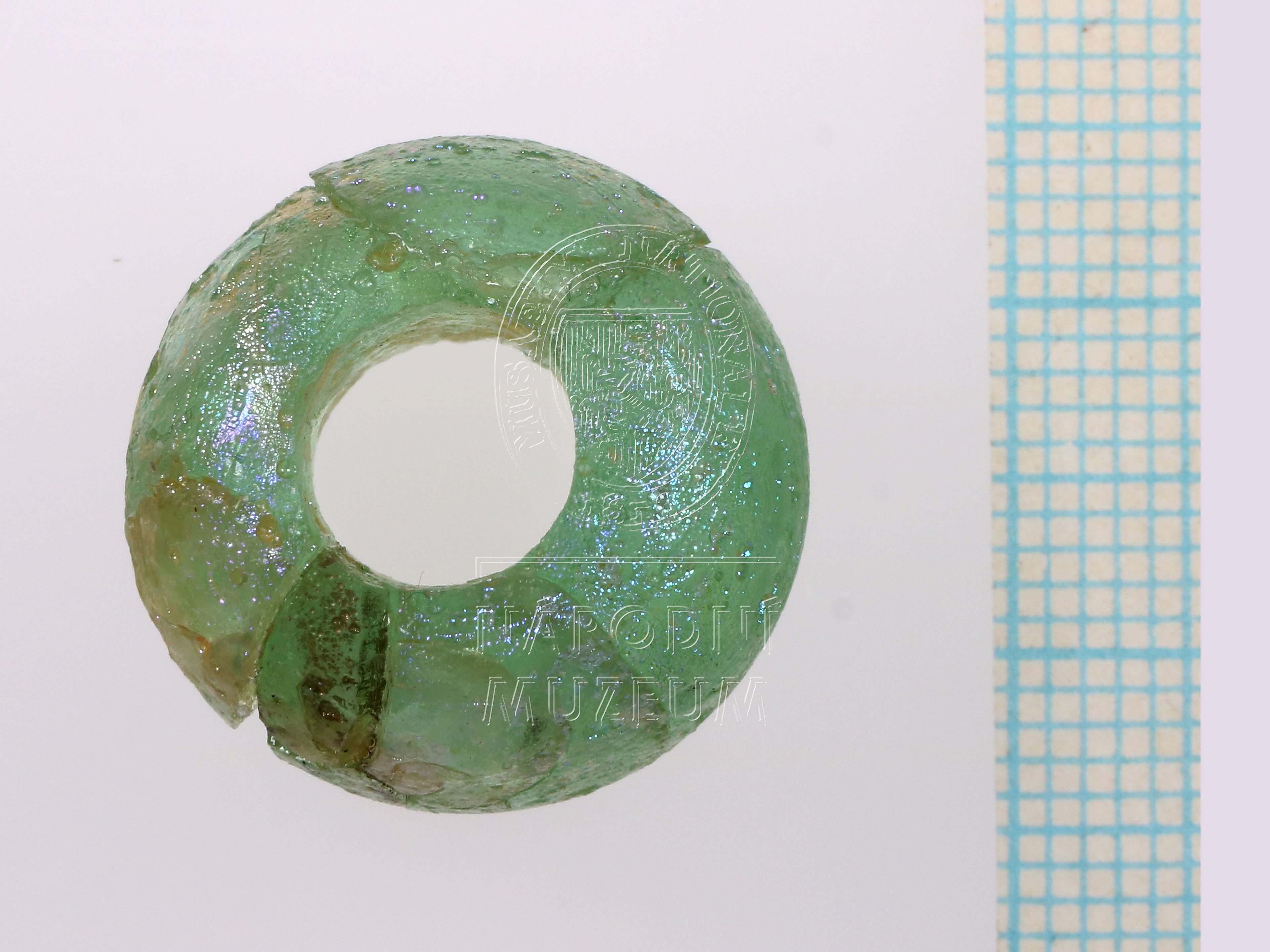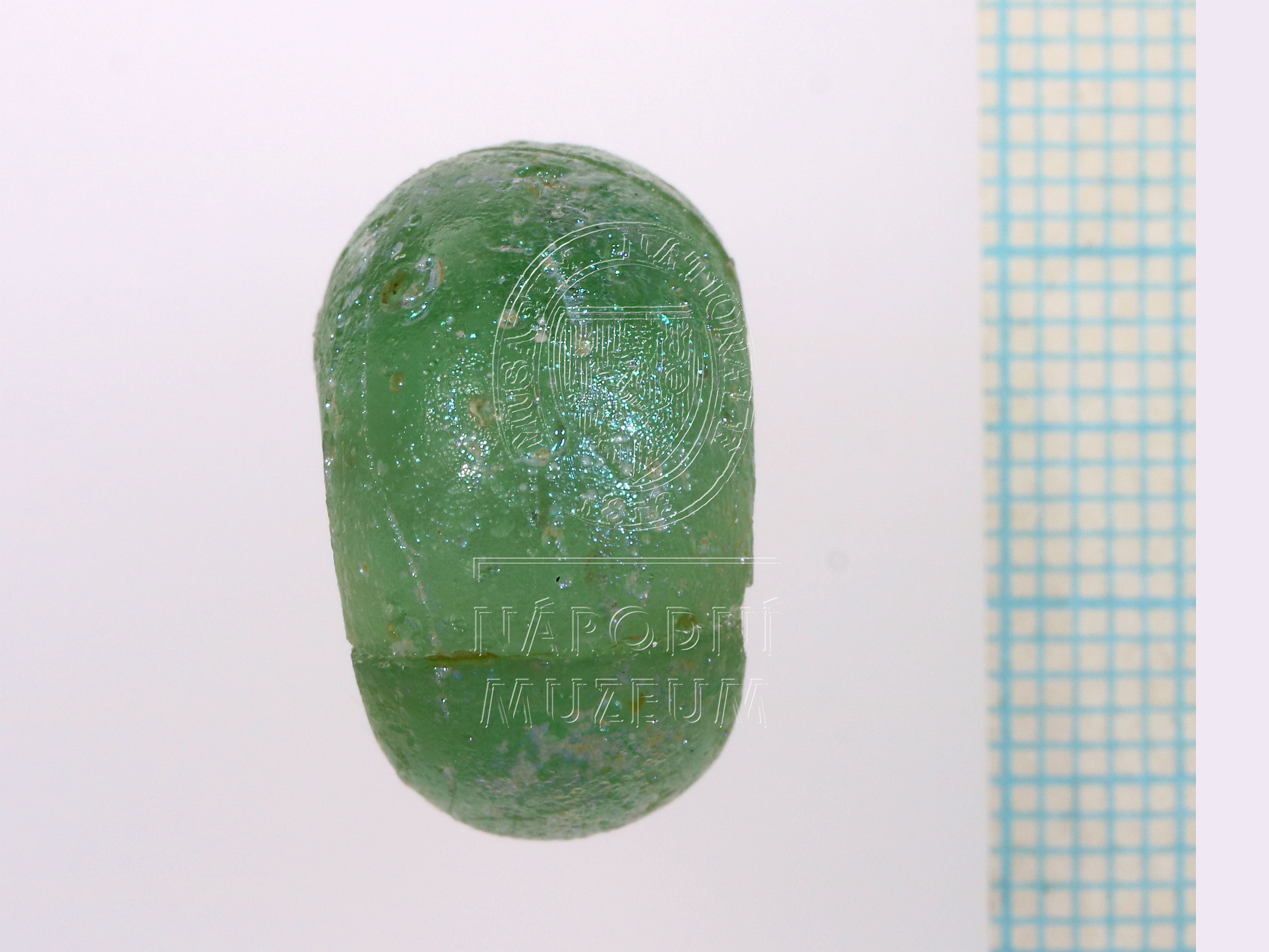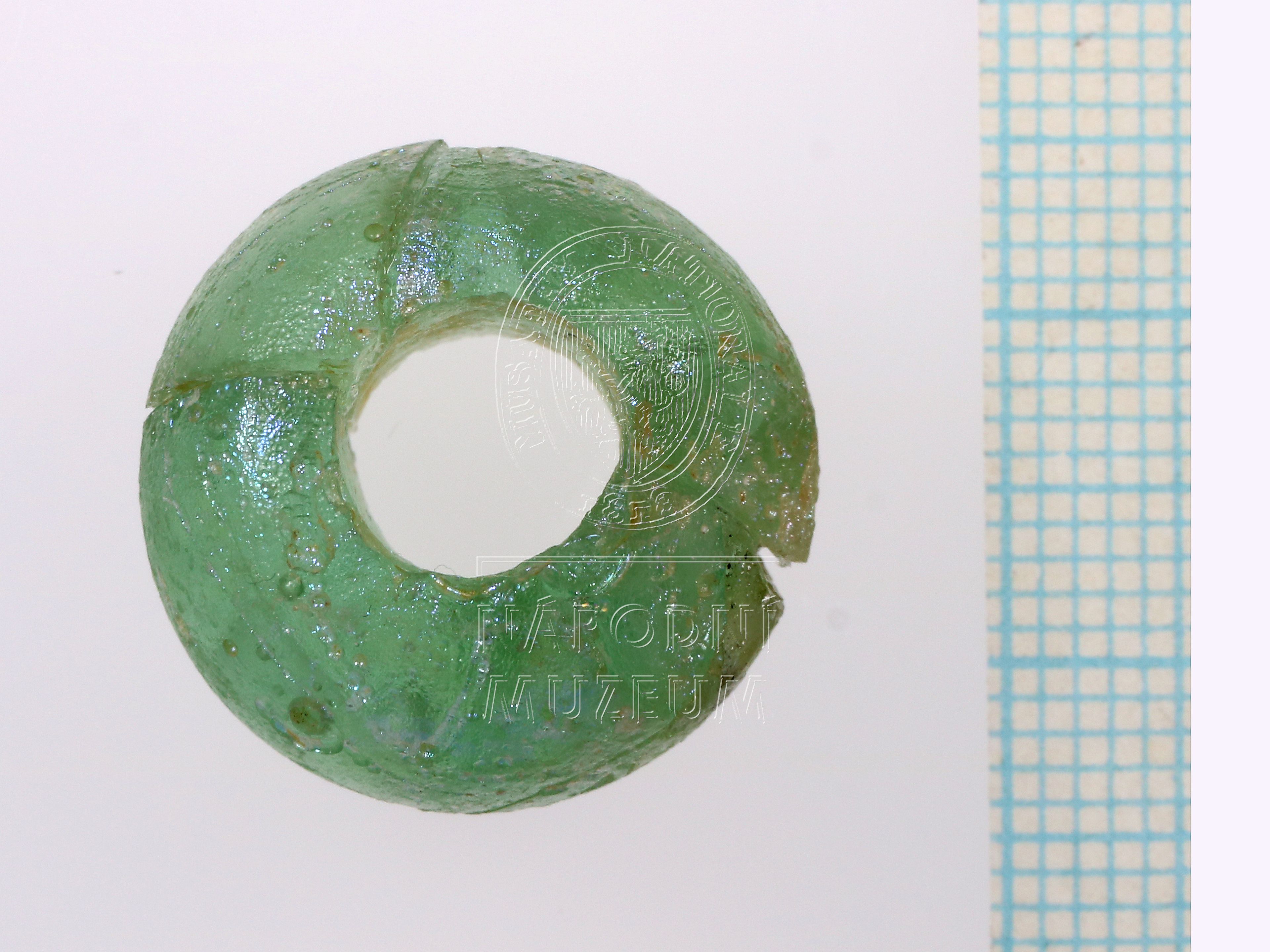 Čočkovitý korálek z průsvitného nazelenalého skla.
