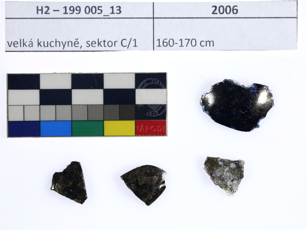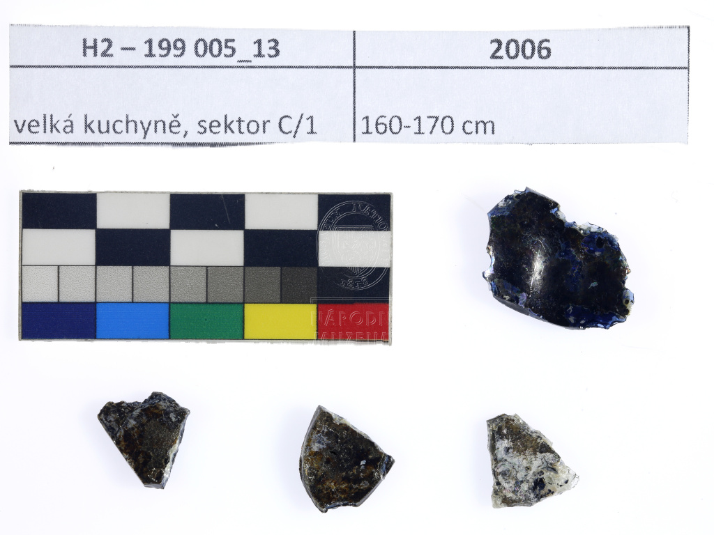 Pět skleněných fragmentů okenního terčíku a tmavé nádoby.
