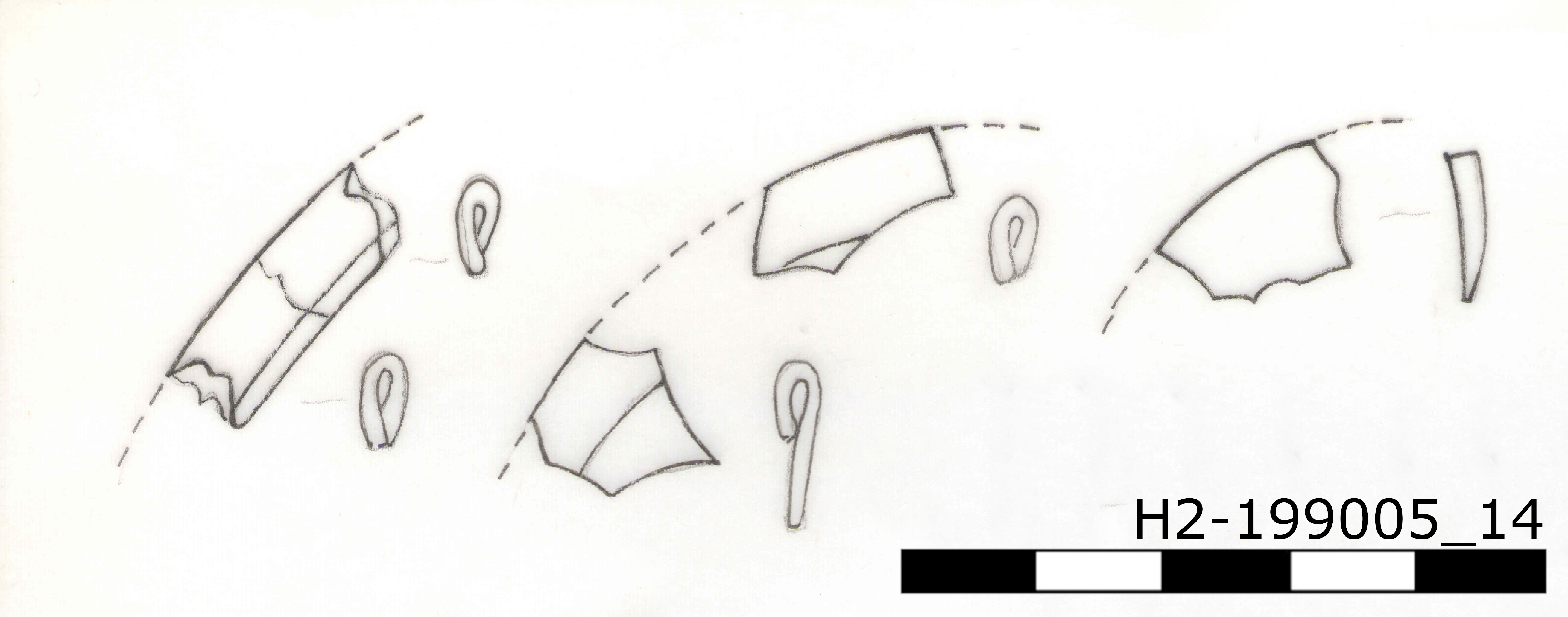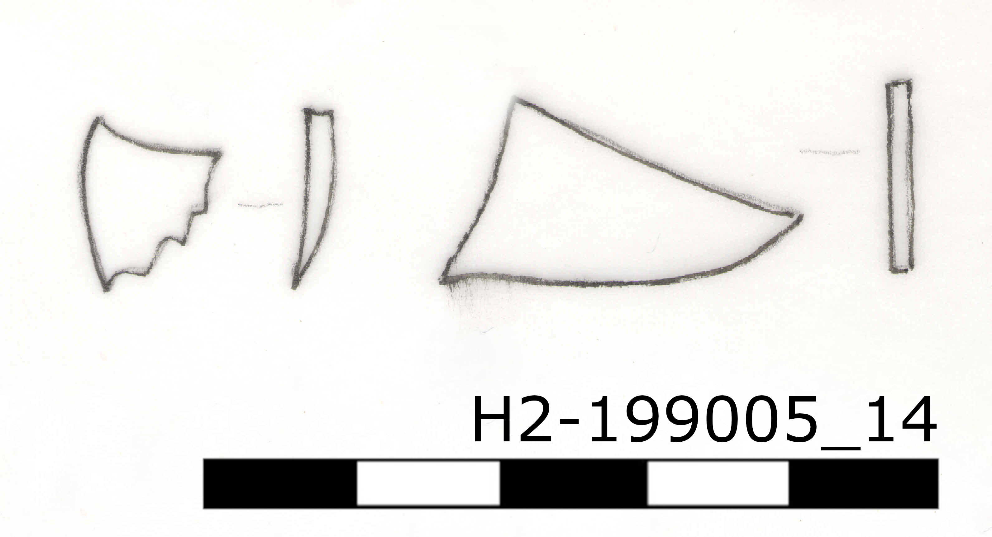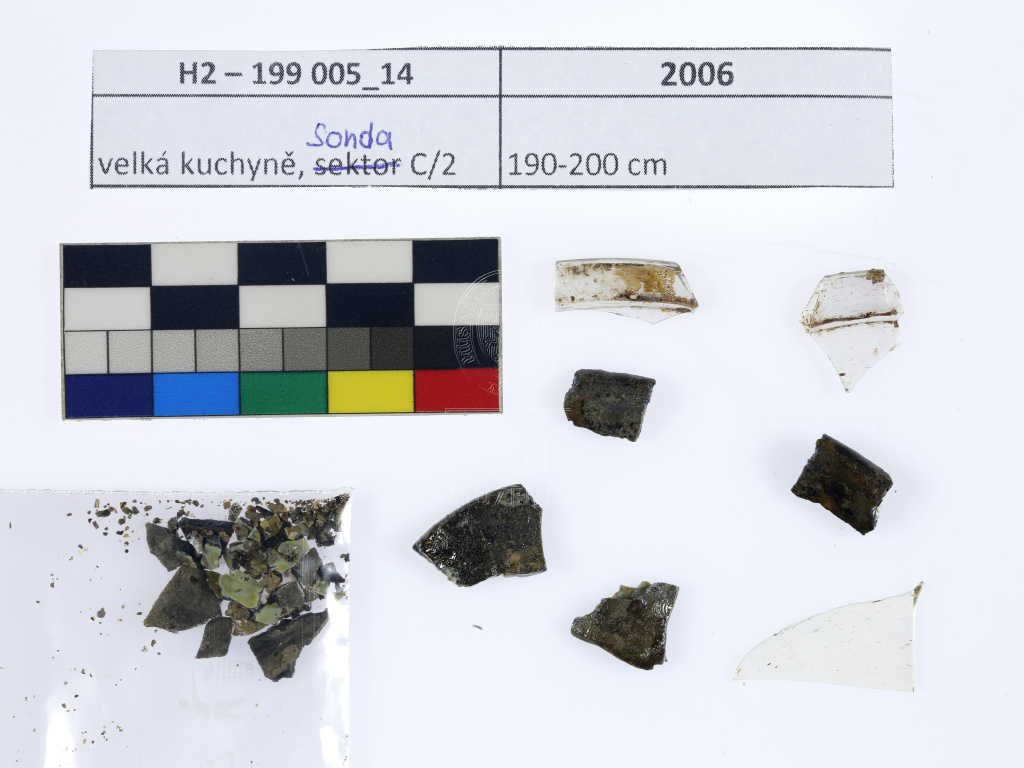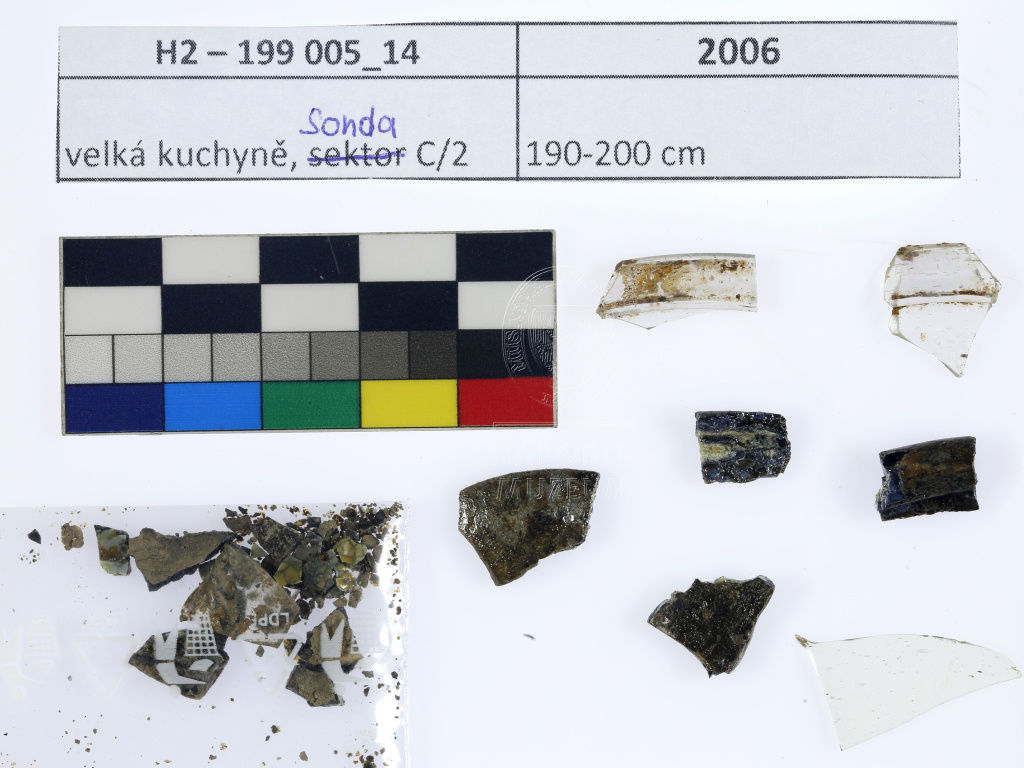 Šest fragmentů ze tří předmětů (okenní terčík/dýnko, okenní terčík, snad nádoba) a drť.