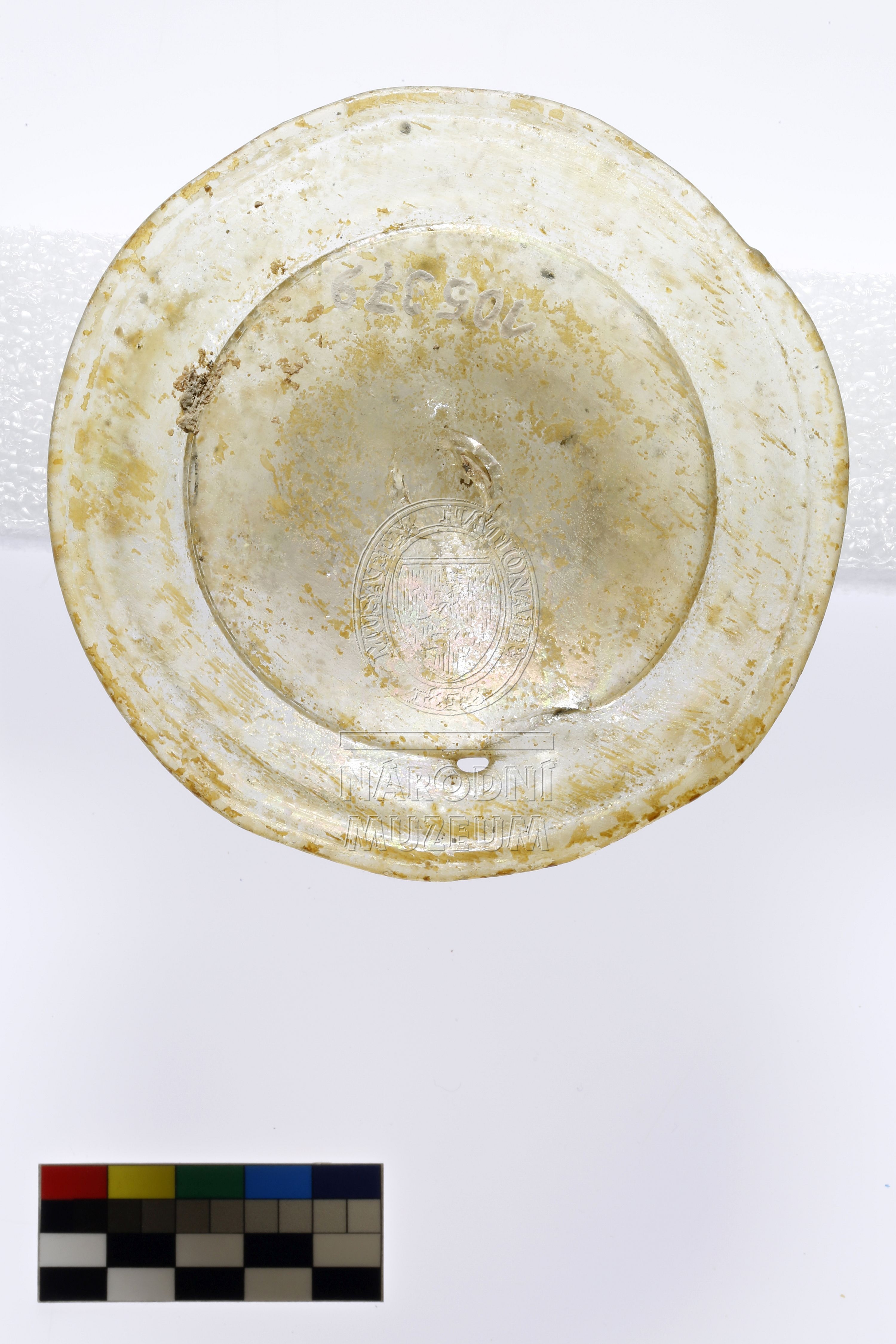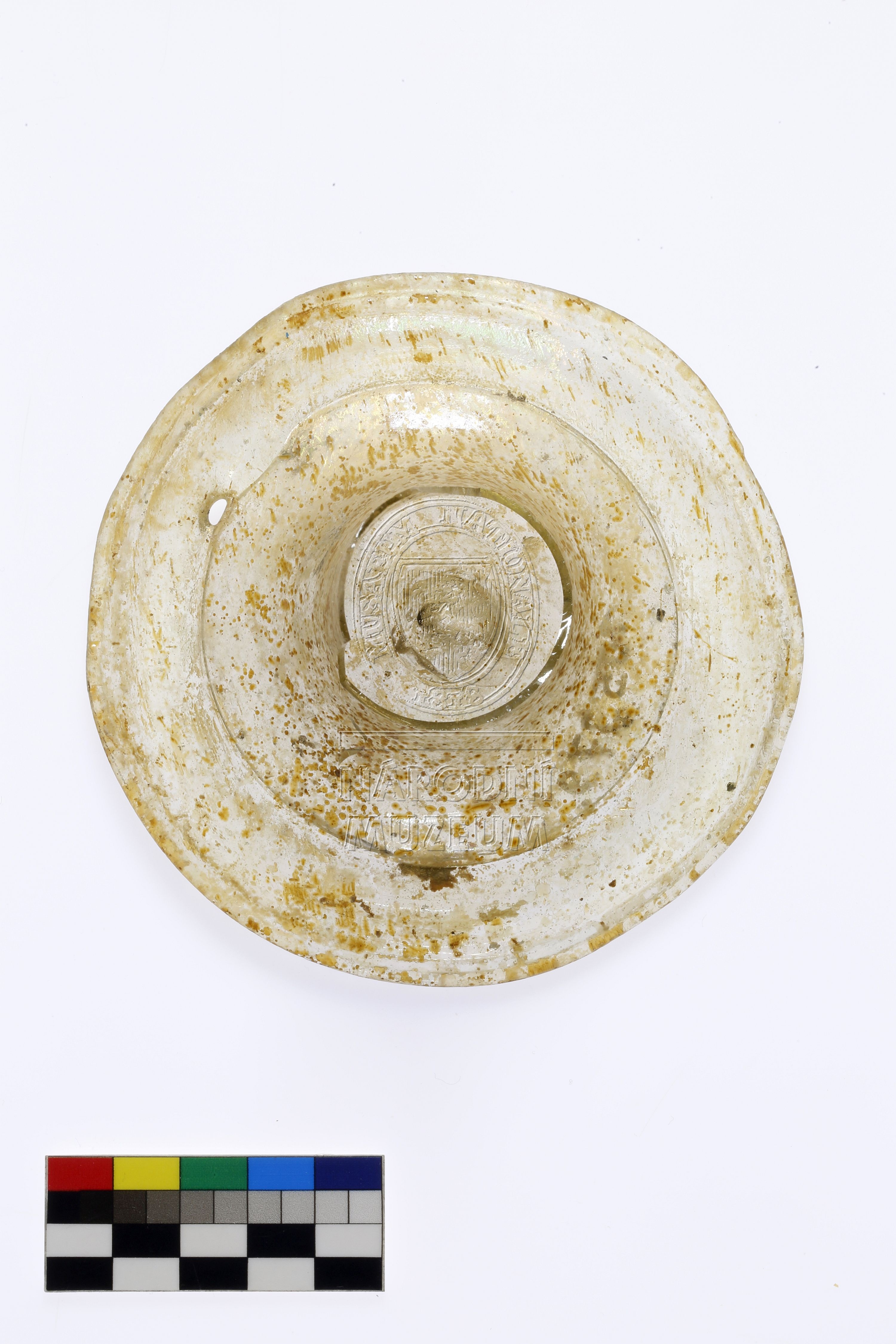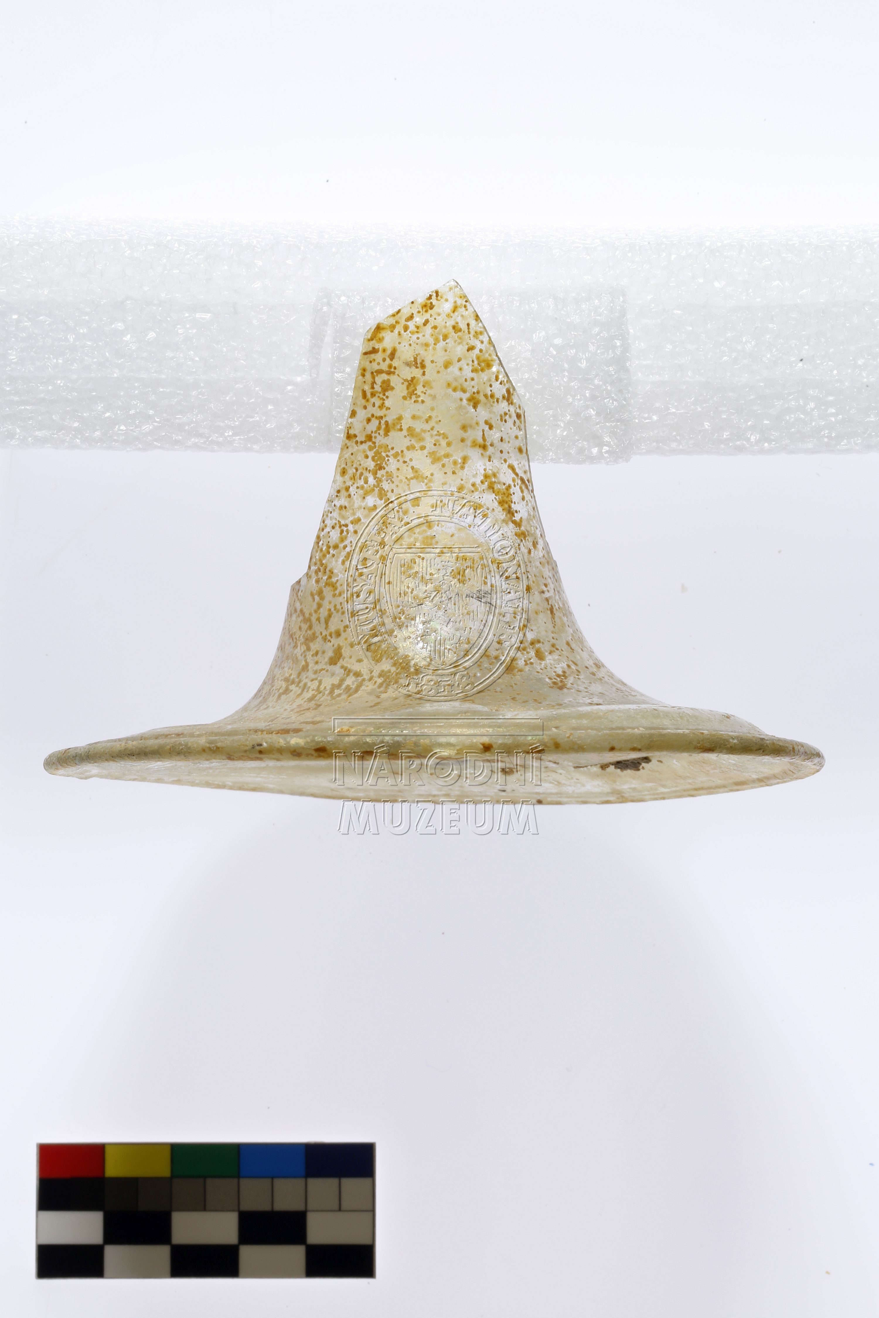 Celistvá patka číše českého typu s vypíchnutým dnem a nepravidelným hladkým okrajem z lehce nažloutlého skla, vlivem korozního poškození na povrchu žluté skvrny se záprasky ve hmotě skla.