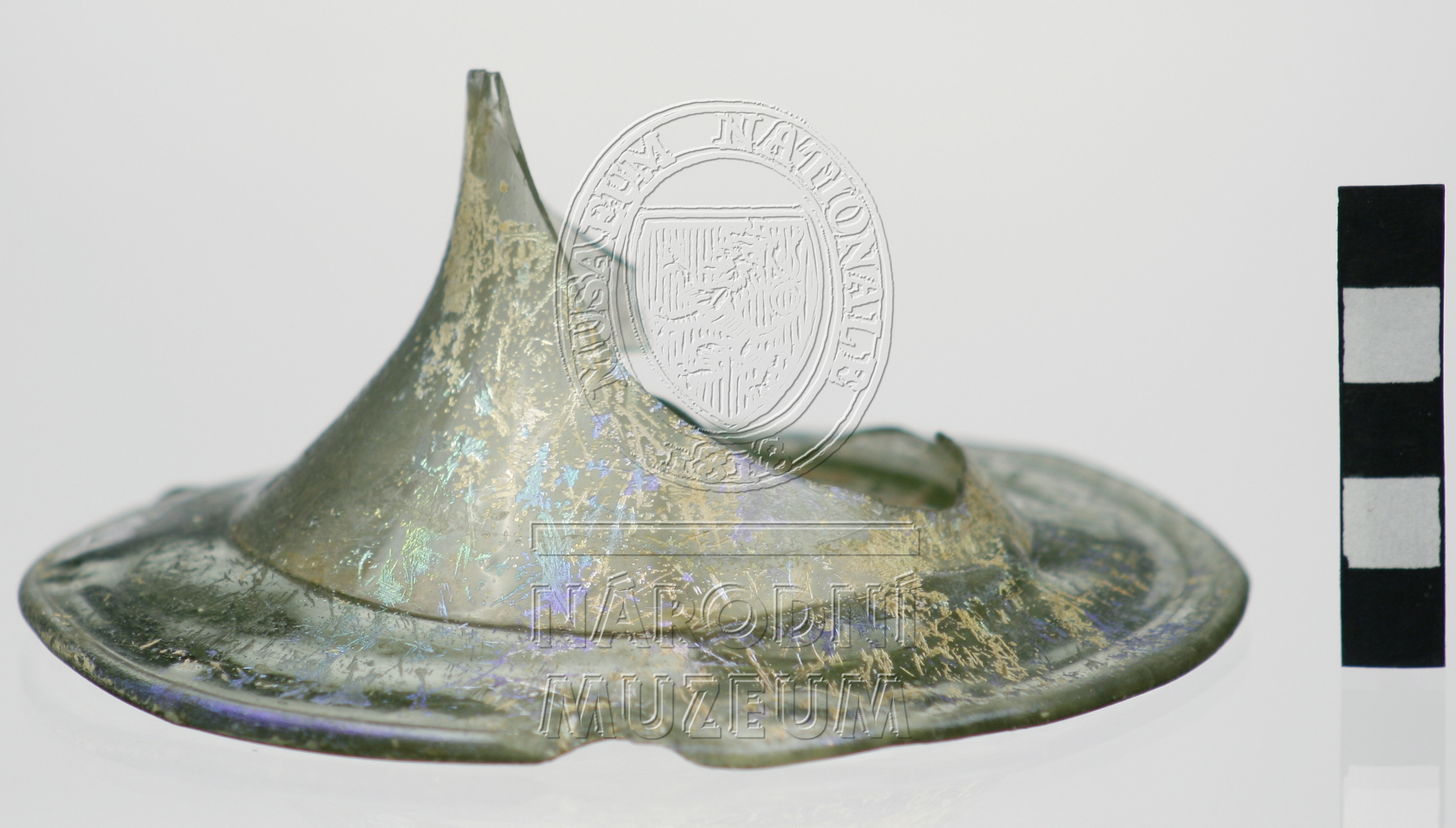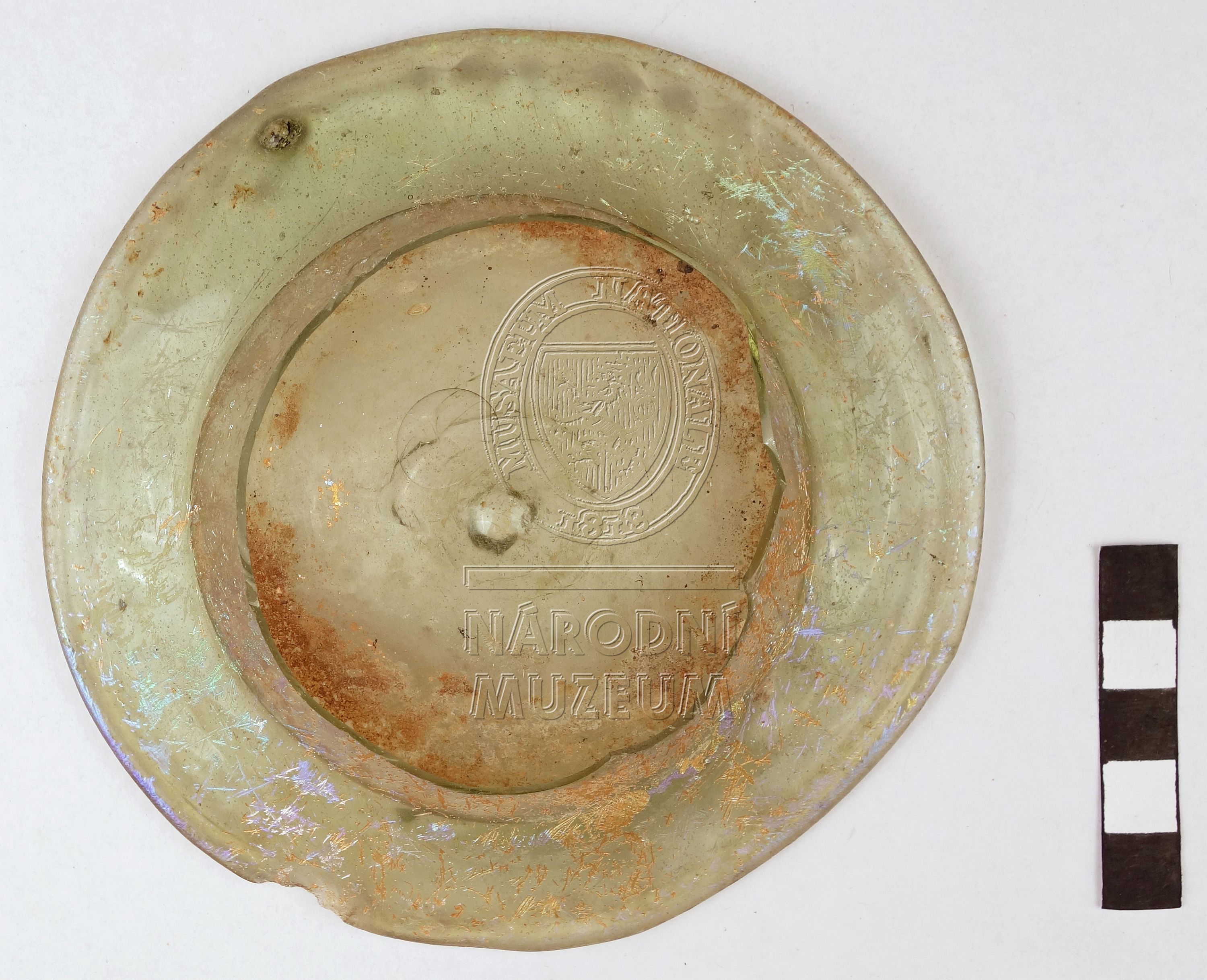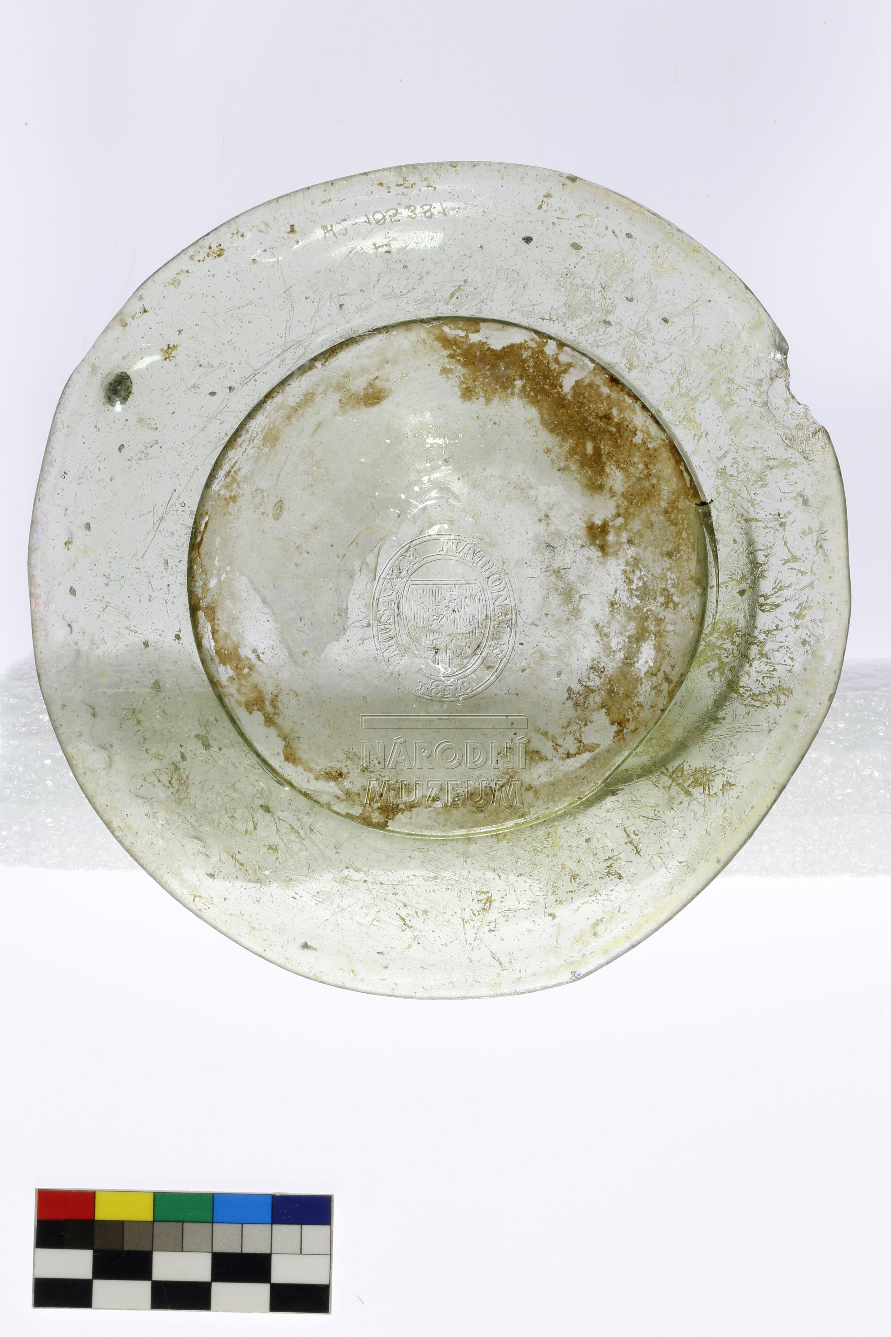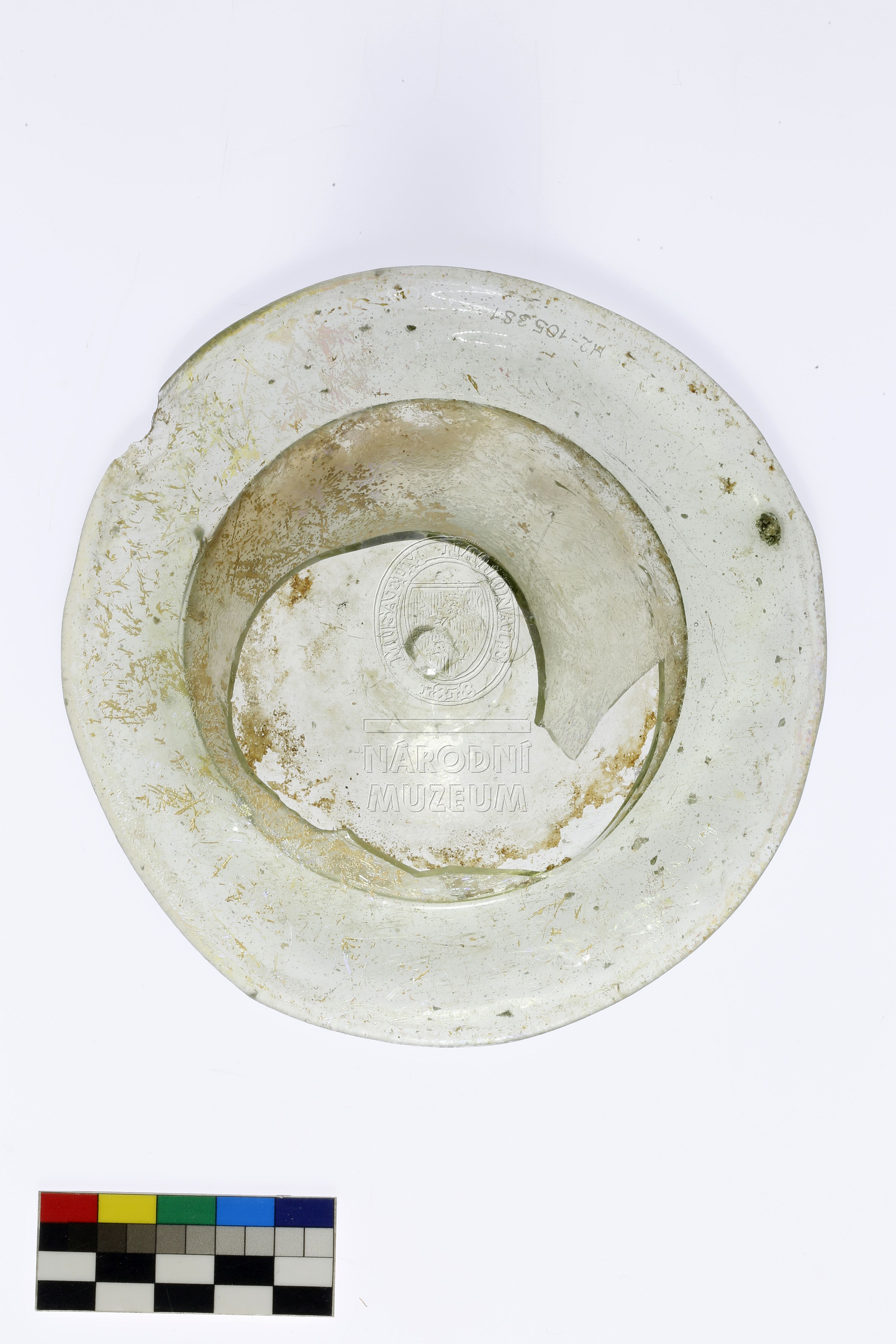 Celistvá patka číše českého typu s vypíchnutým dnem a nepravidelným hladkým okrajem z lehce nazelenalého skla, ve skle výrazné neprotaveniny, mírné korozní poškození důlkovou korozí s iridiscencí.