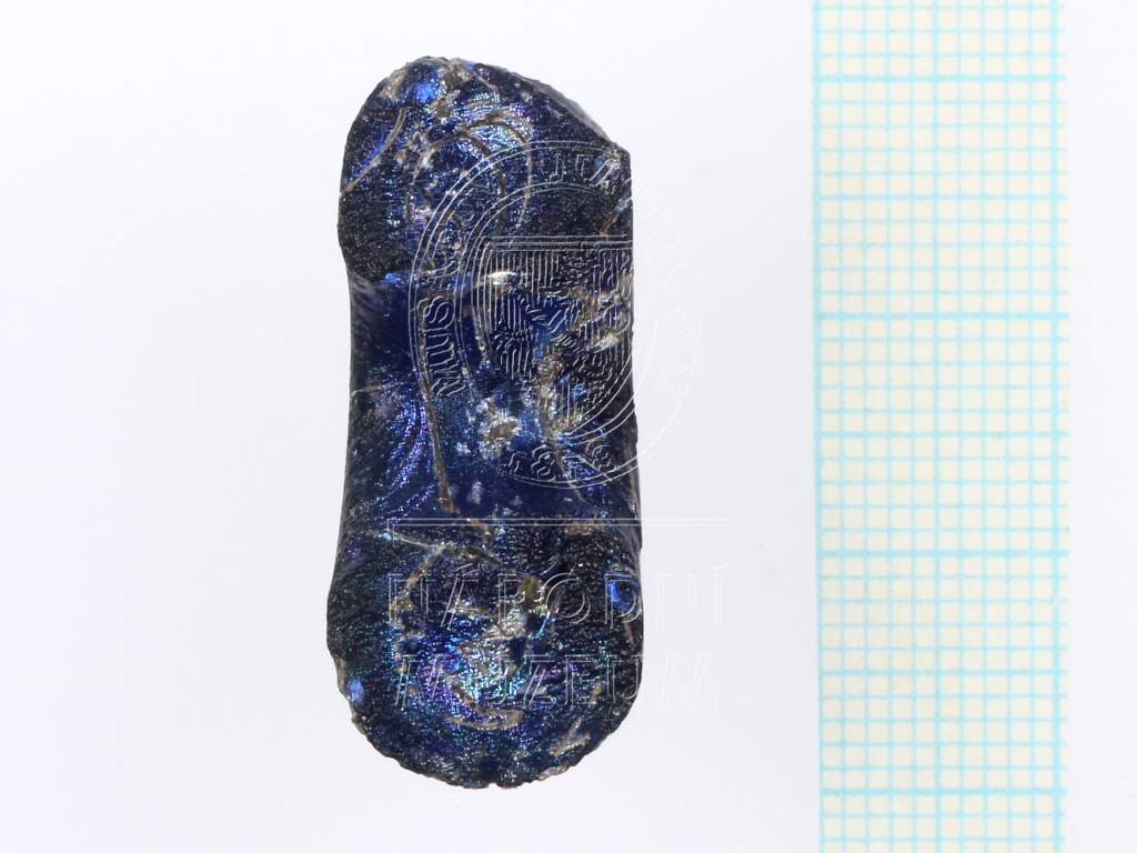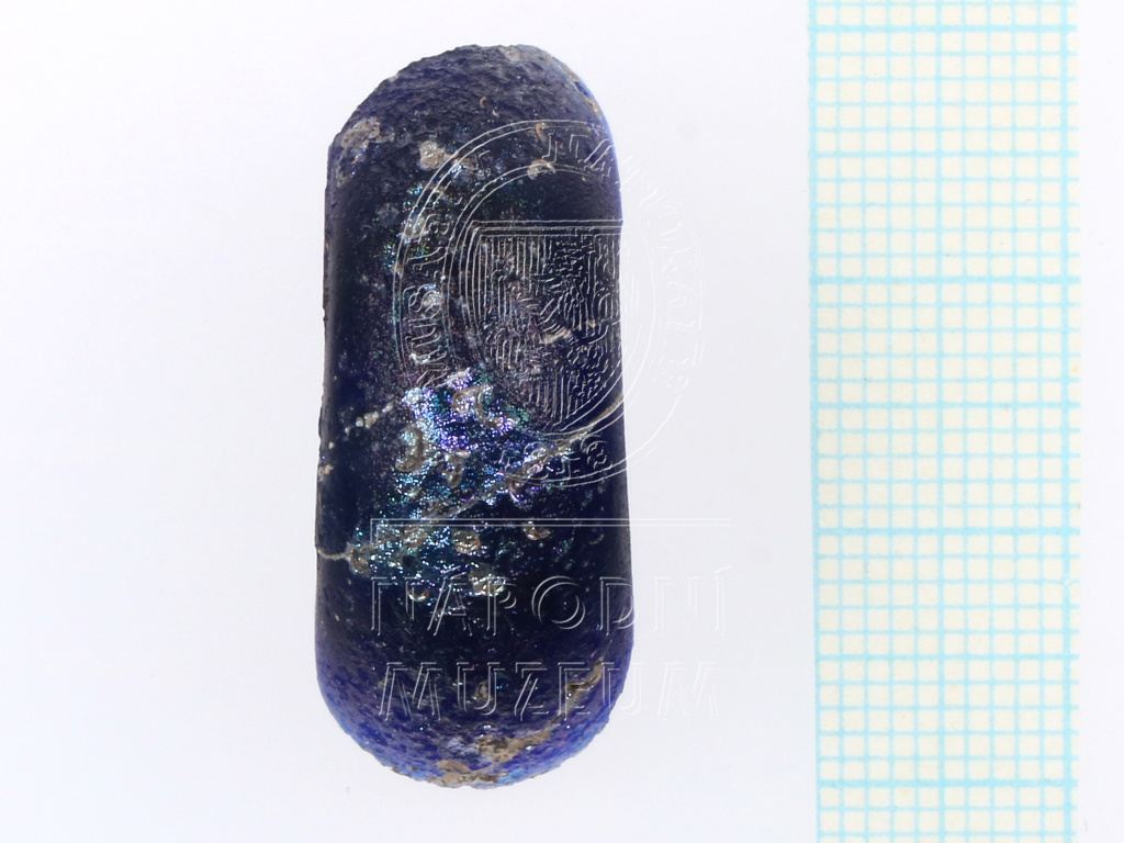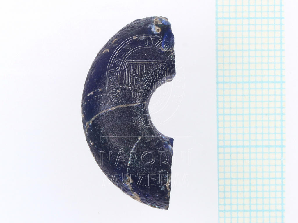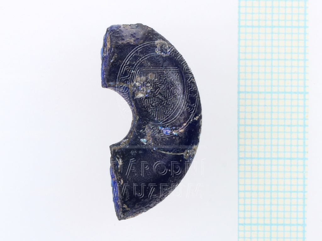 Polovina skleněného prsténcového korálu ultramarinové barvy, na povrchu korozní vrstva.