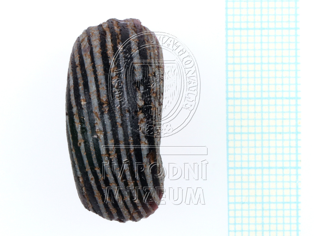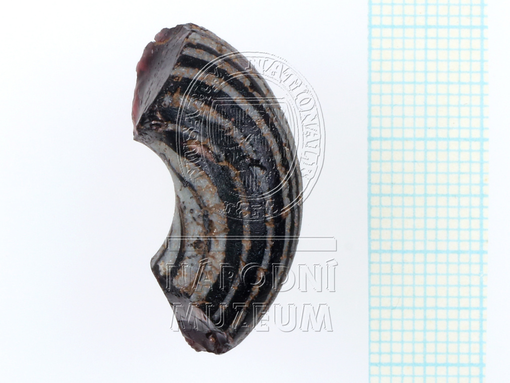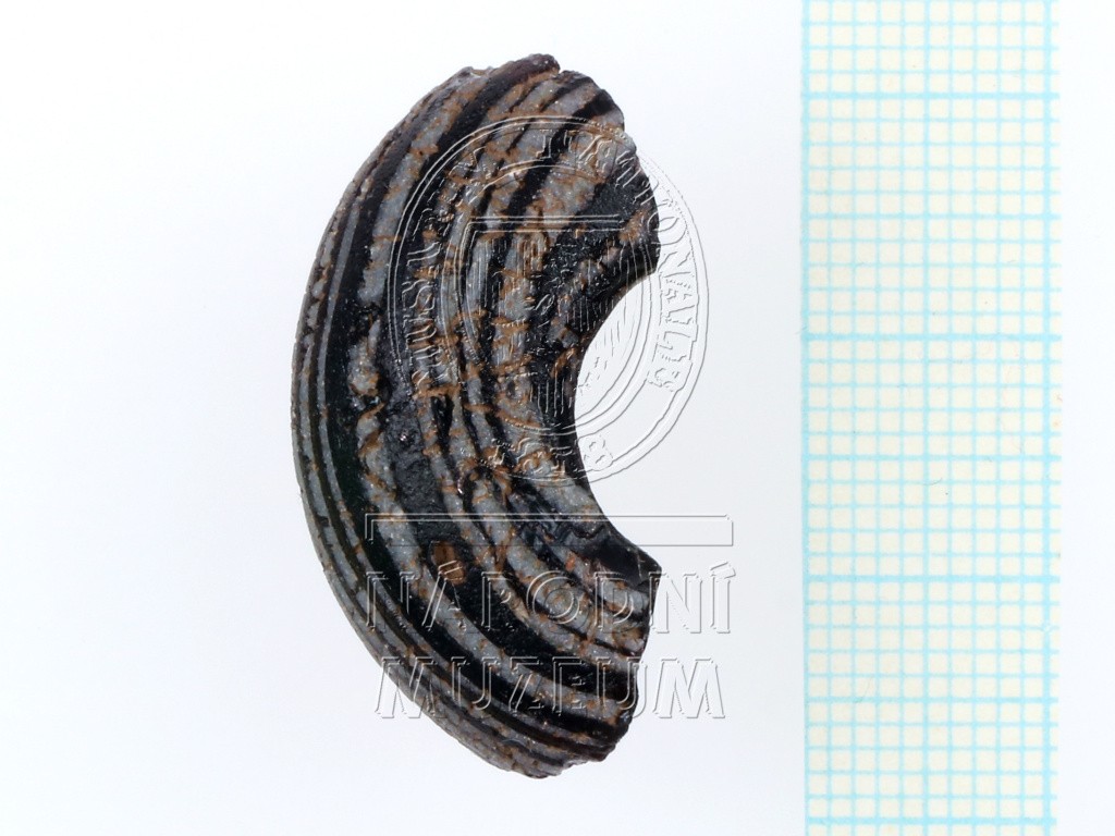 Zlomek skleněného prsténcového korálu téměř neprůsvitné kobaltově modré (místy až černé) barvy s bílými nepravidelnými úzkými proužky, vedeny v nepravidelných rozestupech šikmo až šroubovitě, na vnitřní straně jsou háčkem vedeny v paprskovitý svazek.