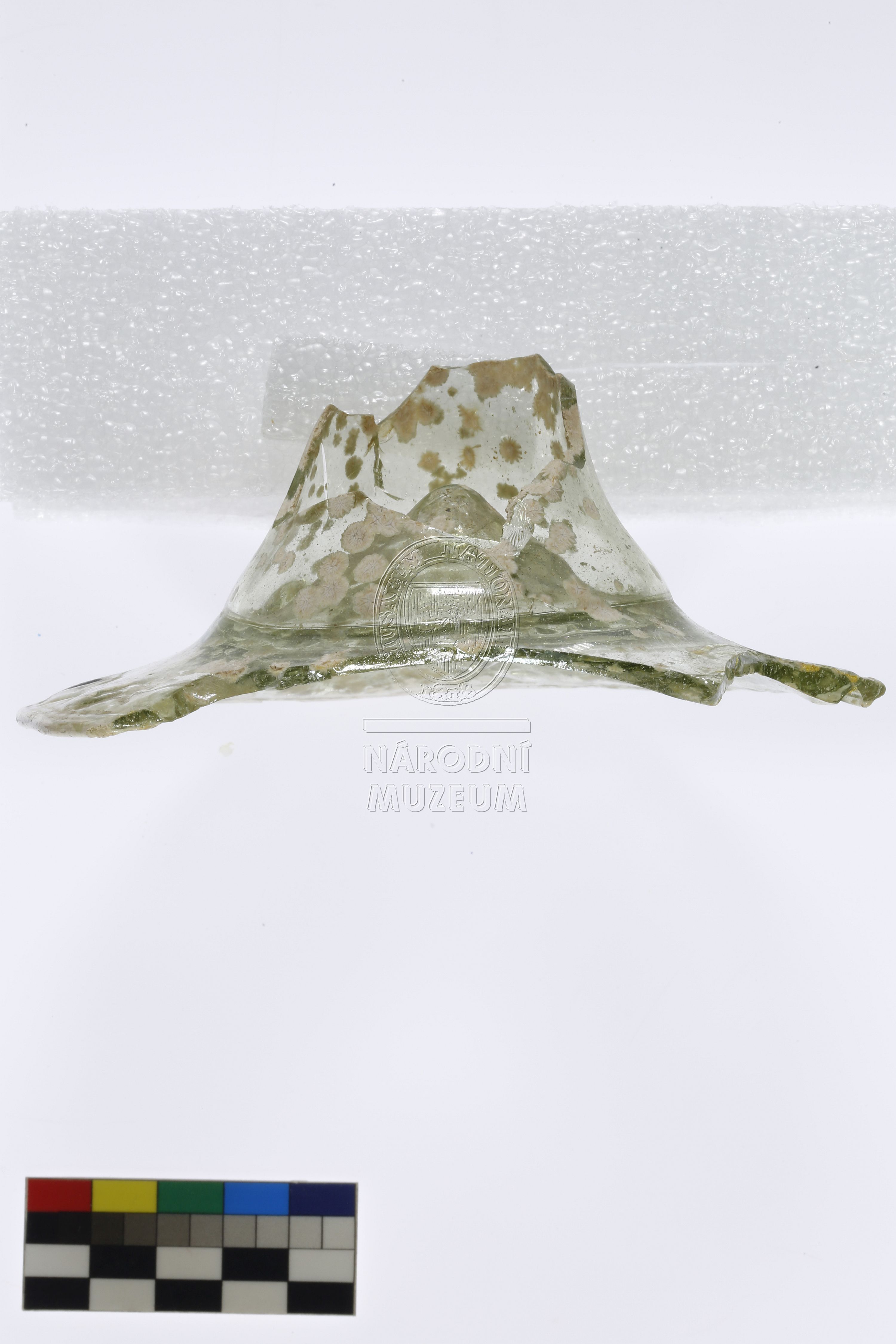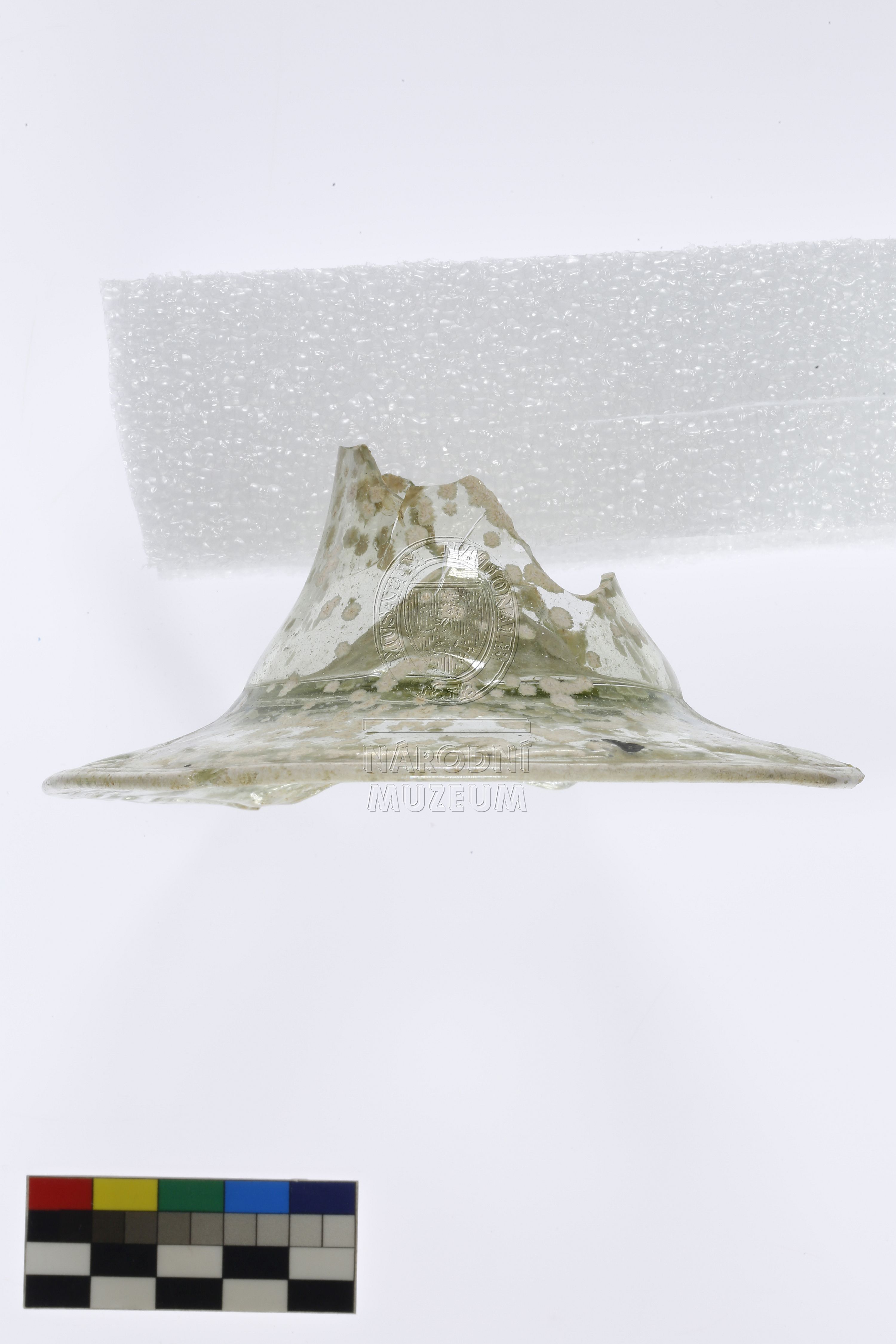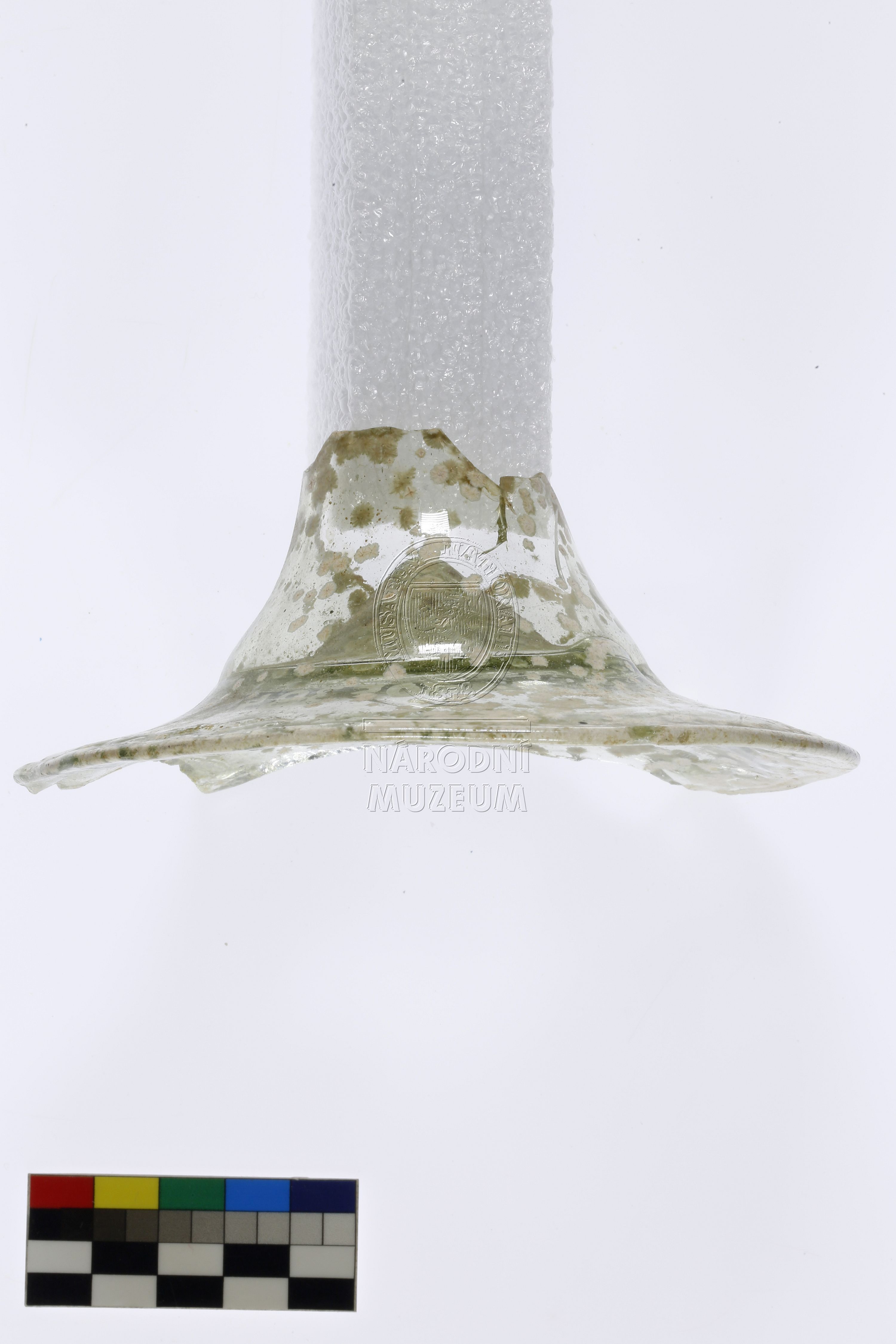 Více než polovina nízce vypíchnuté patky číše českého typu z lehce nazelenalého skla, korozní poškození ve formě bílých soustředných kruhů.