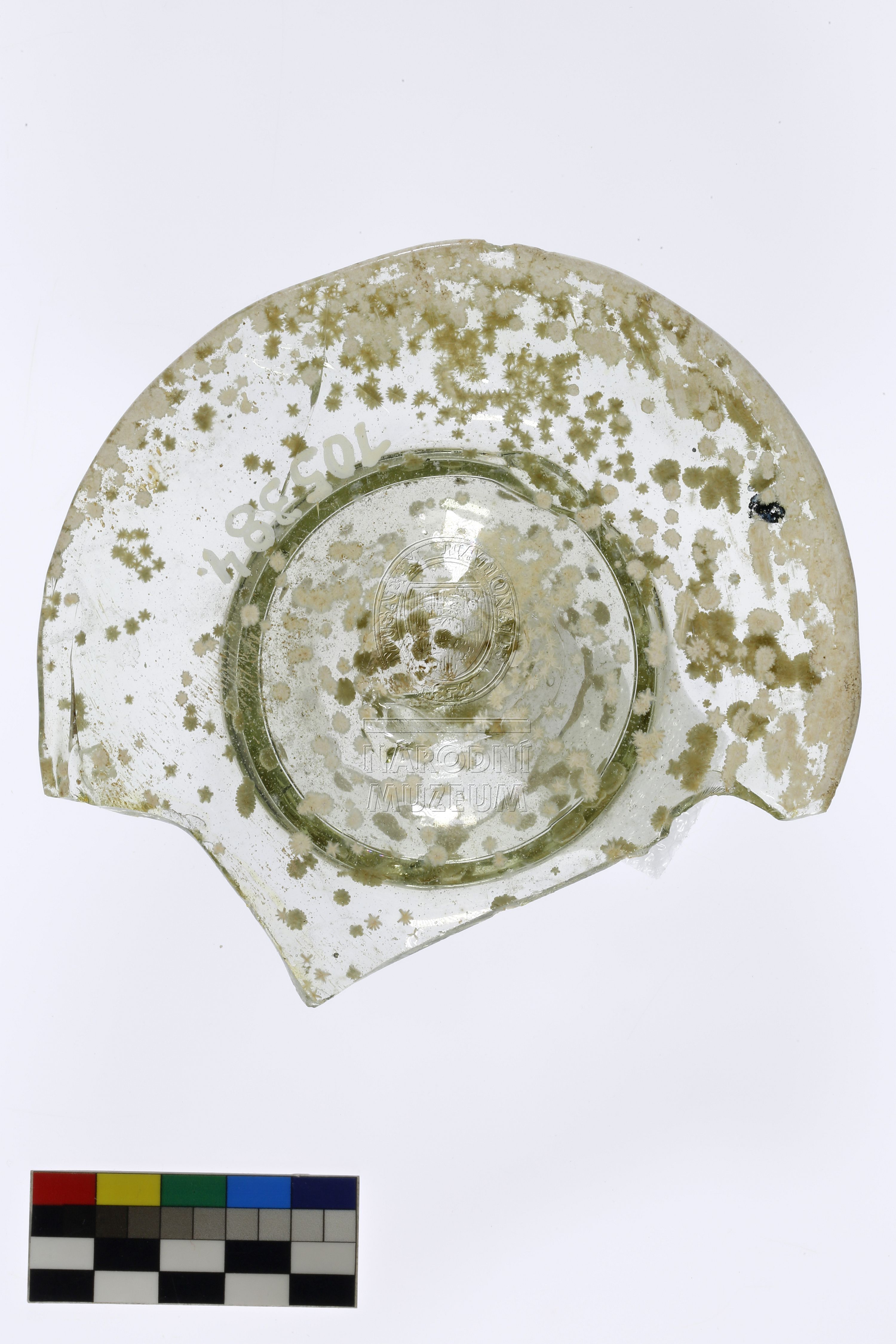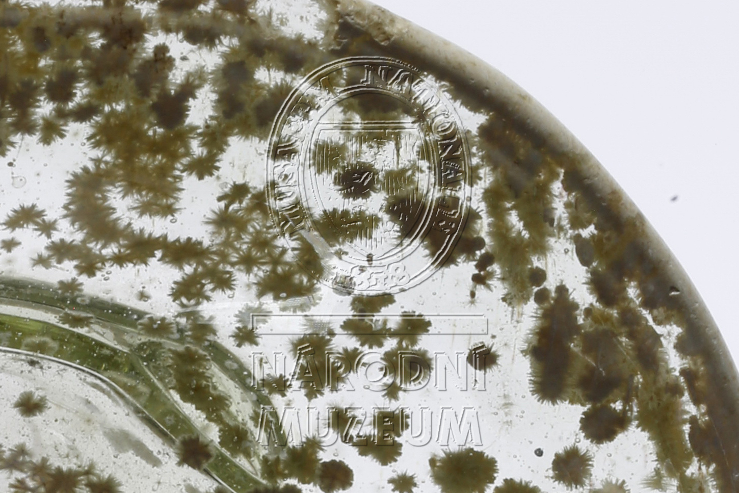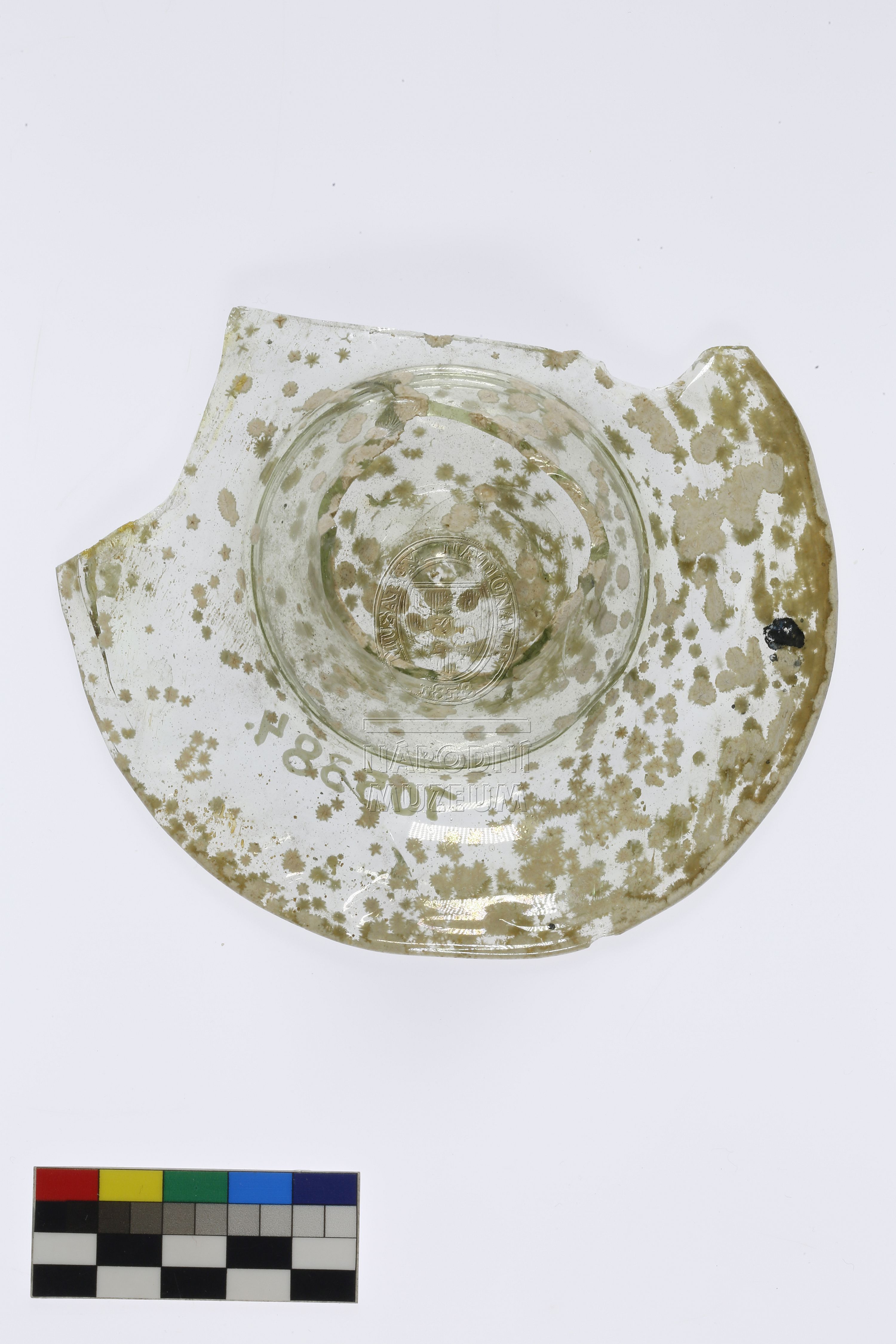 Více než polovina nízce vypíchnuté patky číše českého typu z lehce nazelenalého skla, korozní poškození ve formě bílých soustředných kruhů.