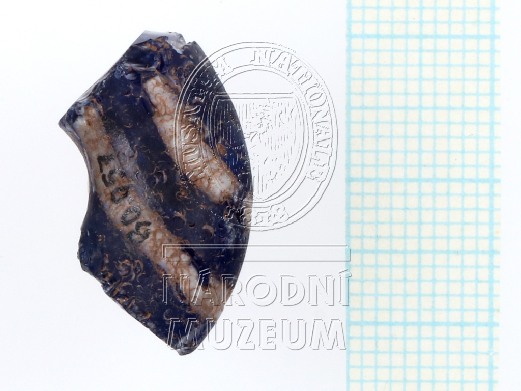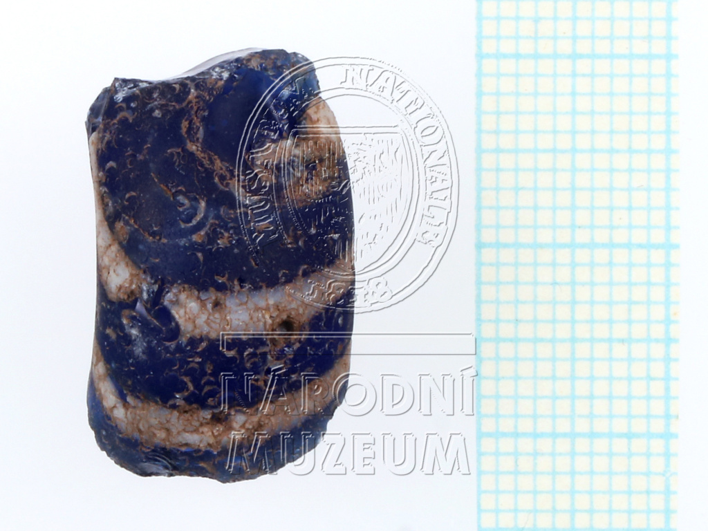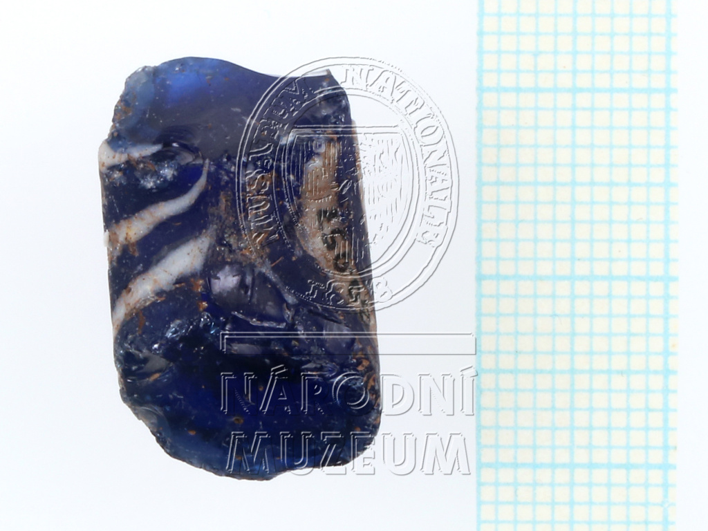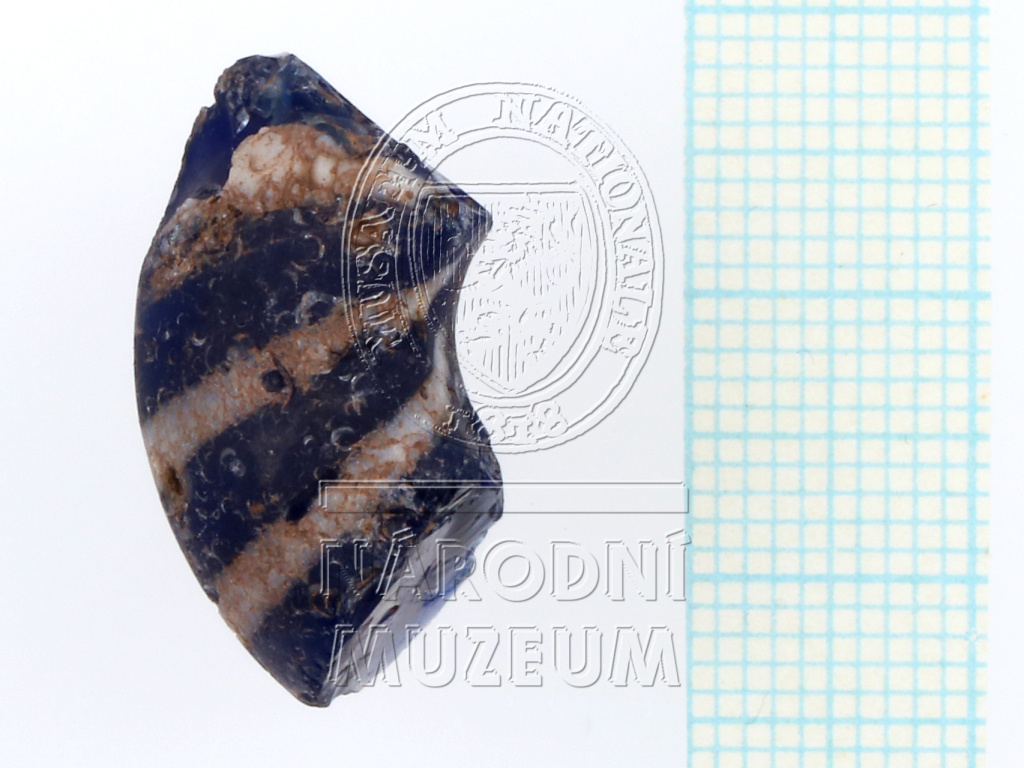 Zlomek skleněného prsténcového korálu kobaltově modré průsvitné barvy s bílými úzkými obloukovitě vedenými proužky.