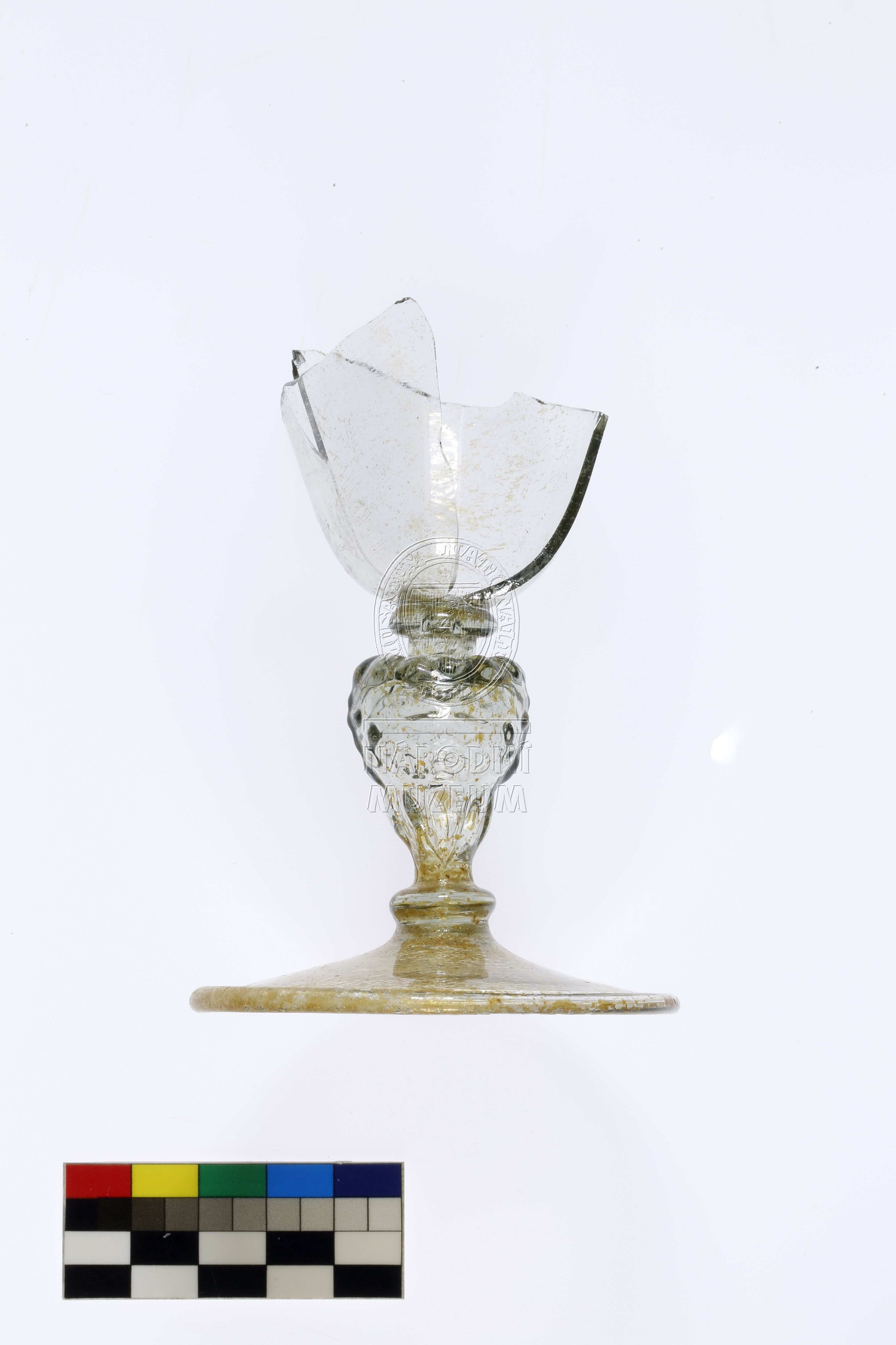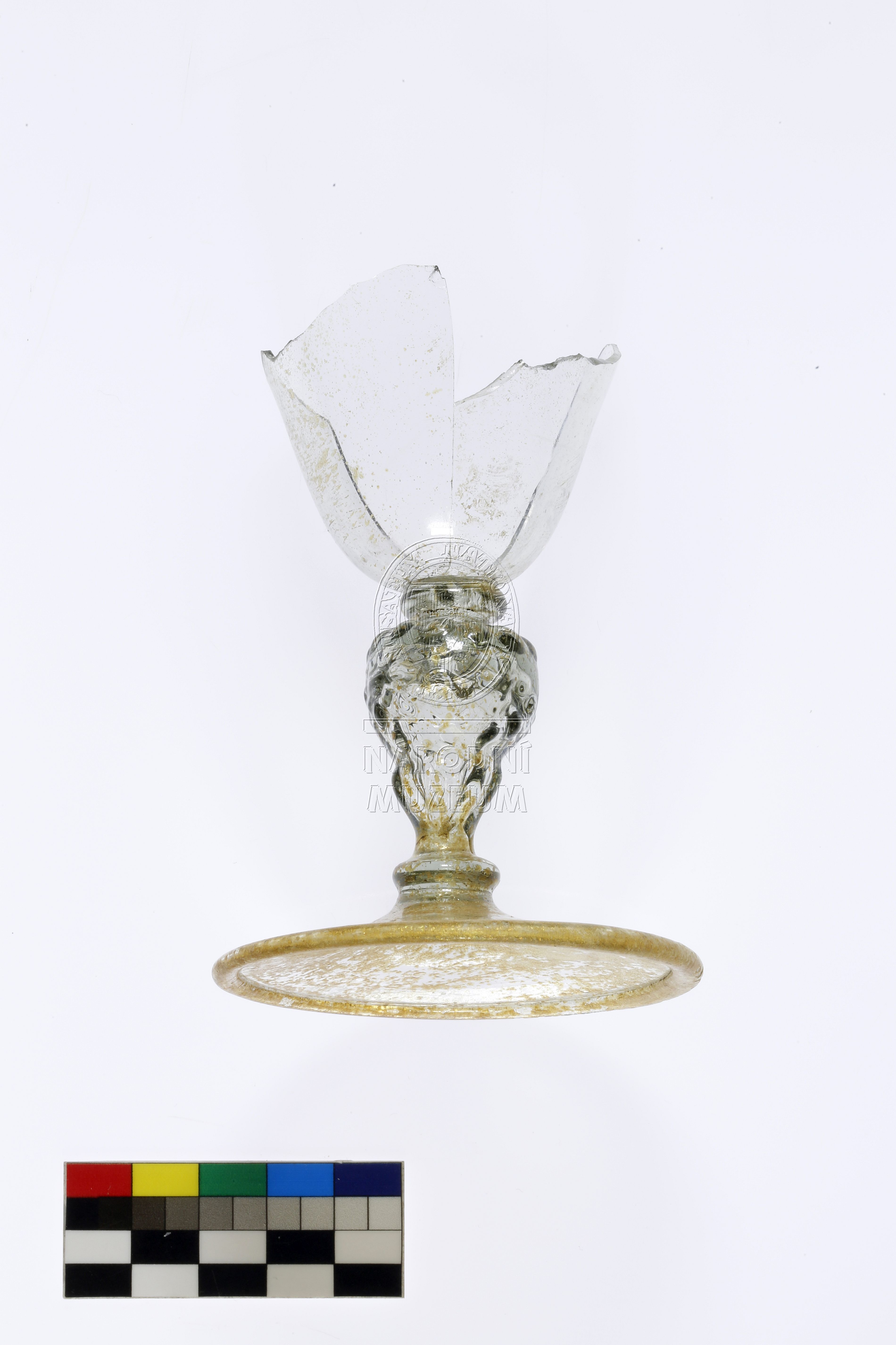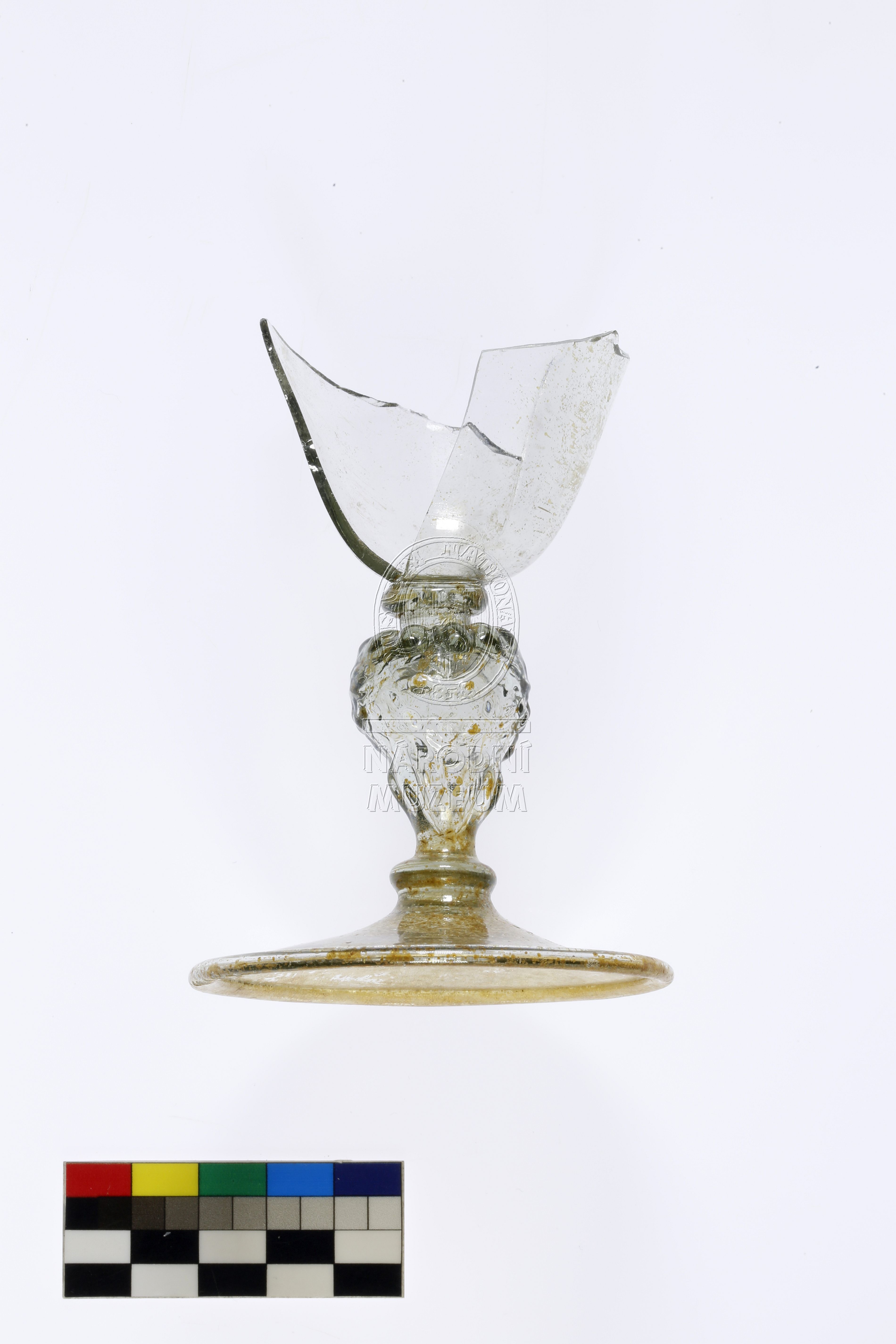 Torzo pohárku na nožce zdobené nodem ve tvaru lví masky, hladkou patkou a vřetenovitou kupou, vyrobený z lehce nazelenalého skla typického složení pro domácí raně novověkou produkci, poškozeno důlkovou korozí.