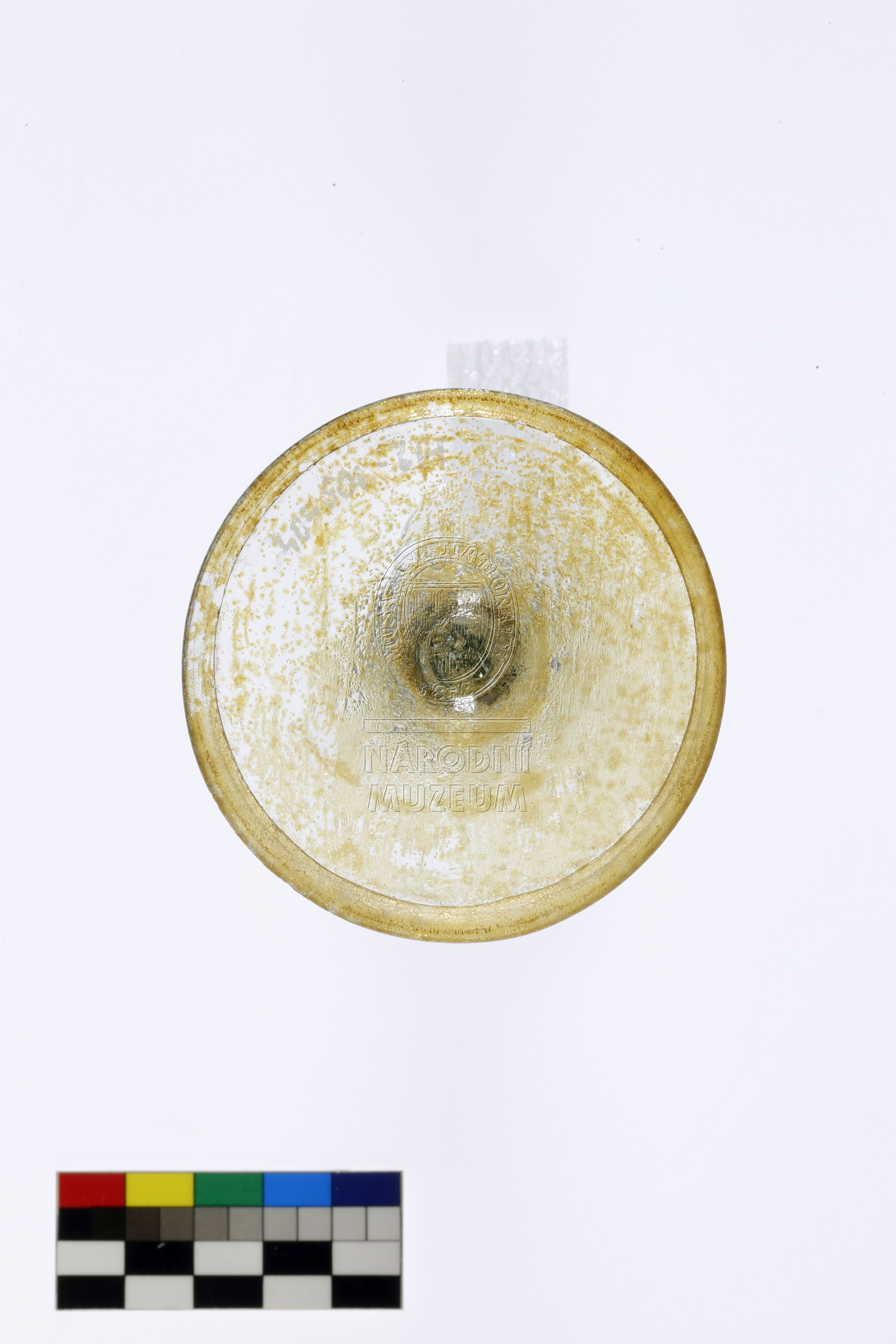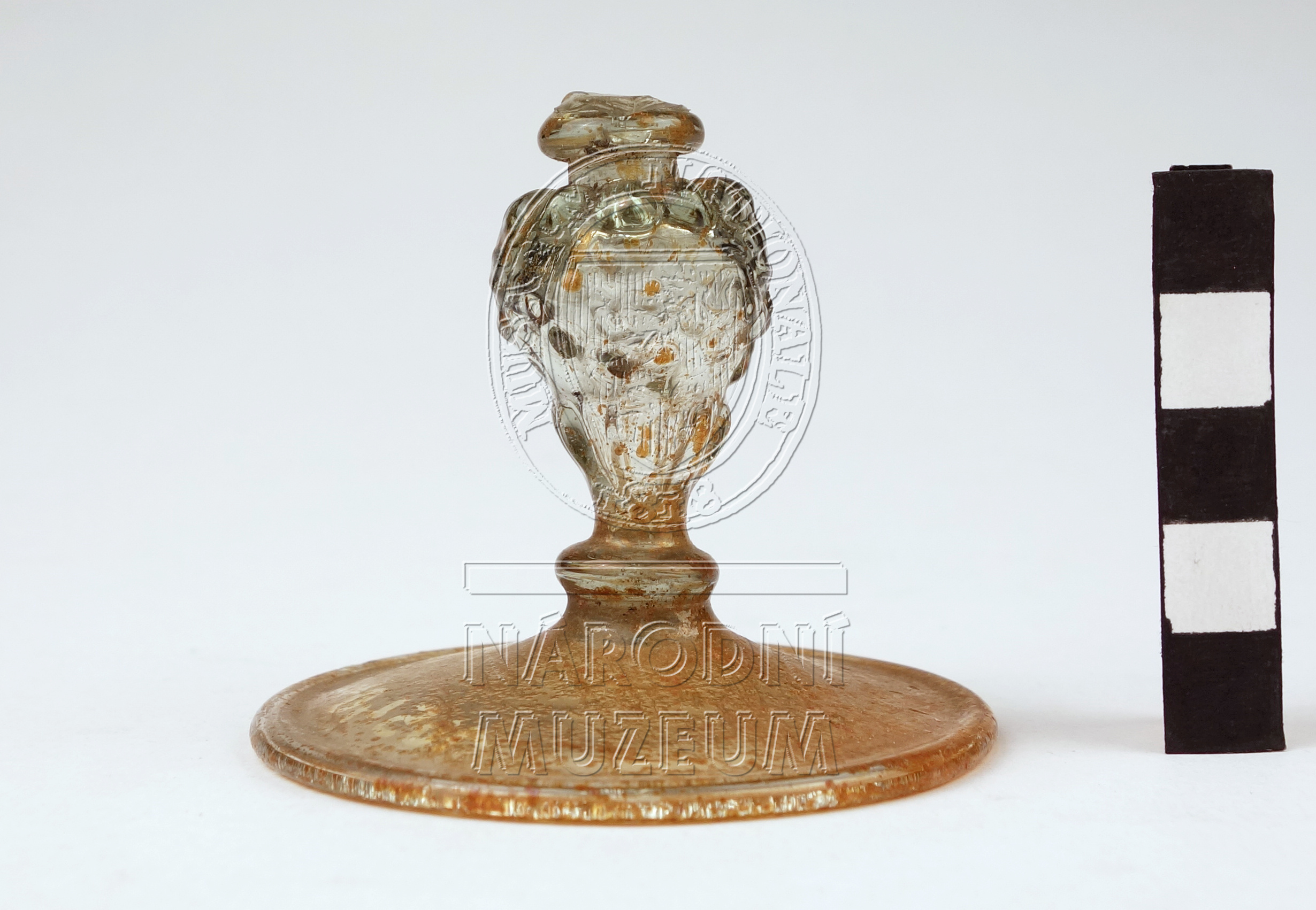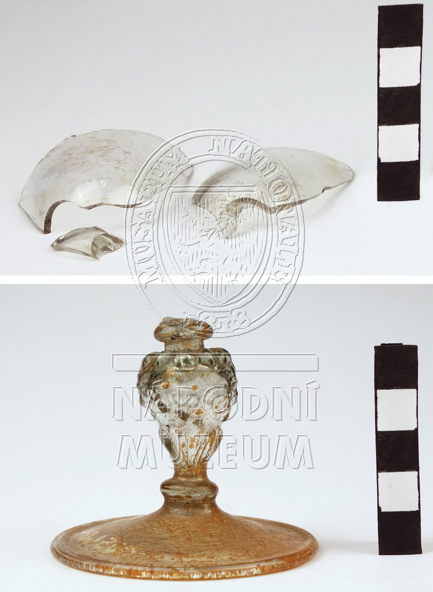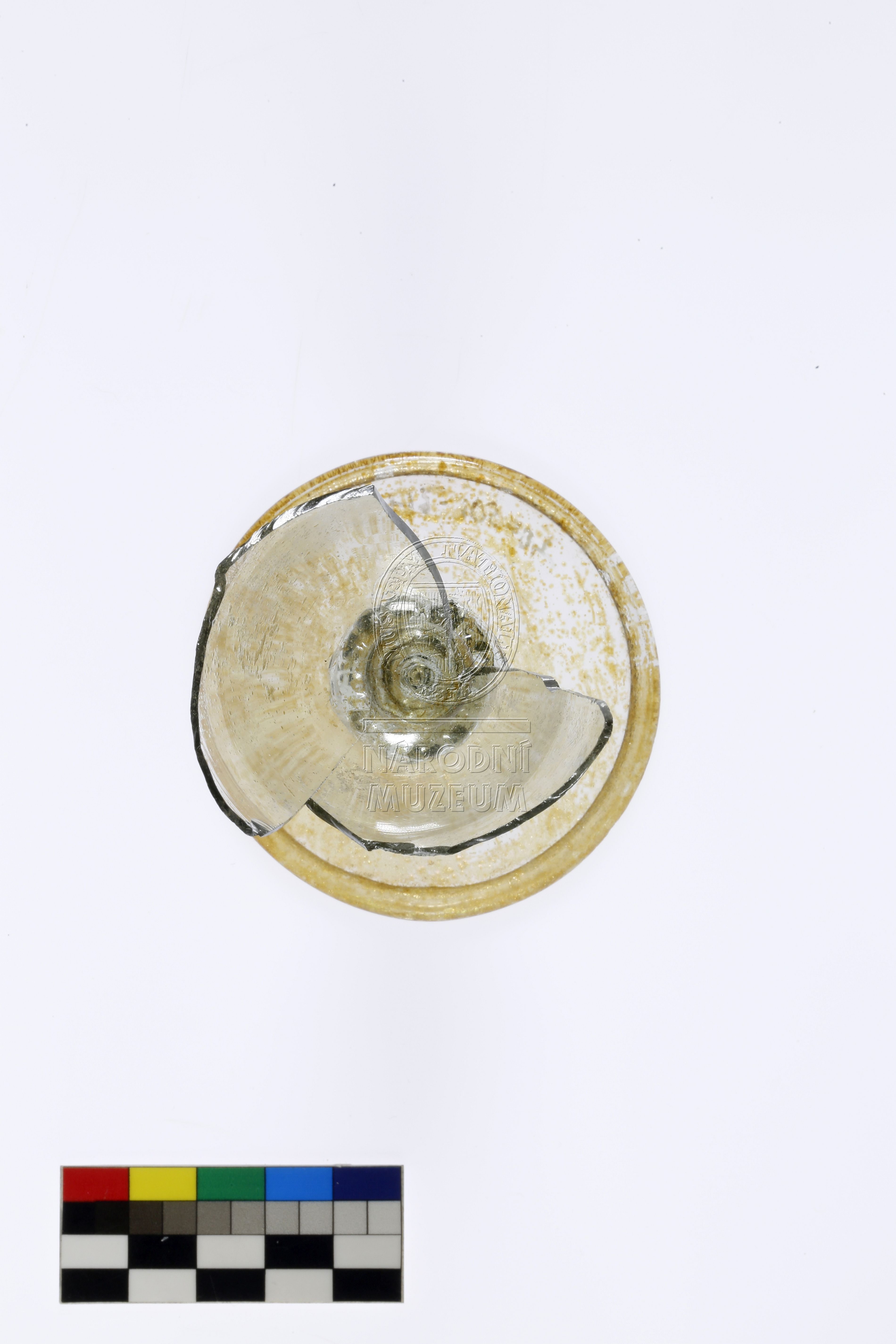 Torzo pohárku na nožce zdobené nodem ve tvaru lví masky, hladkou patkou a vřetenovitou kupou, vyrobený z lehce nazelenalého skla typického složení pro domácí raně novověkou produkci, poškozeno důlkovou korozí.