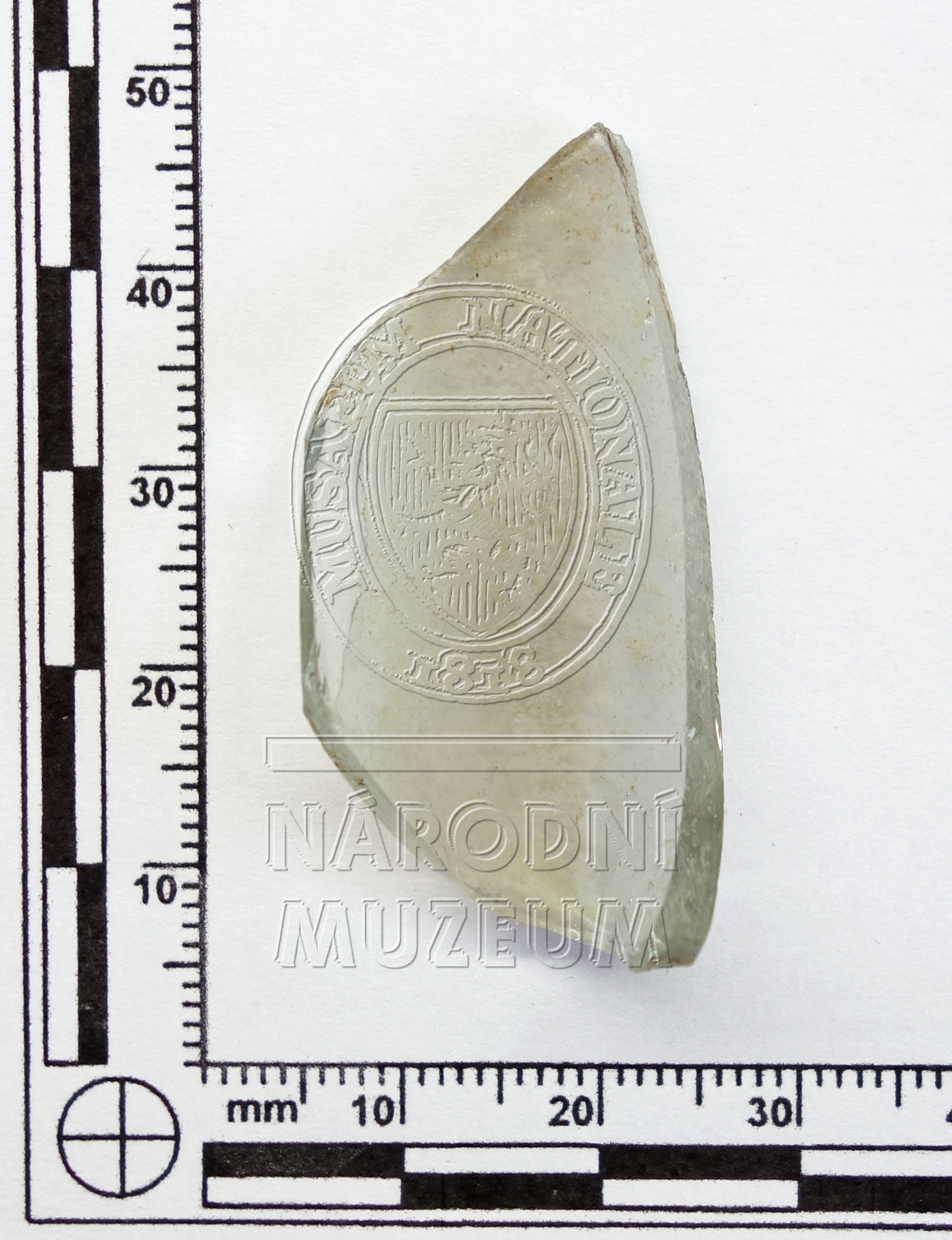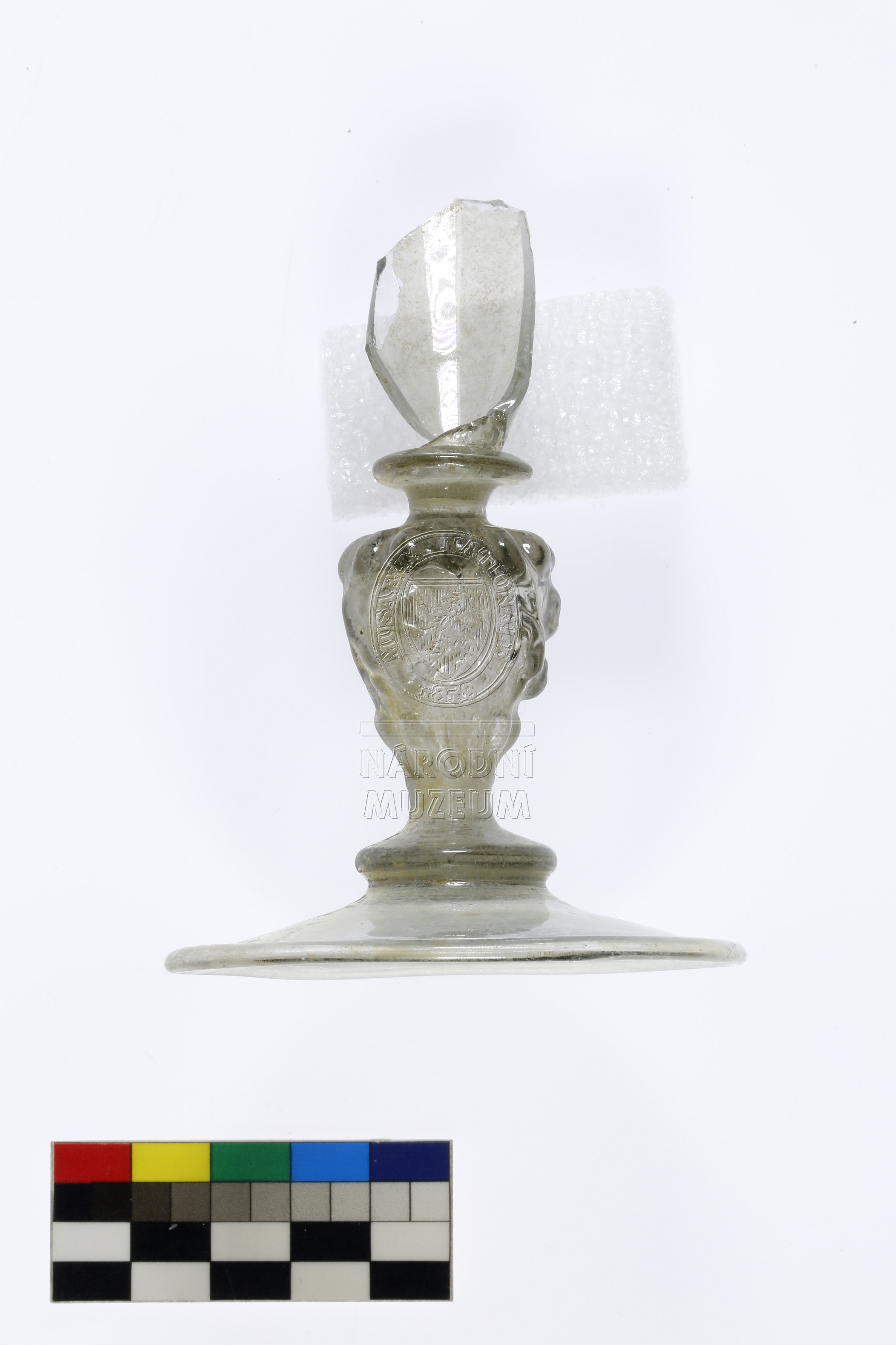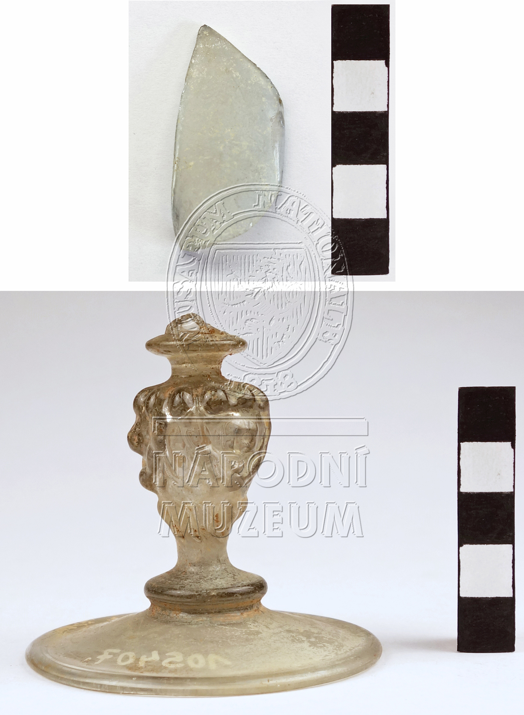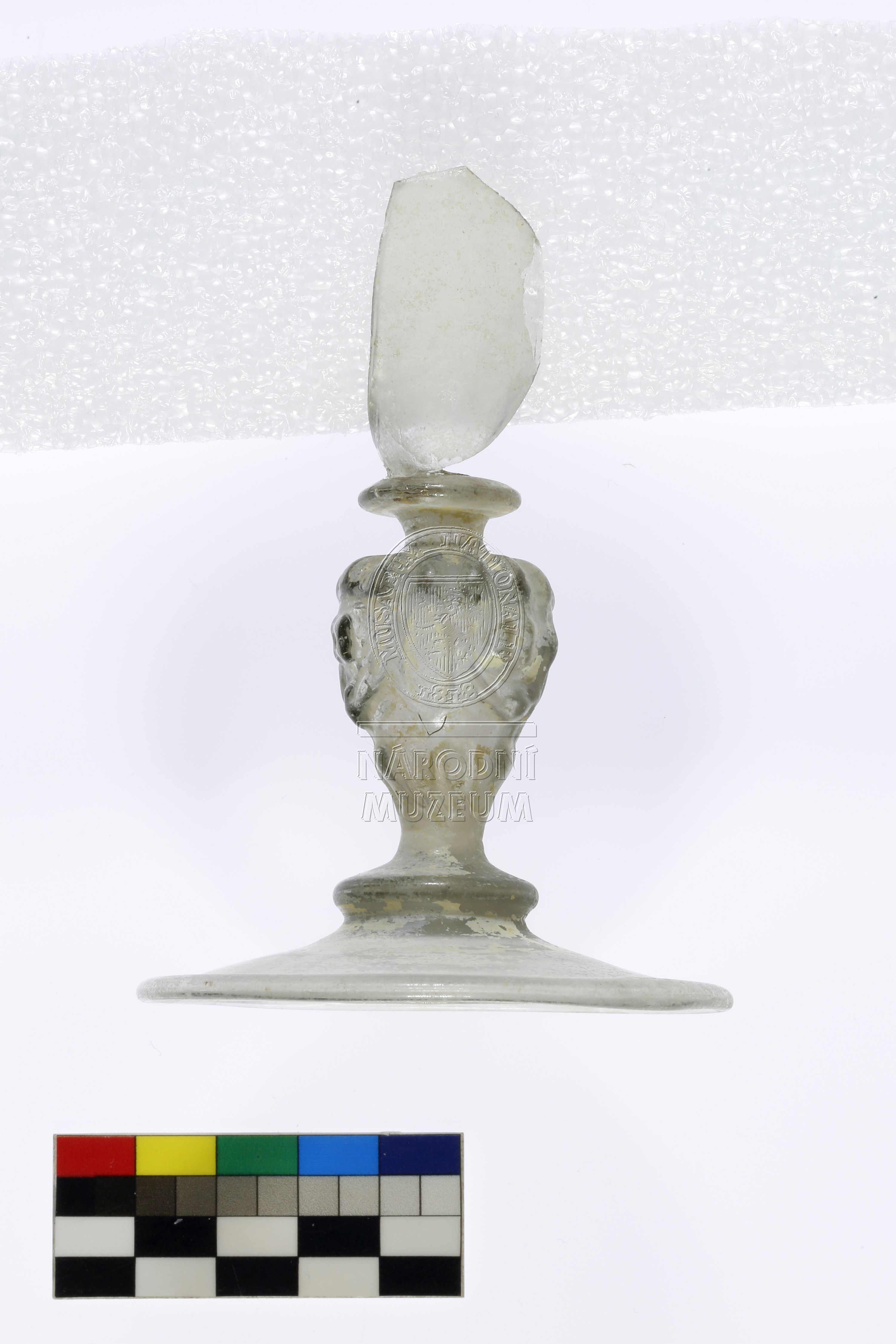 Torzo pohárku ze dvou fragmentů, dochovala se hladká patka, dřík ve tvaru lví hlavy, a část vřetenovité kupy; vyrobeno ze světle zeleného skla, záměrně barveného, lehce poškozeno důlkovou korozí a odlupováním iridujících vrstev, dle chemického složení se jedná o import, tzv. Façon de Venise.