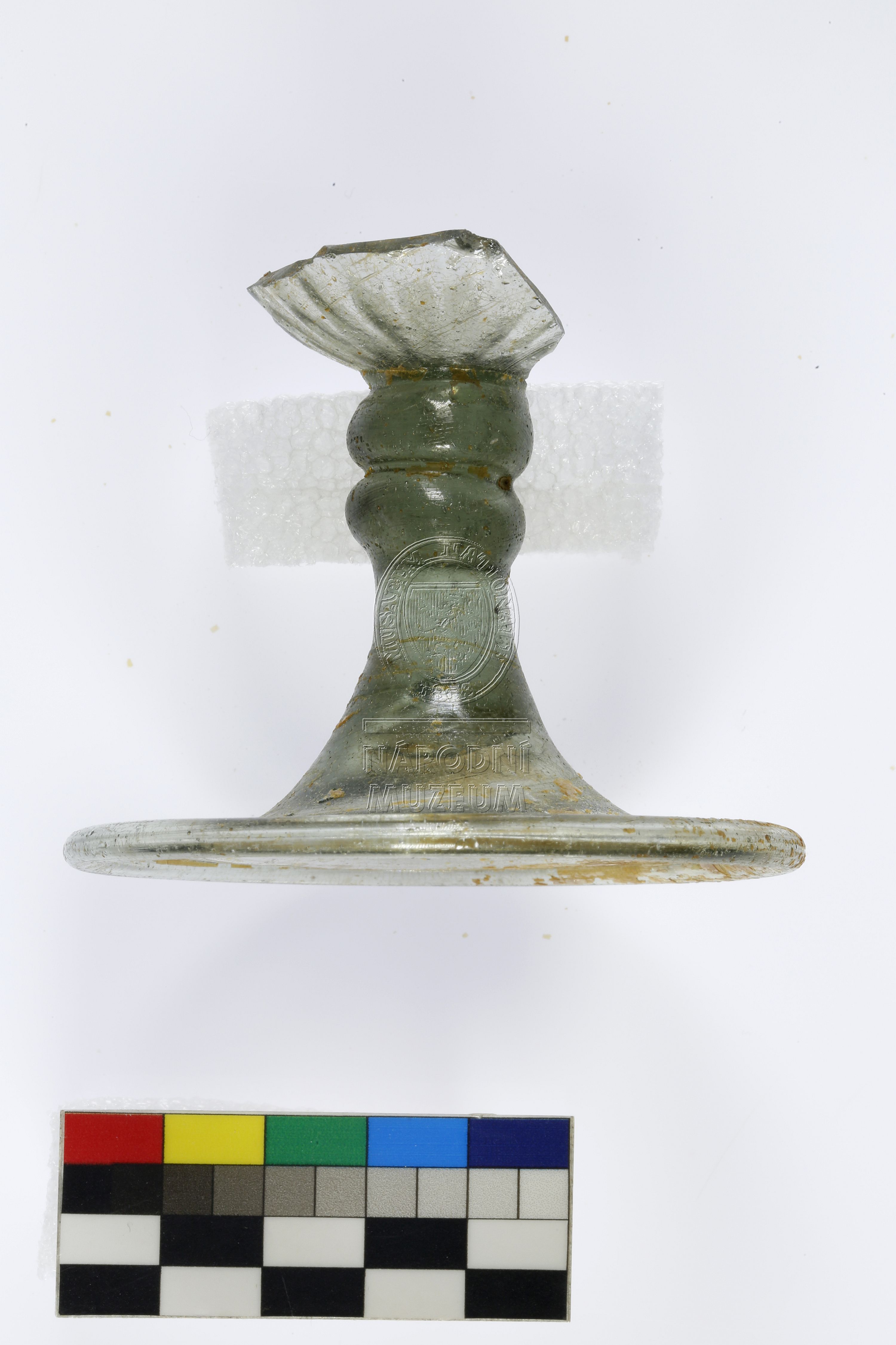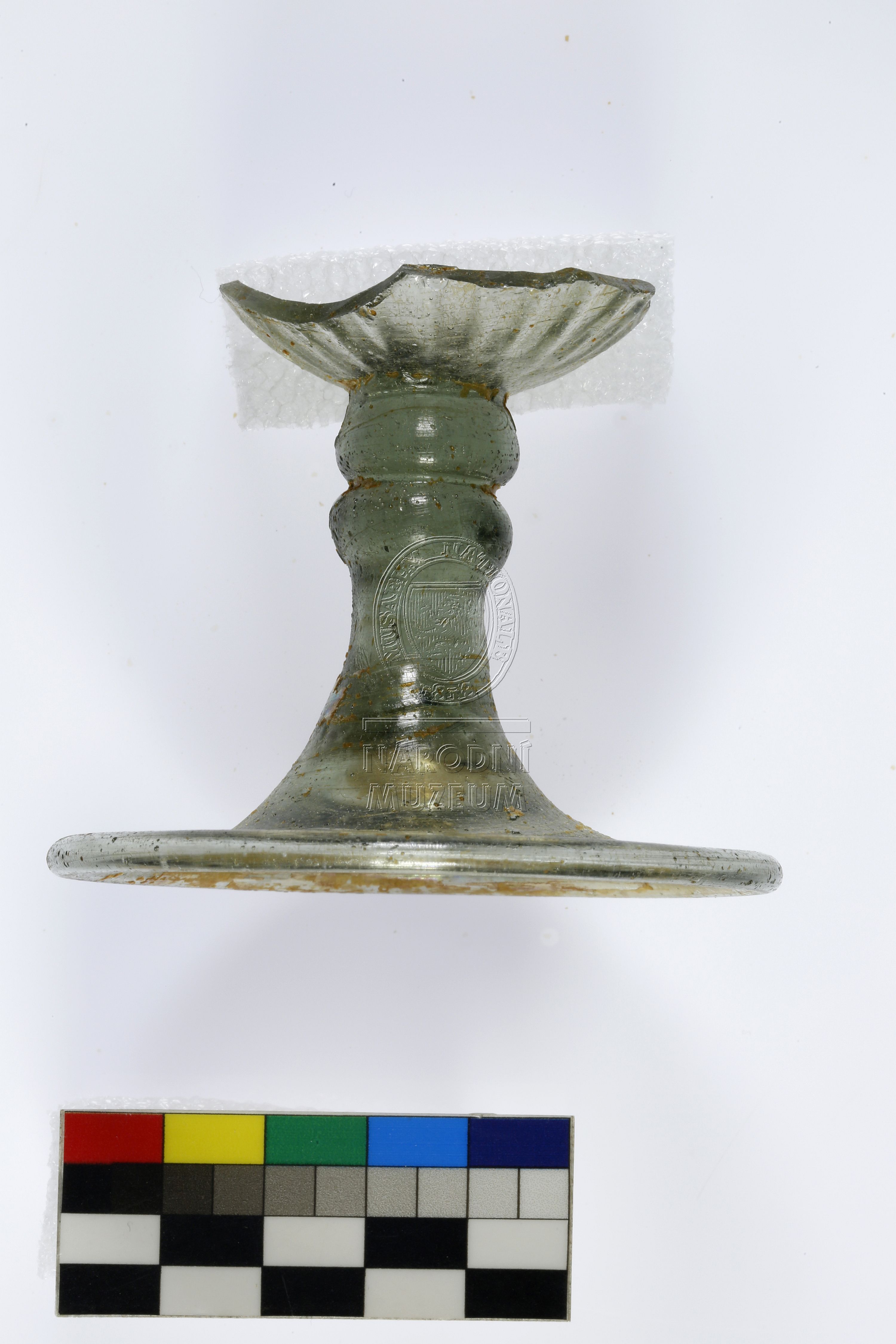 Torzo pohárku s polovejčitou kupou zdobenou svislým optickým dekorem, hladkou patkou a nodem tvořeným dvěma kuličkami, vyrobeno z nazelenalého skla, pravděpodobně domácí produkce, lehce poškozeno důlkovou korozí.