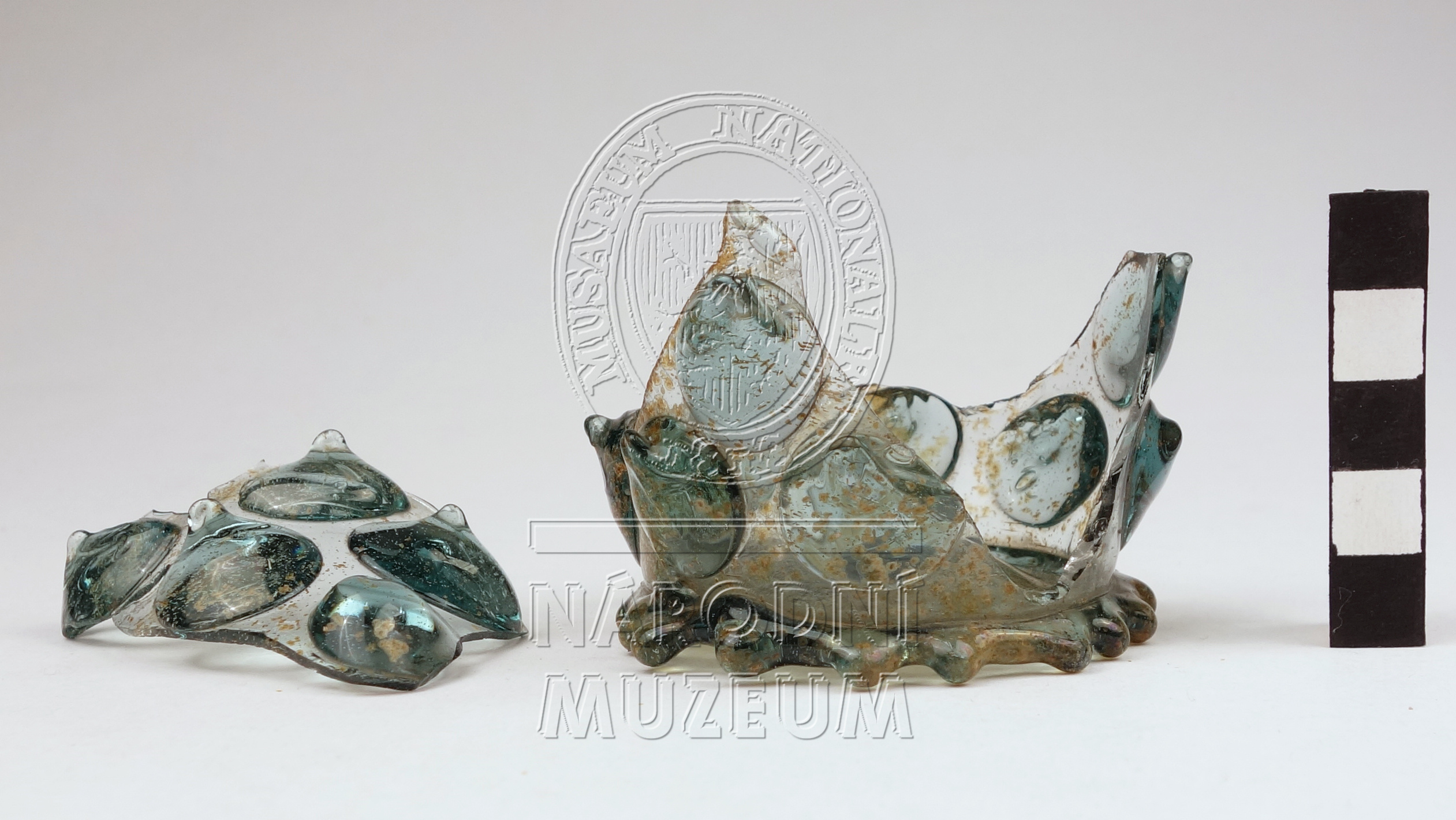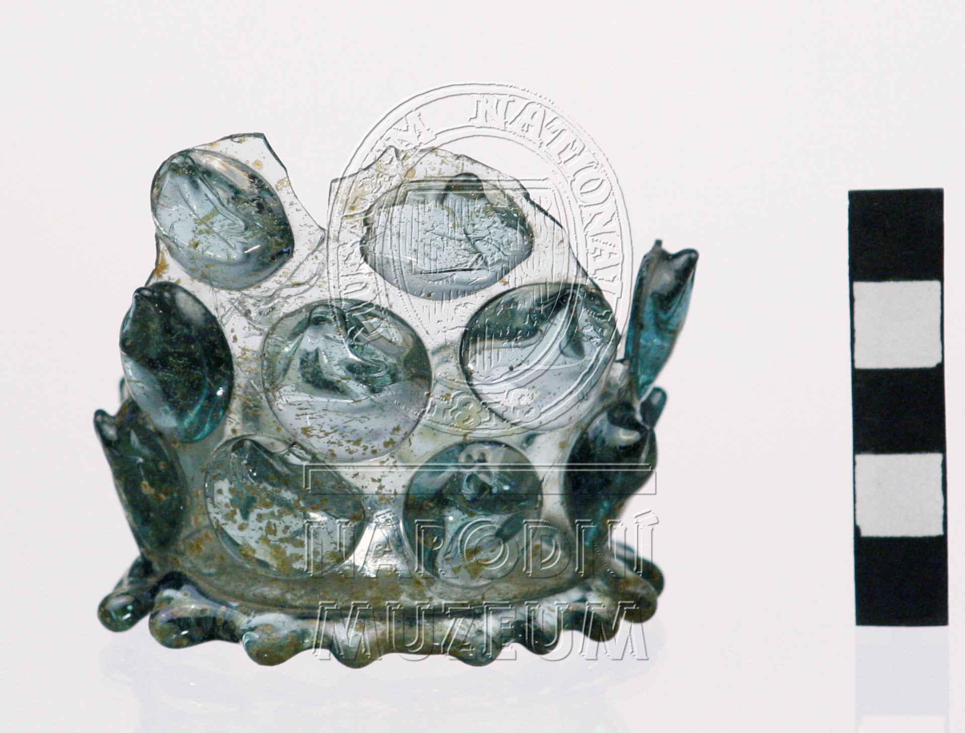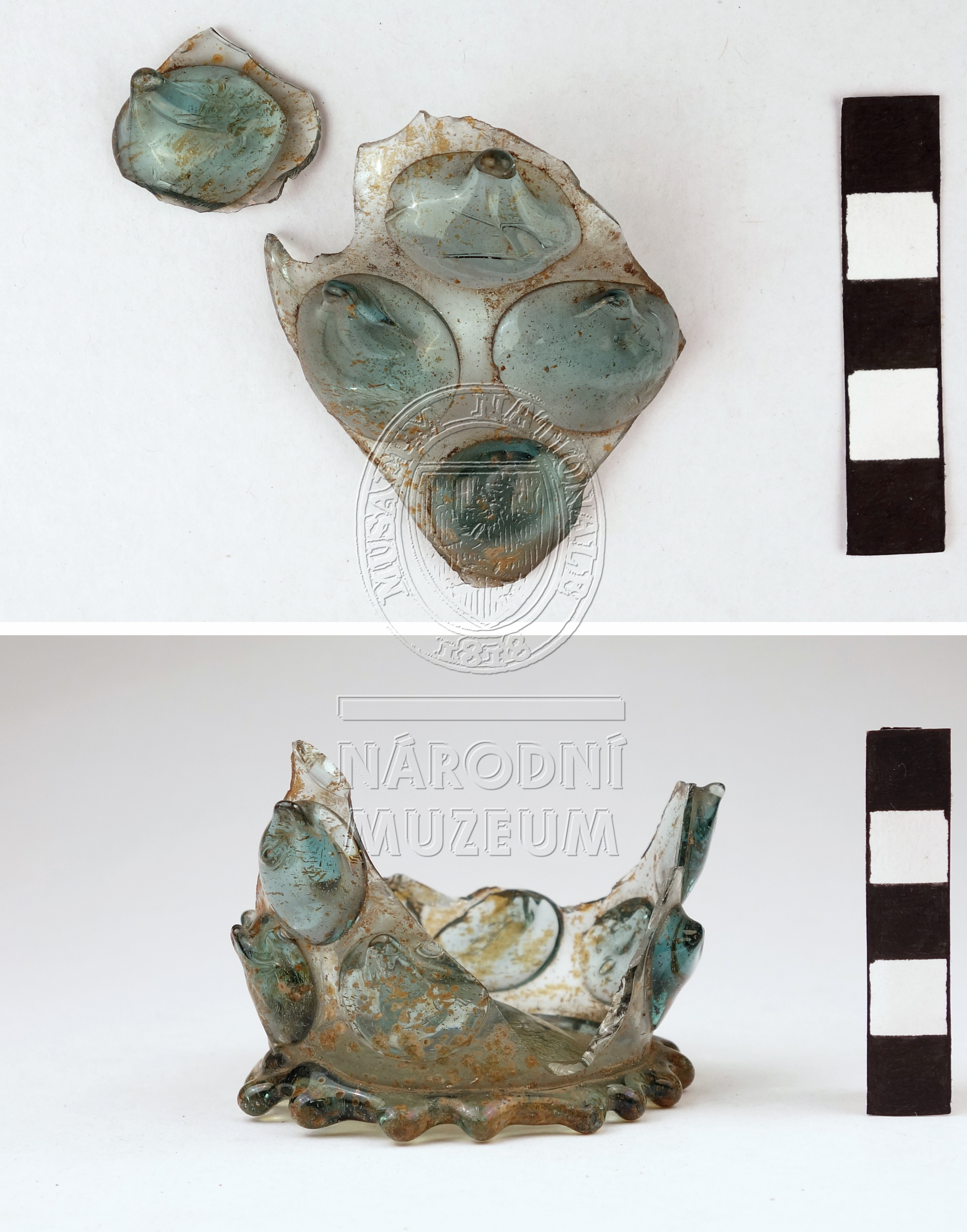 Torzo nízké číše krautstrunk ze 3 fragmentů z namodralého skla, povrch číše je zdoben velkými nálepy a dno je zdobeno kapkovitým lemem, pravděpodobně
