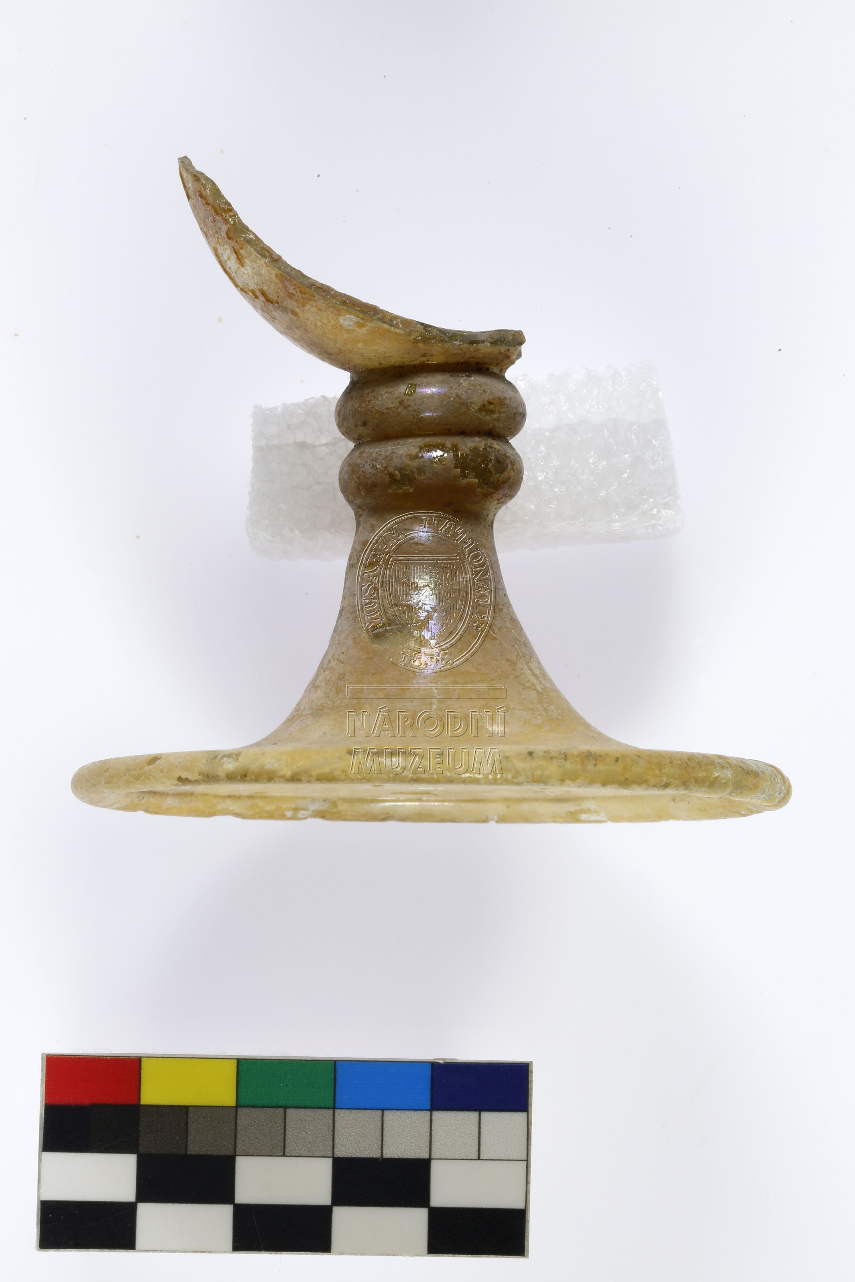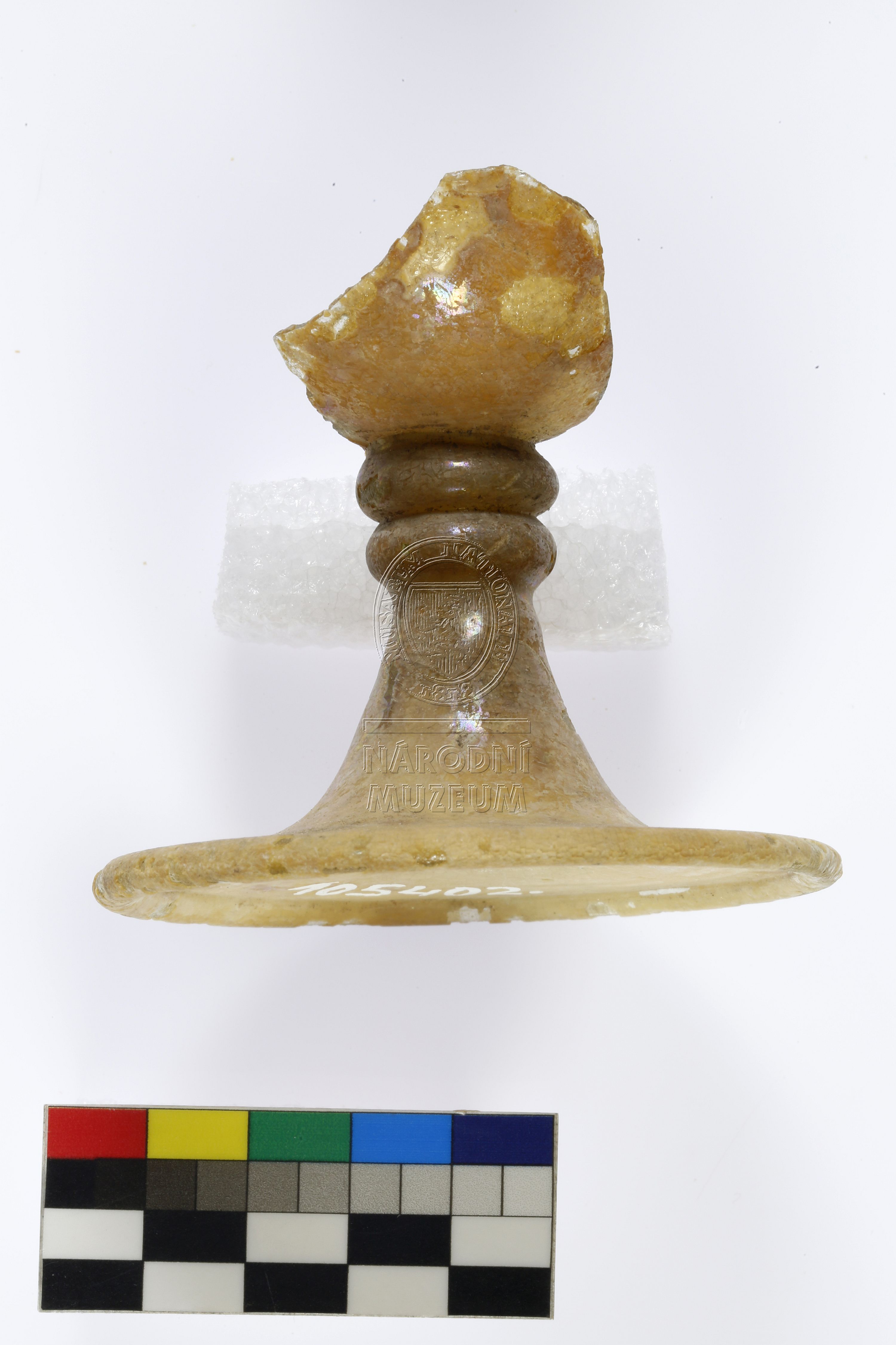 Torzo pohárku s polovejčitou kupou zdobenou svislým optickým dekorem, hladkou patkou a nodem tvořeným dvěma kuličkami, vyrobeno z nazelenalého skla, pravděpodobně domácí produkce, výrazně poškozeno korozí, povrchová rozpraskaná vrstvička druhotně zbarvena do hnědooranžové opakní barvy, neodplupuje se.