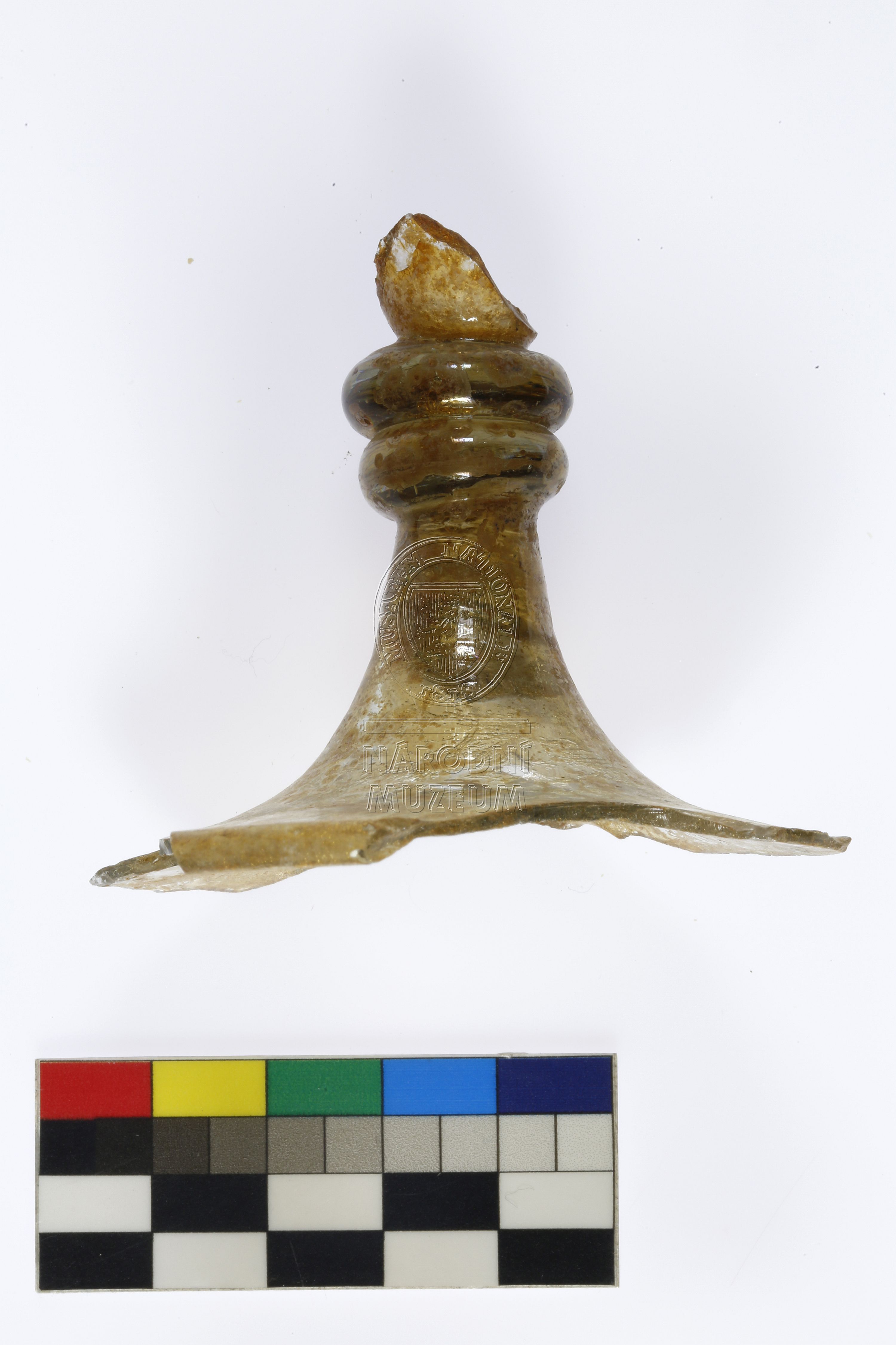 Torzo pohárku s náběhem spíše vřetenovité kupy, hladkou patkou a nodem tvořeným dvěma kuličkami, vyrobeno z nazelenalého skla, pravděpodobně domácí produkce, poškozeno důlkovou korozí.