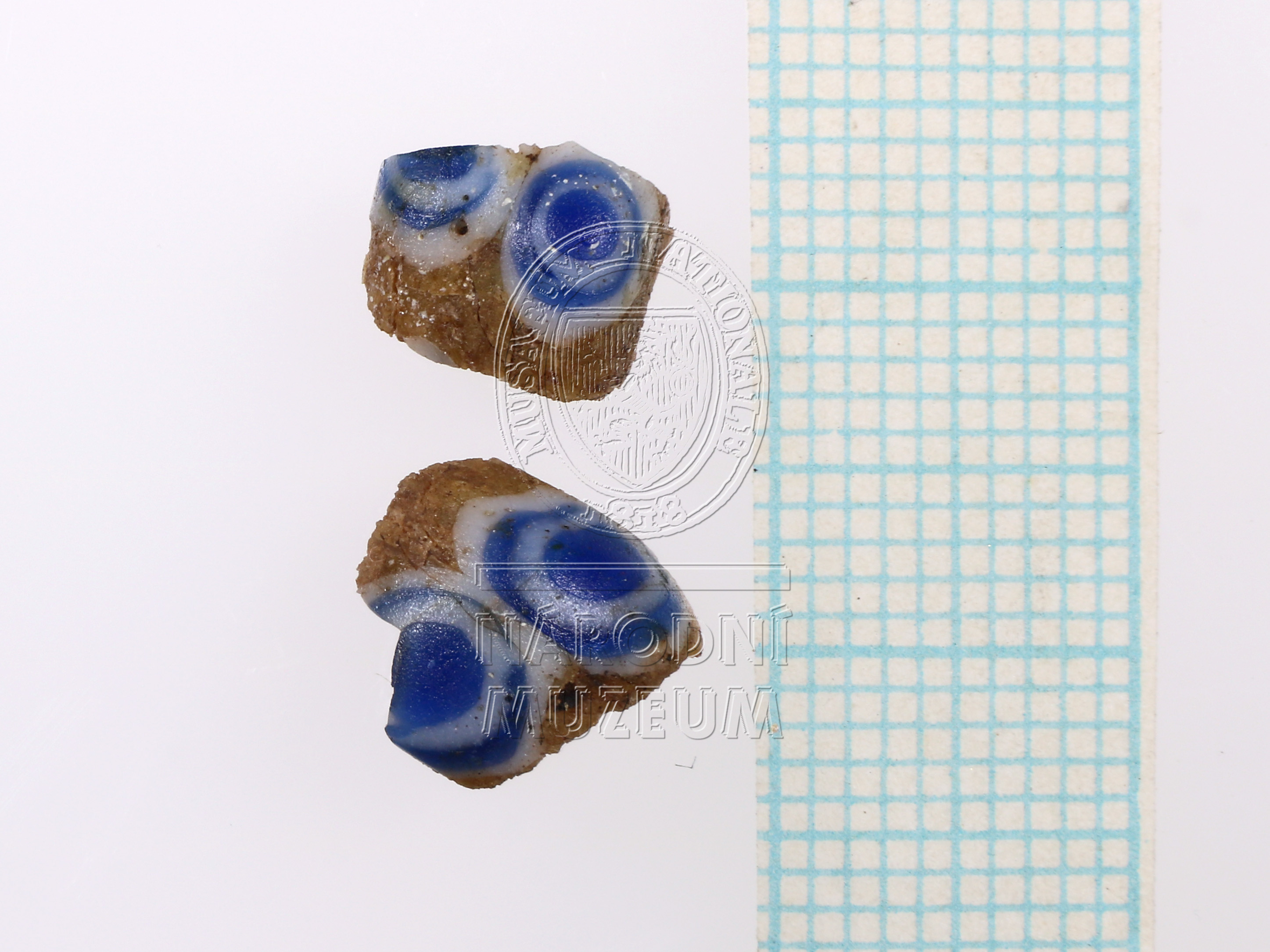 Dva zlomky korálku ze žlutého skla s modrobílými očky.