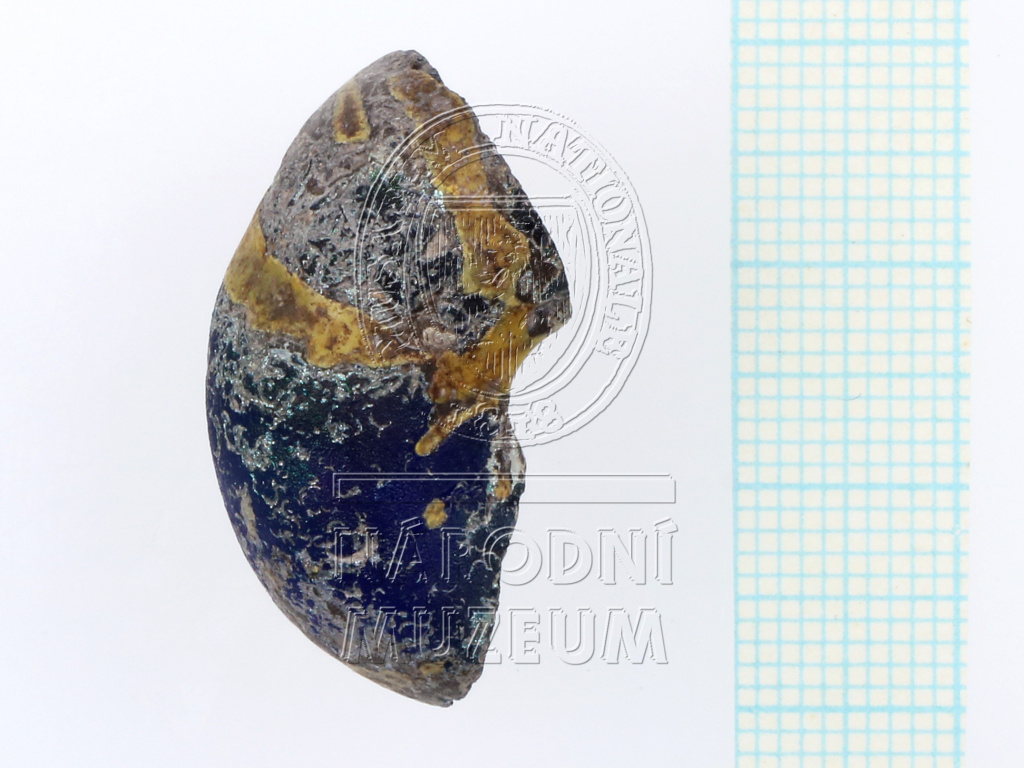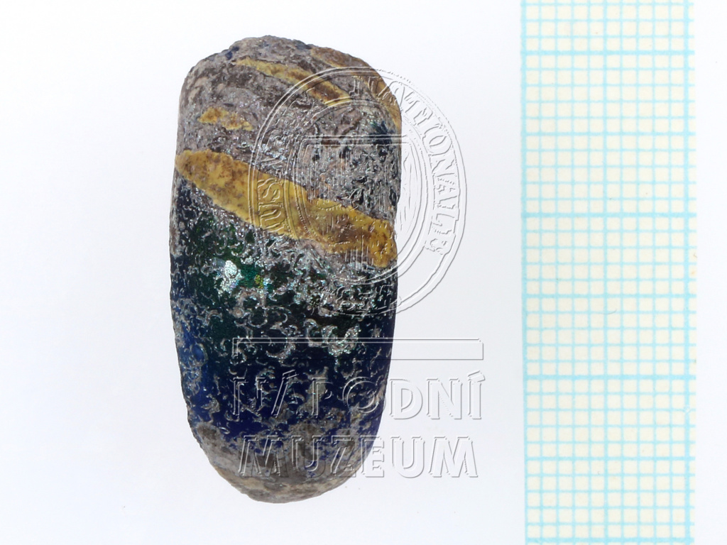 Část skleněného prsténcového korálu modré barvy s příčnými proužky žluté barvy.