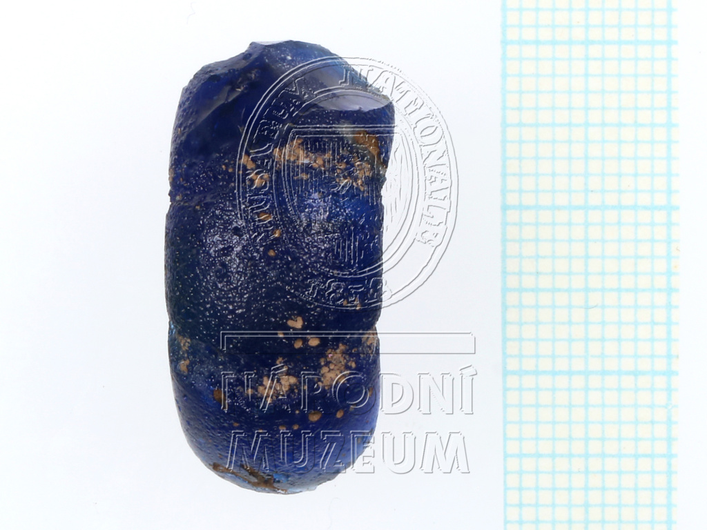 Část skleněného prsténcového korálu modré průsvitné barvy s příčnými proužky bílé barvy.