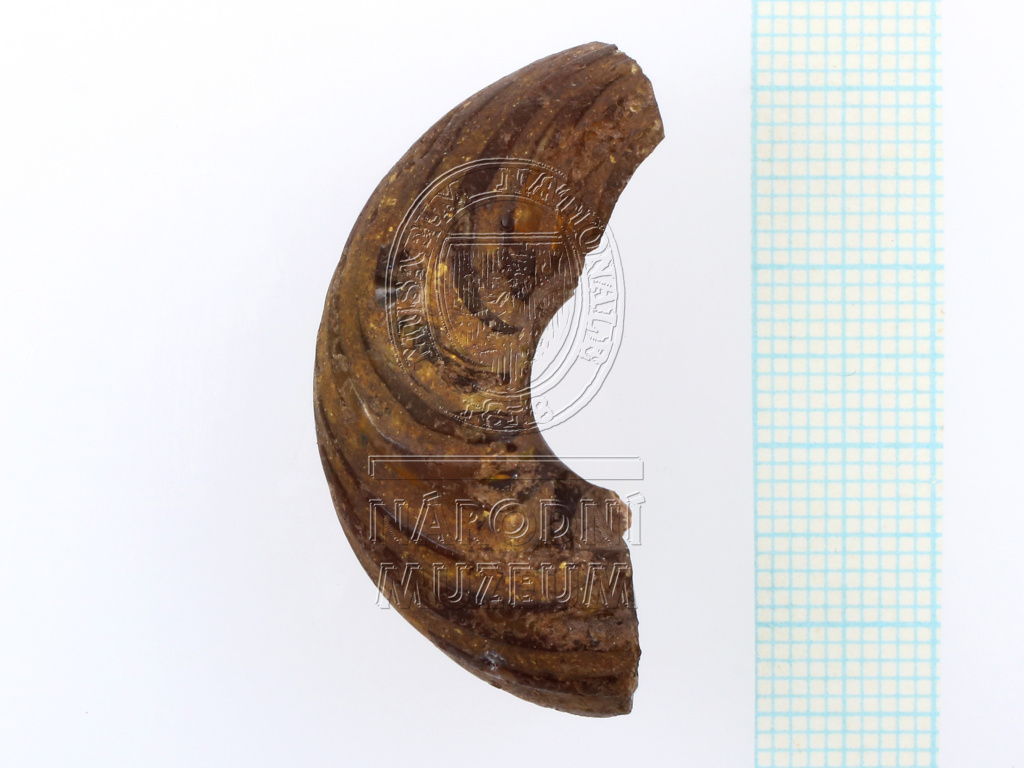 Část skleněného prsténcového korálu hnědofialové barvy různé průsvitnosti se šroubovitě kladenými širokými žlutými proužky.